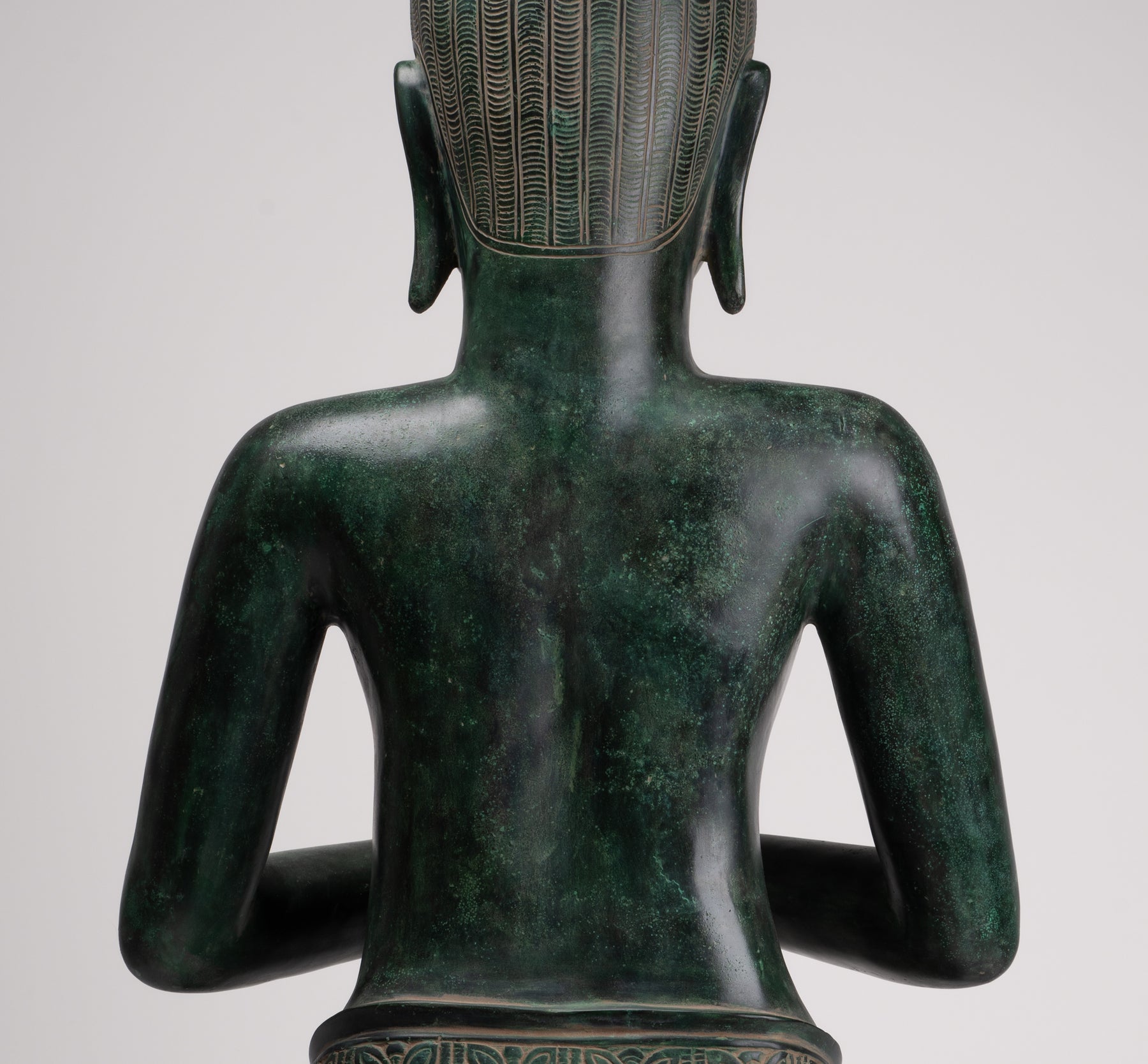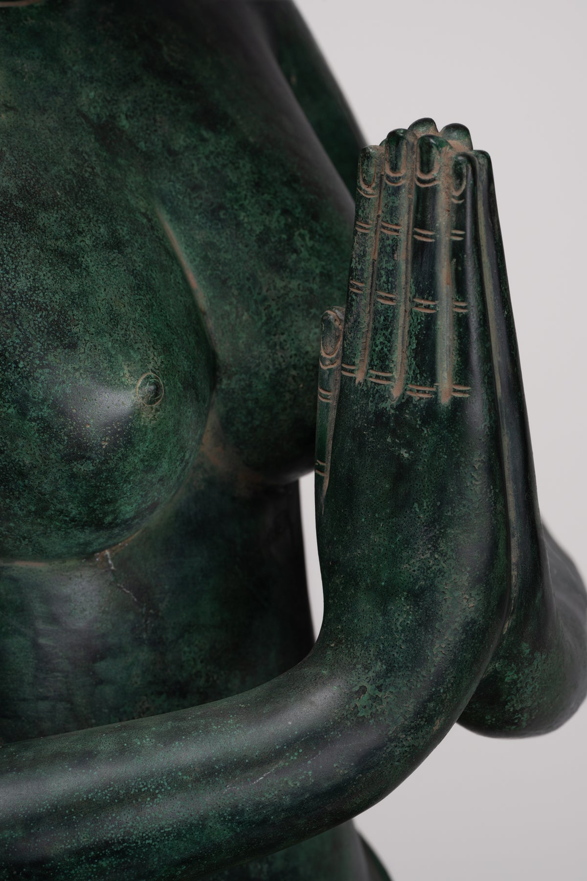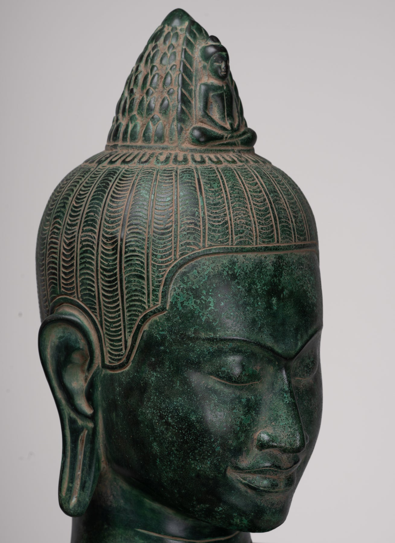 La silhouette est vêtue d'un échantillonnage, dont une extrémité forme un panneau largement plié, fabriqué à partir d'un tissu décoré d'une conception globale de formes géométriques. La ceinture en tissu a des conceptions géométriques assorties. Les traits faciaux sont délicats et affichent une expression spirituelle. Les jantes intérieures des oreilles sont magnifiquement festonnées. Conformément à sa nature ascétique et pieuse, ses oreilles ne sont pas percées pour contenir des bijoux somptueux.La patine de malachite noire et les détails de cette pièce sont particulièrement attrayants. Cette pièce en apparence traditionnelle en apparence ajoutera à coup sûr une touche unique à n'importe quelle pièce de votre maison ou lieu de travail.