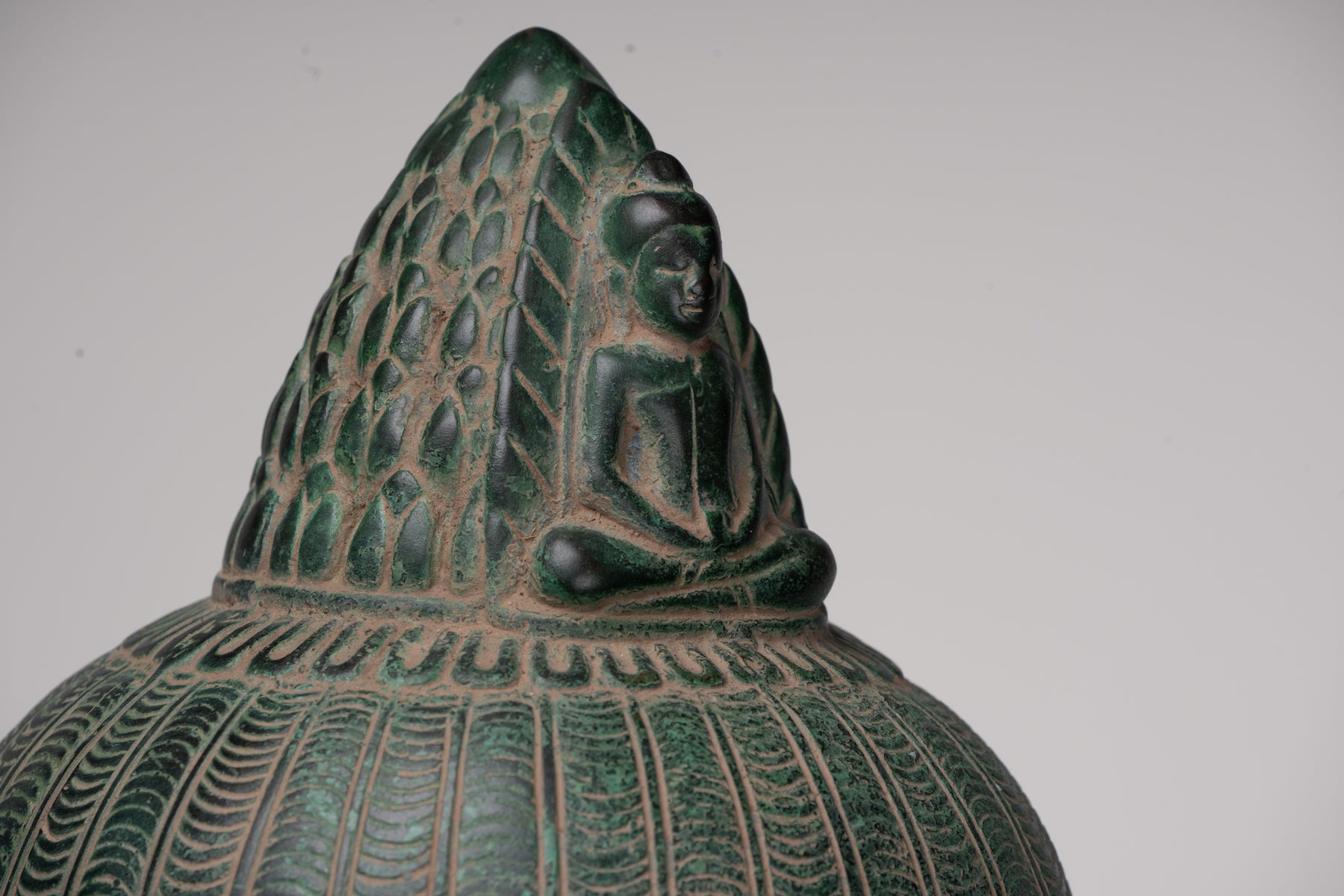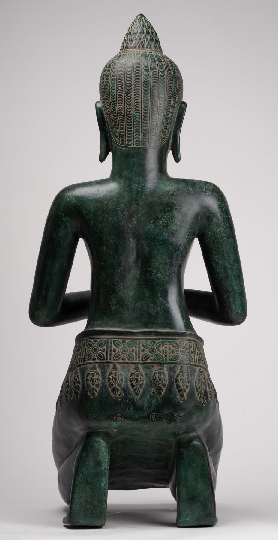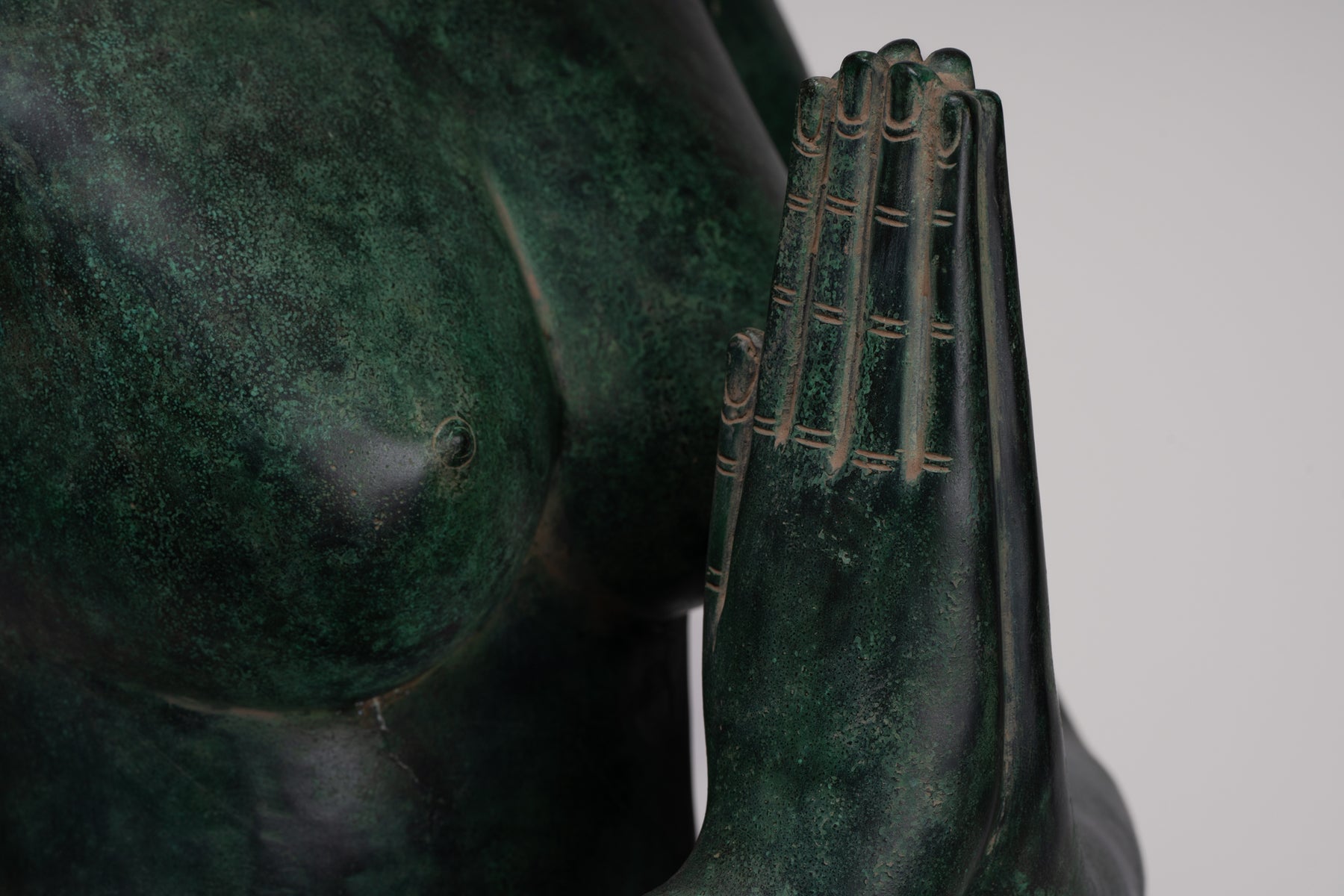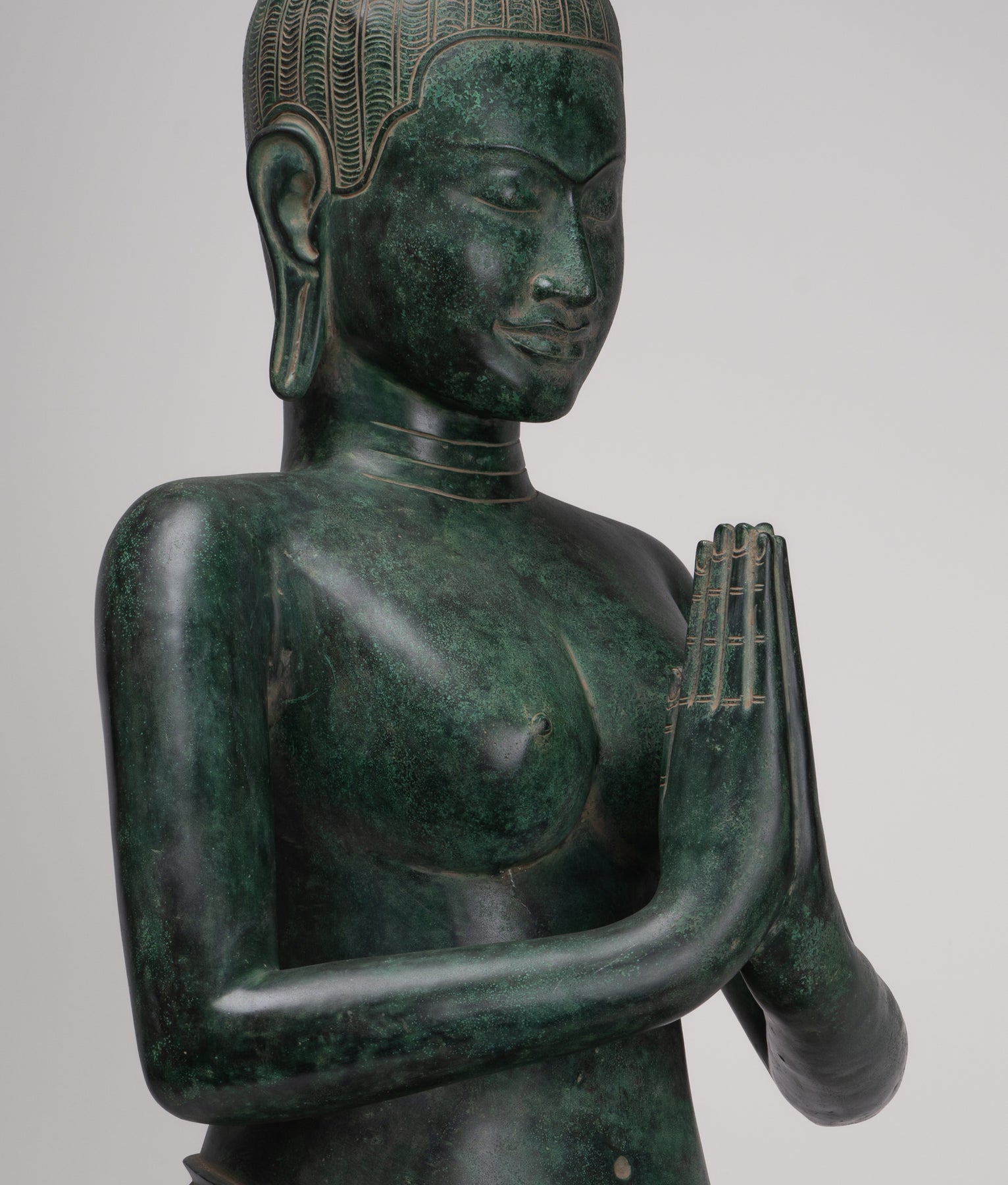 La silhouette est vêtue d'un échantillonnage, dont une extrémité forme un panneau largement plié, fabriqué à partir d'un tissu décoré d'une conception globale de formes géométriques. La ceinture en tissu a des conceptions géométriques assorties. Les traits faciaux sont délicats et affichent une expression spirituelle. Les jantes intérieures des oreilles sont magnifiquement festonnées. Conformément à sa nature ascétique et pieuse, ses oreilles ne sont pas percées pour contenir des bijoux somptueux.La patine de malachite noire et les détails de cette pièce sont particulièrement attrayants. Cette pièce en apparence traditionnelle en apparence ajoutera à coup sûr une touche unique à n'importe quelle pièce de votre maison ou lieu de travail.