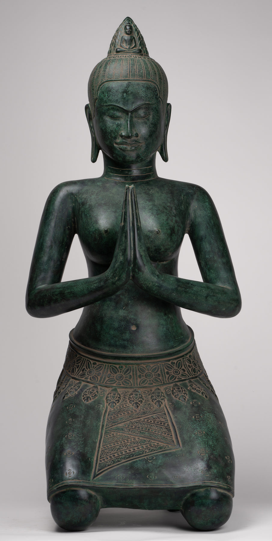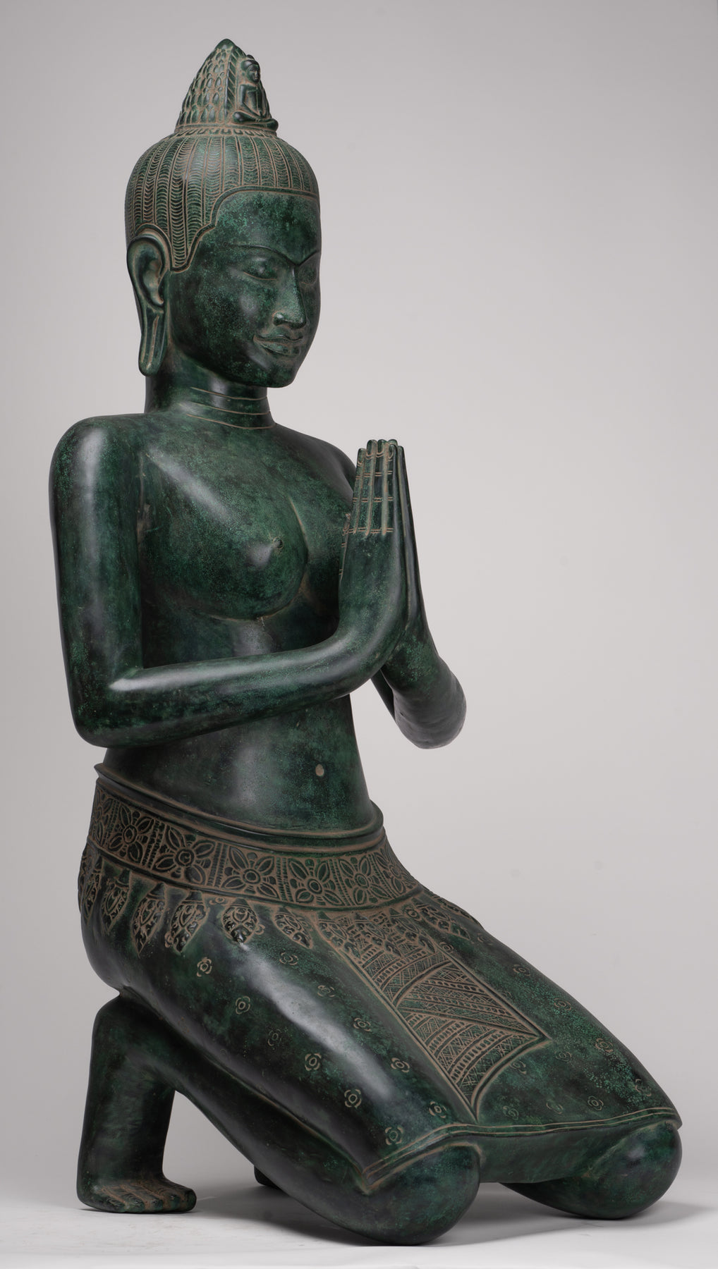 On pense que cette personnalité pieuse à genoux représente l'apparition physique de la reine Jayarajadevi, la première épouse et bien-aimée de Jayavarman VII (r. 1181-c. 12183), sous forme de prajnaparamita. De nombreuses versions de cette image ont été trouvées dans les ruines du temple tout au long Cambodge, et plusieurs autres exemples sans provenance orner les collections publiques et privées du monde entier. Aucun n'est identique, mais affiche des différences mineures, comme on pourrait s'y attendre avec des images qui semblent avoir été produites en quantité pour satisfaire une demande contemporaine.