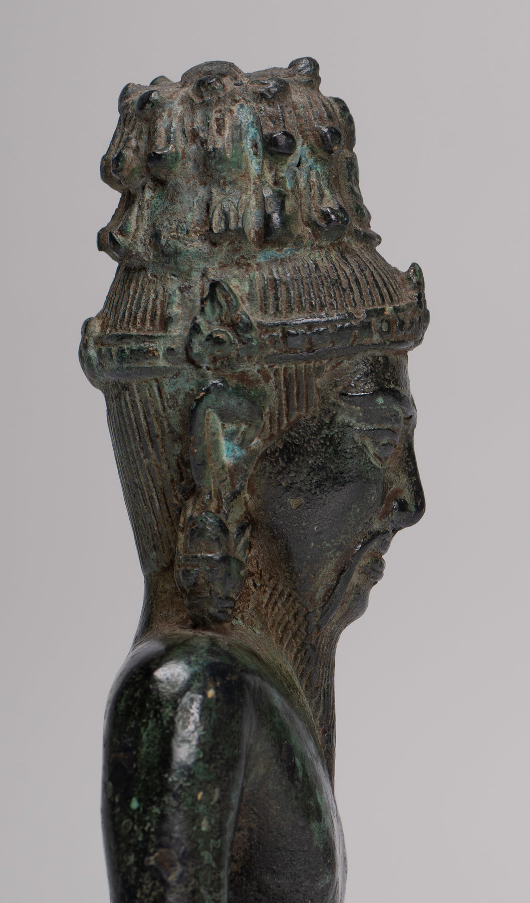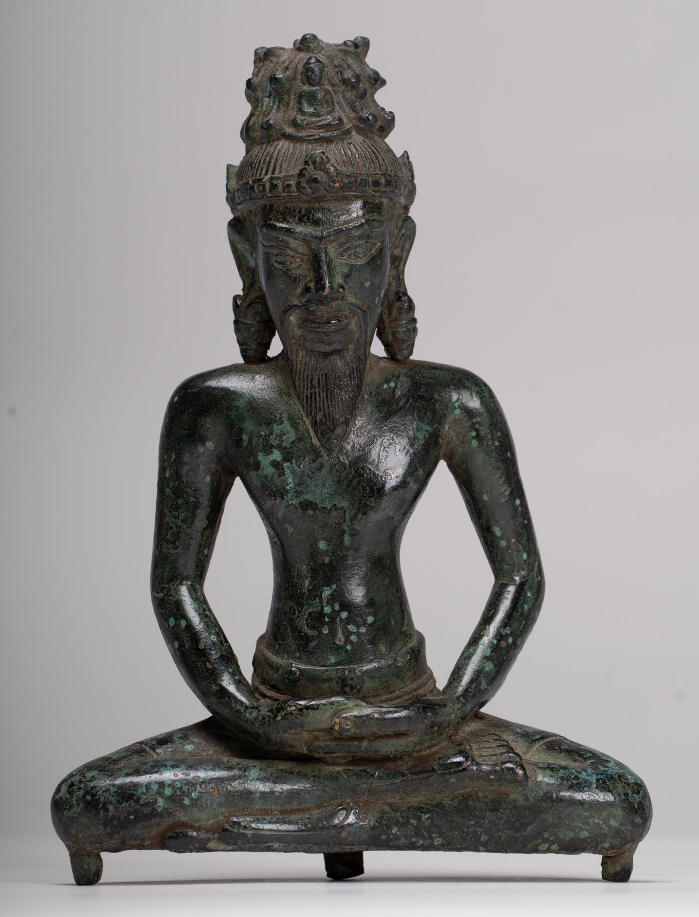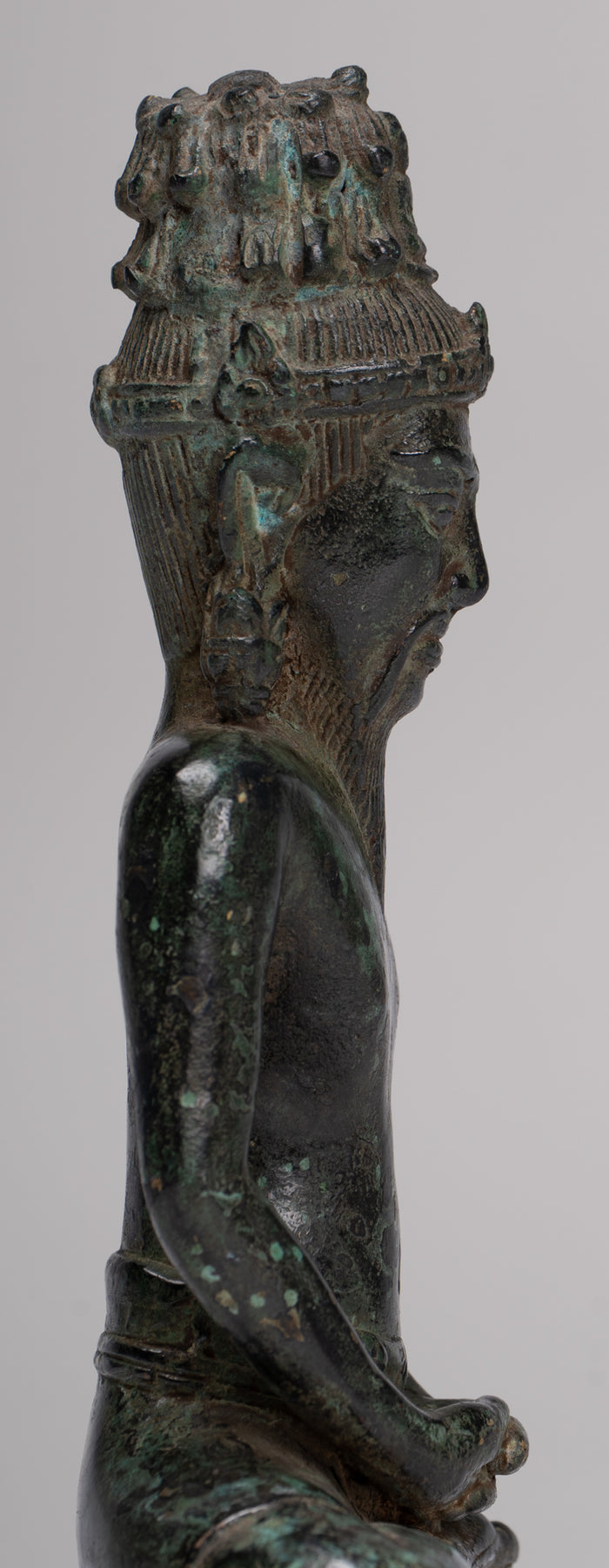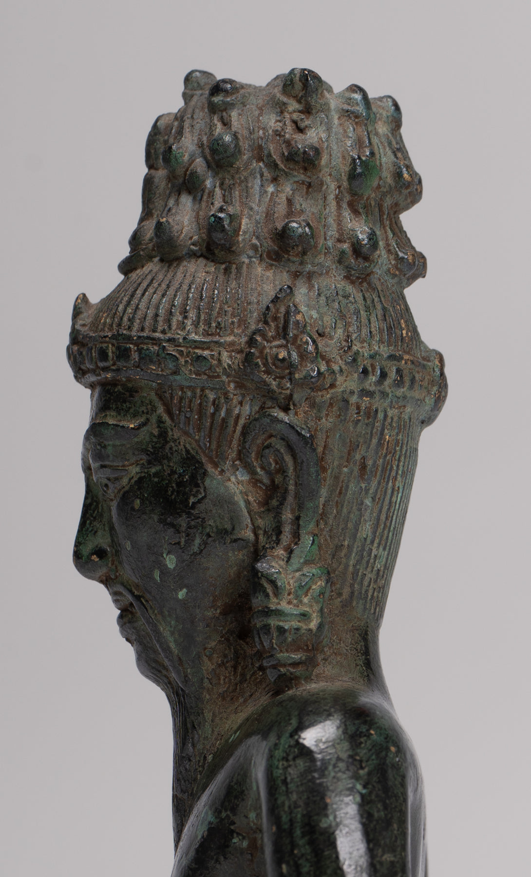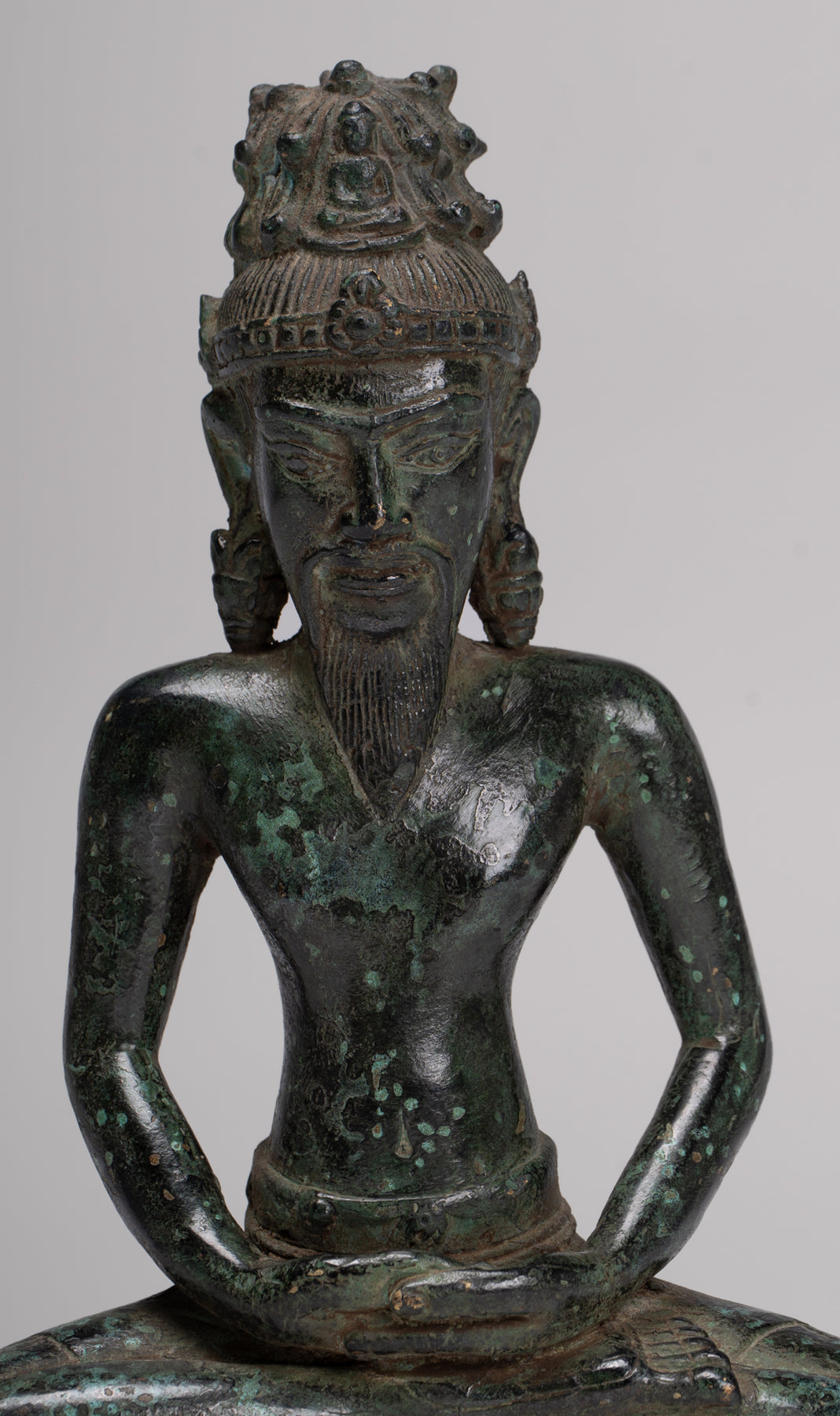 Le visage avec des caractéristiques sages est surmontée d'une coiffure cylindrique ornée d'un Bouddha d'Amitabha méditant.