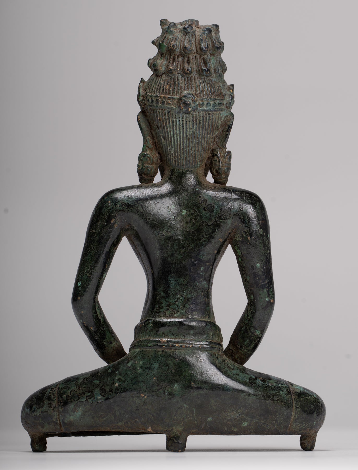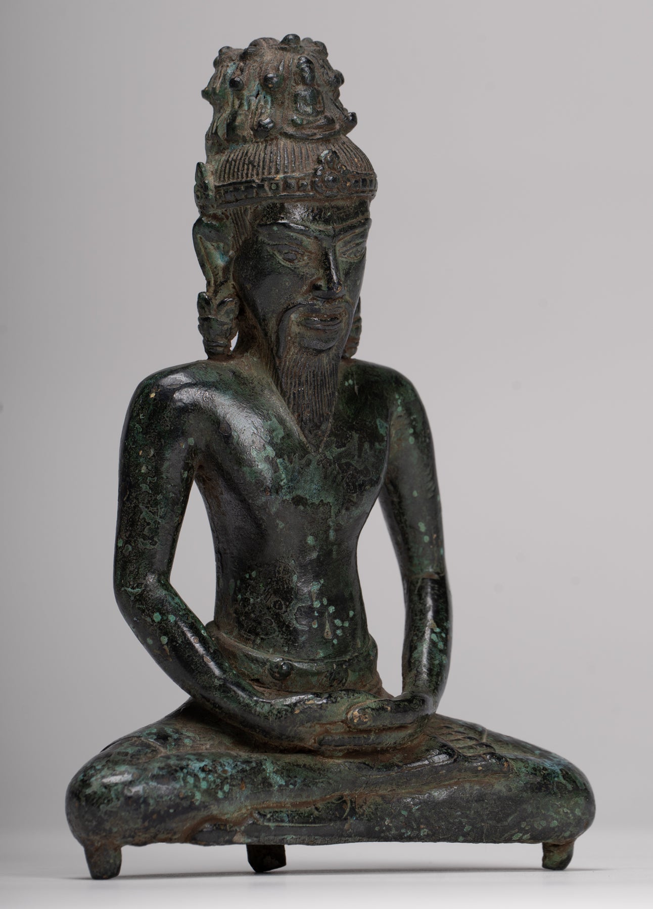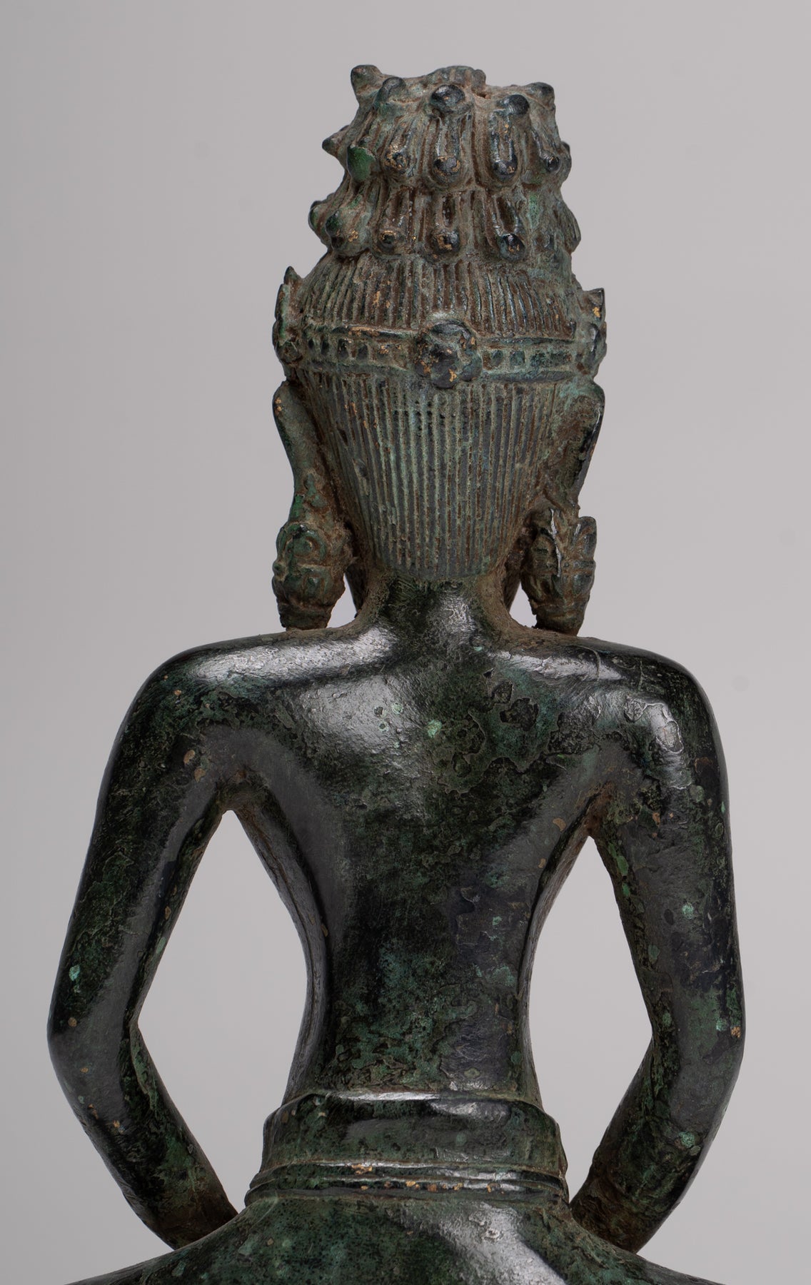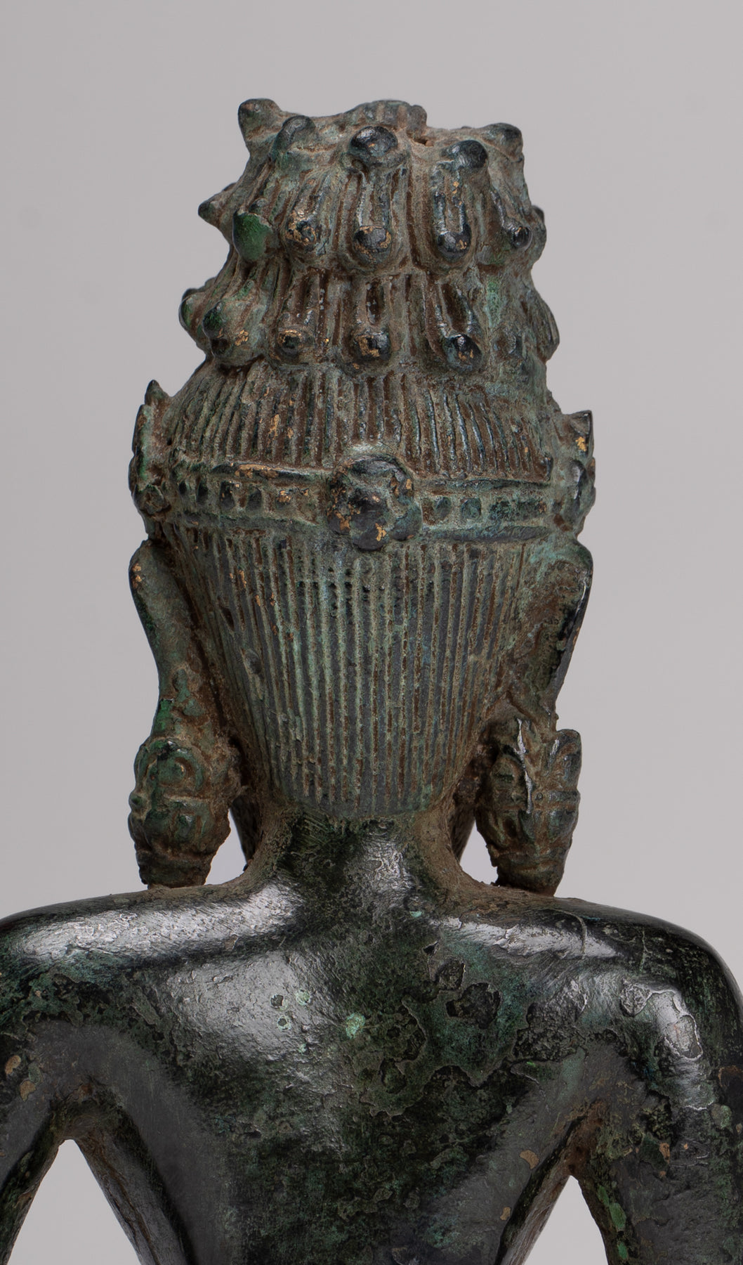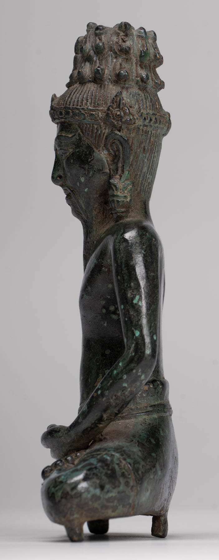 Le visage avec des caractéristiques sages est surmontée d'une coiffure cylindrique ornée d'un Bouddha d'Amitabha méditant.