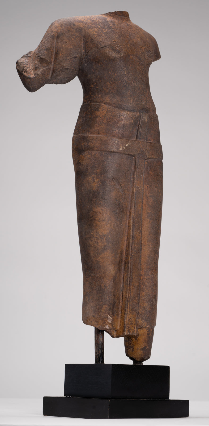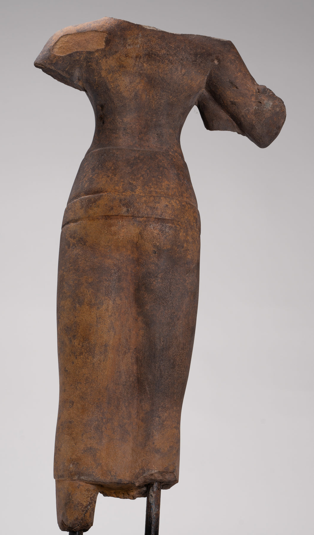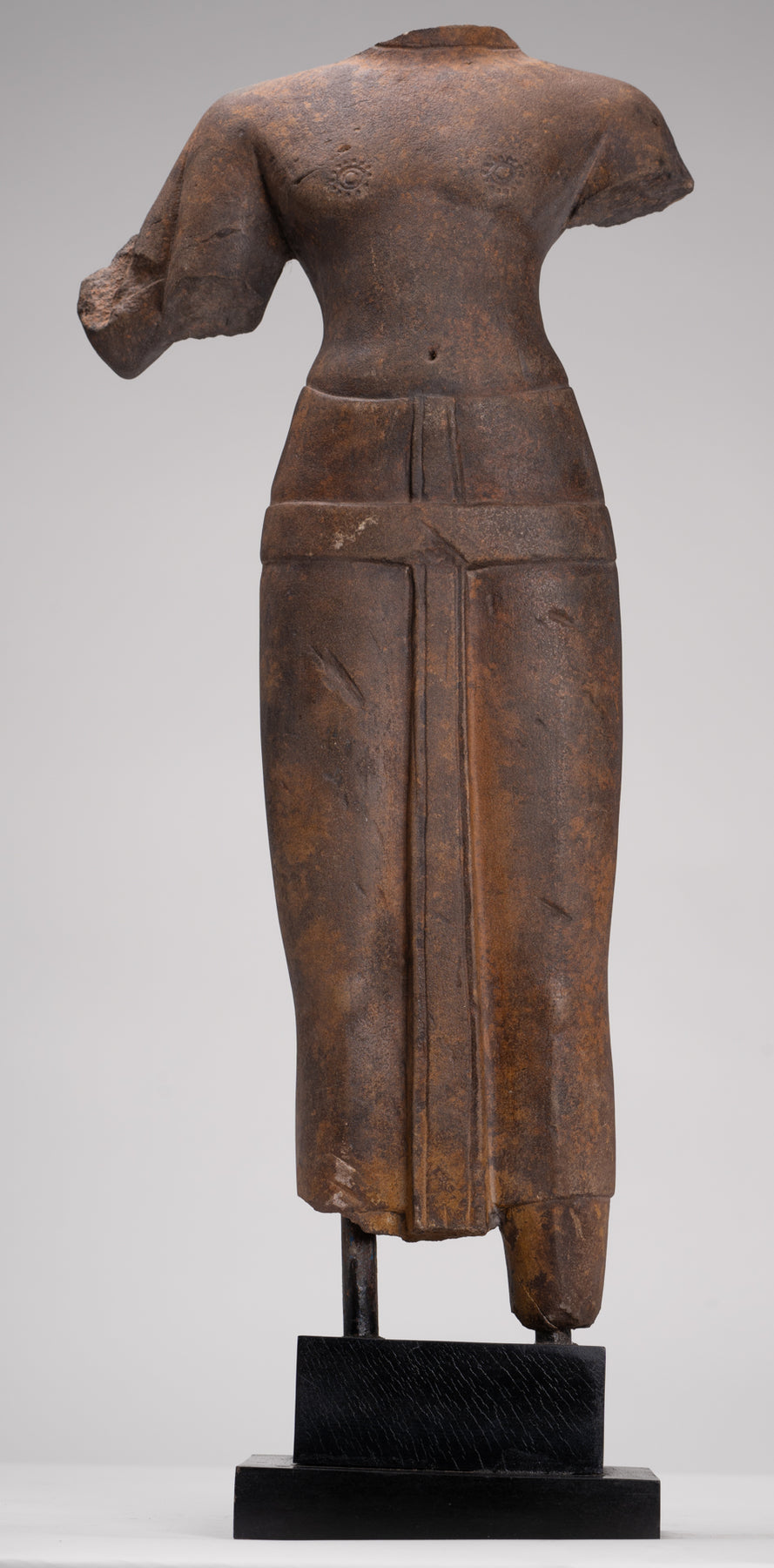 Il s'agit d'une caractéristique temporelle particulière partagée par des images de fin du septième siècle au National Museum de Phnom Penh qui portent le plus ancien Sampot et n'ont pas non plus de cheveux projetant sous la mitre, par exemple le Vishnu de Ba Sre, Angkor Borei, Takeo.Le torse Vishnu est monté sur une base de bois (plus tard).Référence savante: