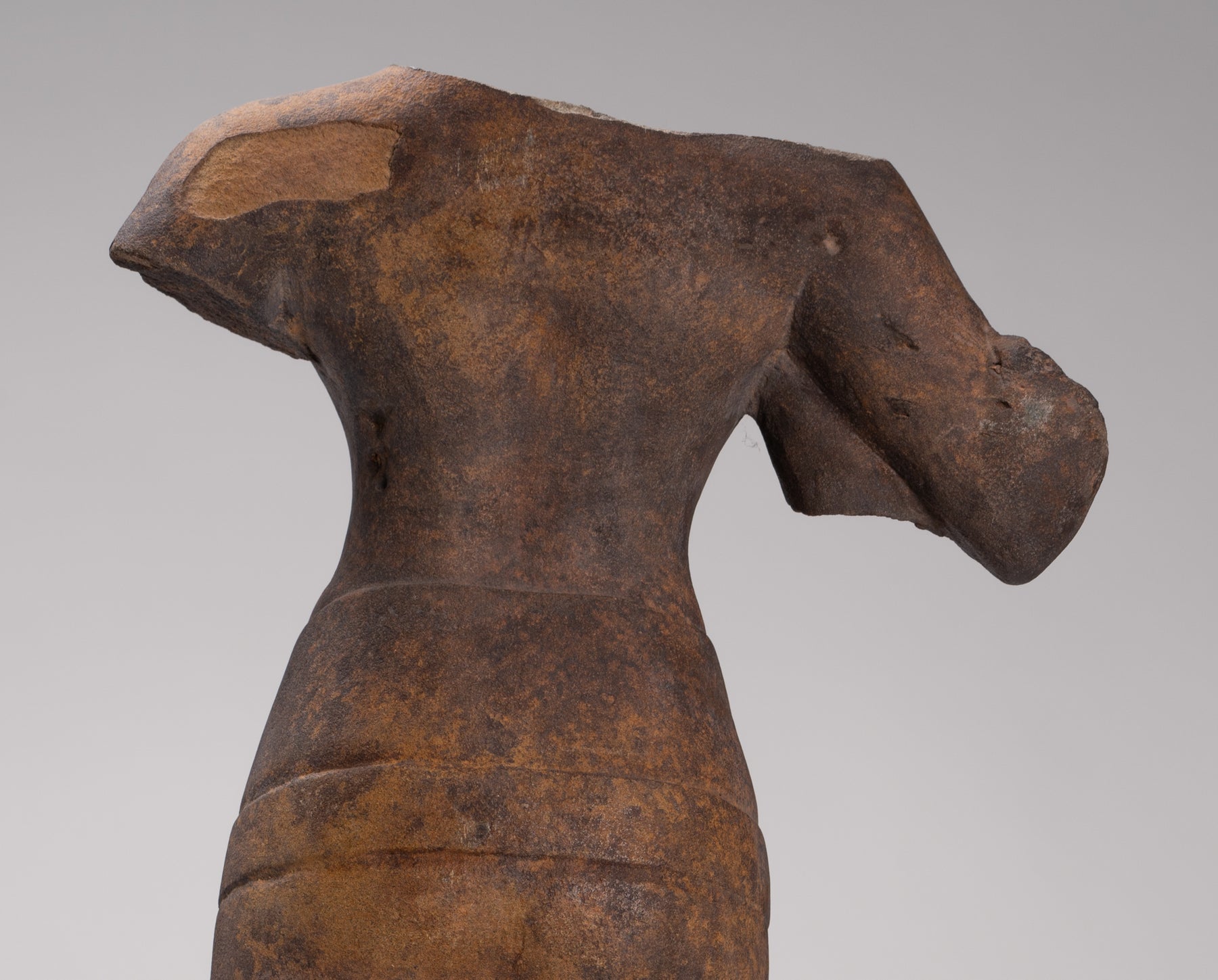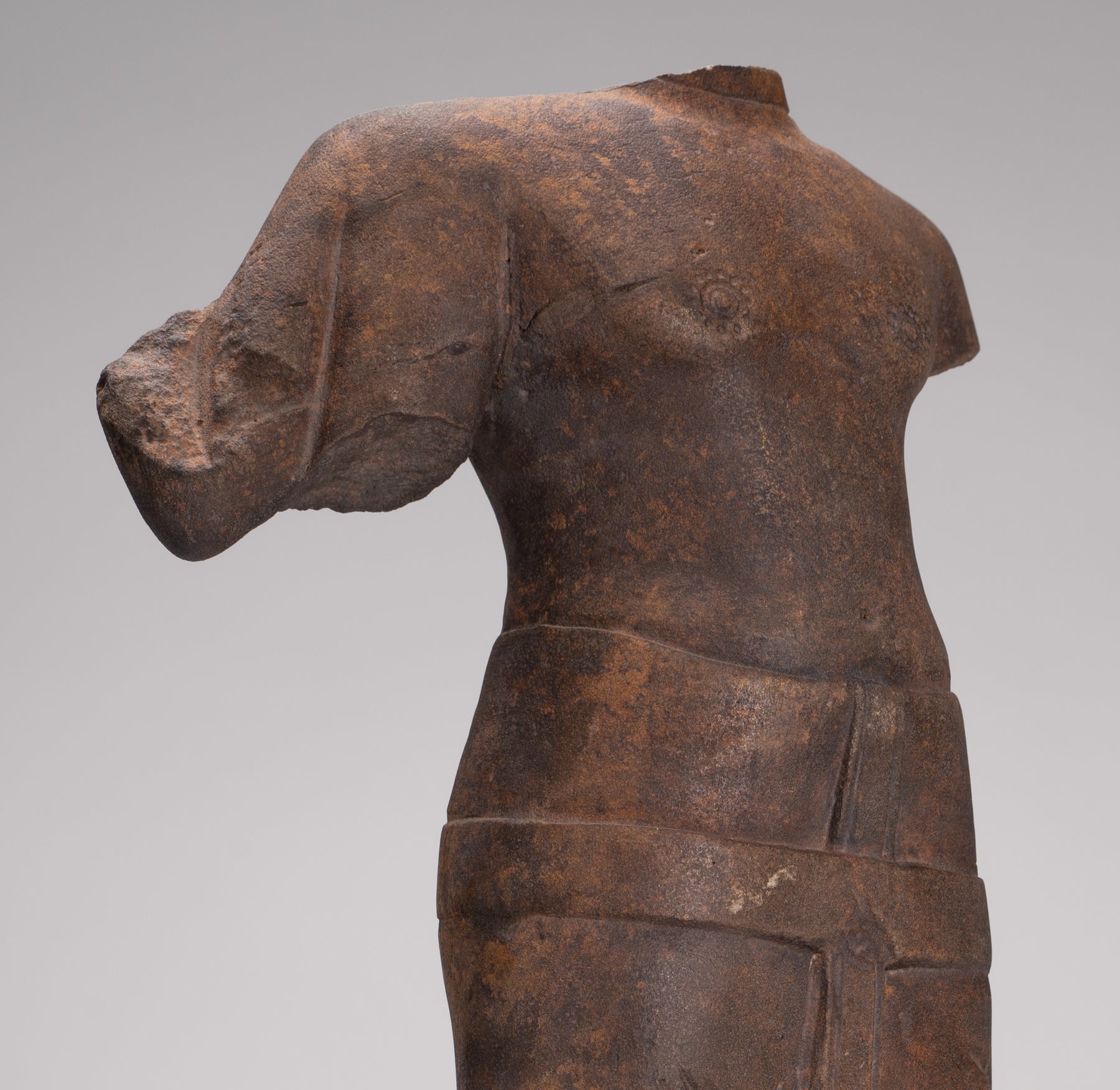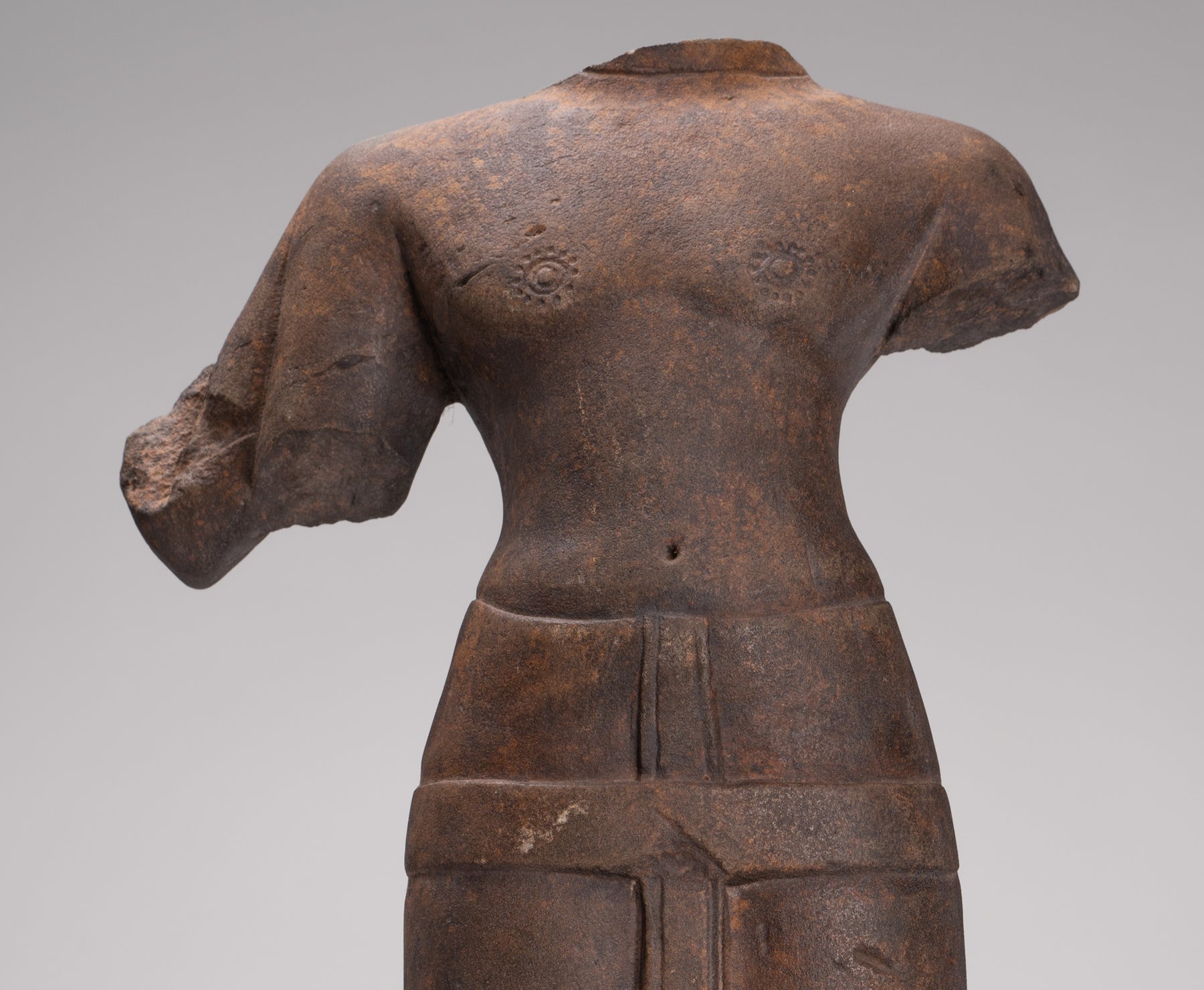 Il s'agit d'une caractéristique temporelle particulière partagée par des images de fin du septième siècle au National Museum de Phnom Penh qui portent le plus ancien Sampot et n'ont pas non plus de cheveux projetant sous la mitre, par exemple le Vishnu de Ba Sre, Angkor Borei, Takeo.Le torse Vishnu est monté sur une base de bois (plus tard).Référence savante: