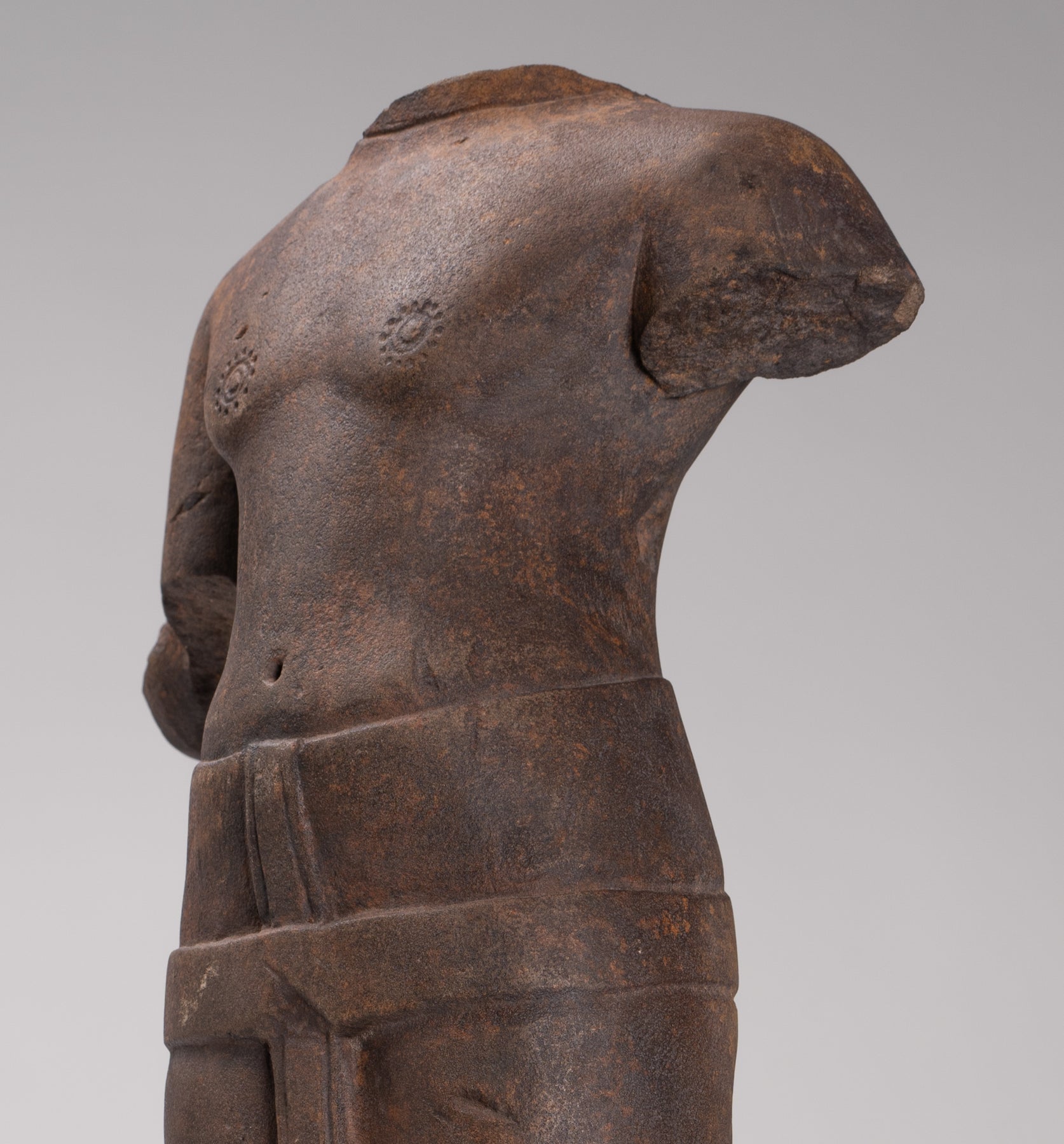 Un style phnom da antique du début du 7ème siècle, grès brun, sculpture de Vishnu, la divinité indic de la création. Le conservateur hindou divin et protecteur de la vie humaine, un rôle qui a fourni des analogies naturelles avec la royauté terrestre pour le Khmer.Cette image musculaire de Vishnu est représentée Samabhanga debout, à jambes droites, sur une base rectangulaire. L'image est sculptée dans le tour avec le dos aussi soigneusement sculpté que l'avant. L'image porte une mitre élevée et un long échantillonnage collant noué à la taille qui révèle son corps puissant et musclé au-dessus.