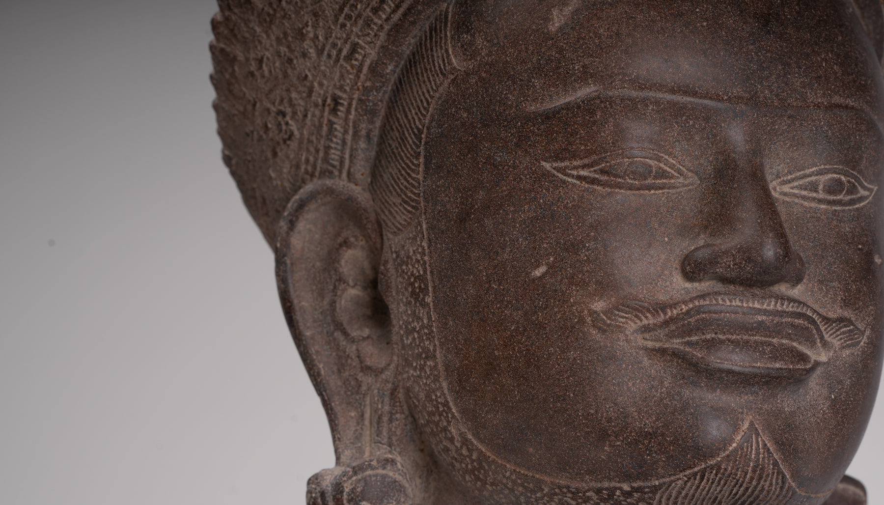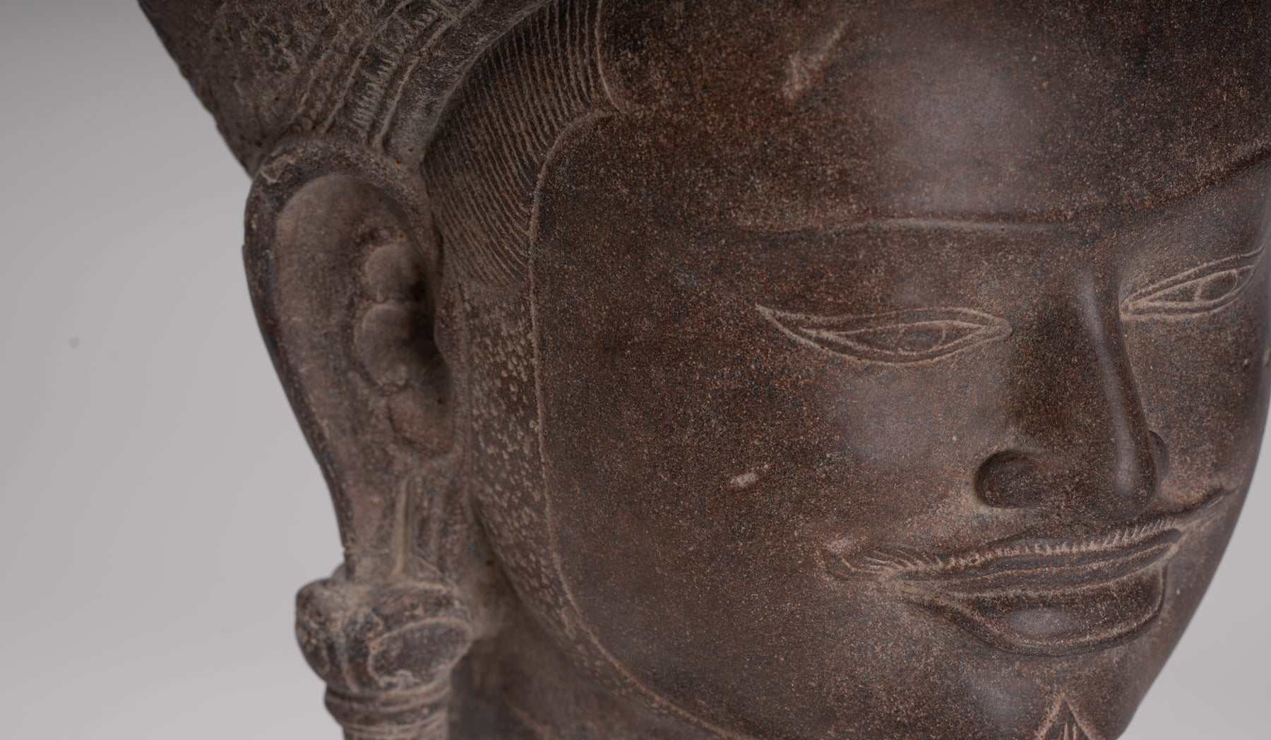 Comme c'est typique du style Banteay Srei, la silhouette générale est plus lourde. La sculpture est magnifique comme vous pouvez le voir dans les beaux détails du visage. Les détails sont parfaitement rendus. Les caractéristiques suggèrent que le prana, ou souffle intérieur, qui signifie la puissance surhumaine. La plénitude des formes donne au visage une douceur qui accentue les yeux ouverts et les lèvres charnues et sensuelles. L'anatomie montre un fort sentiment d'observation.
