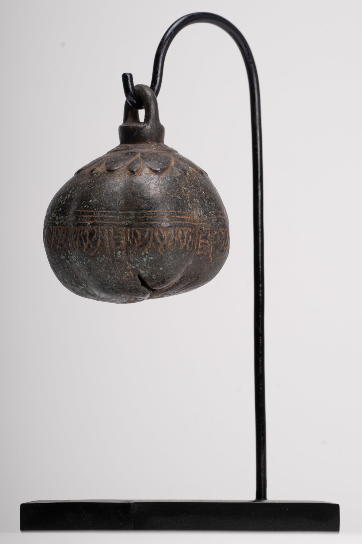 La cloche ronde est moulée en forme de fleur de lotus et surmonté d'un anneau de suspension en boucle.