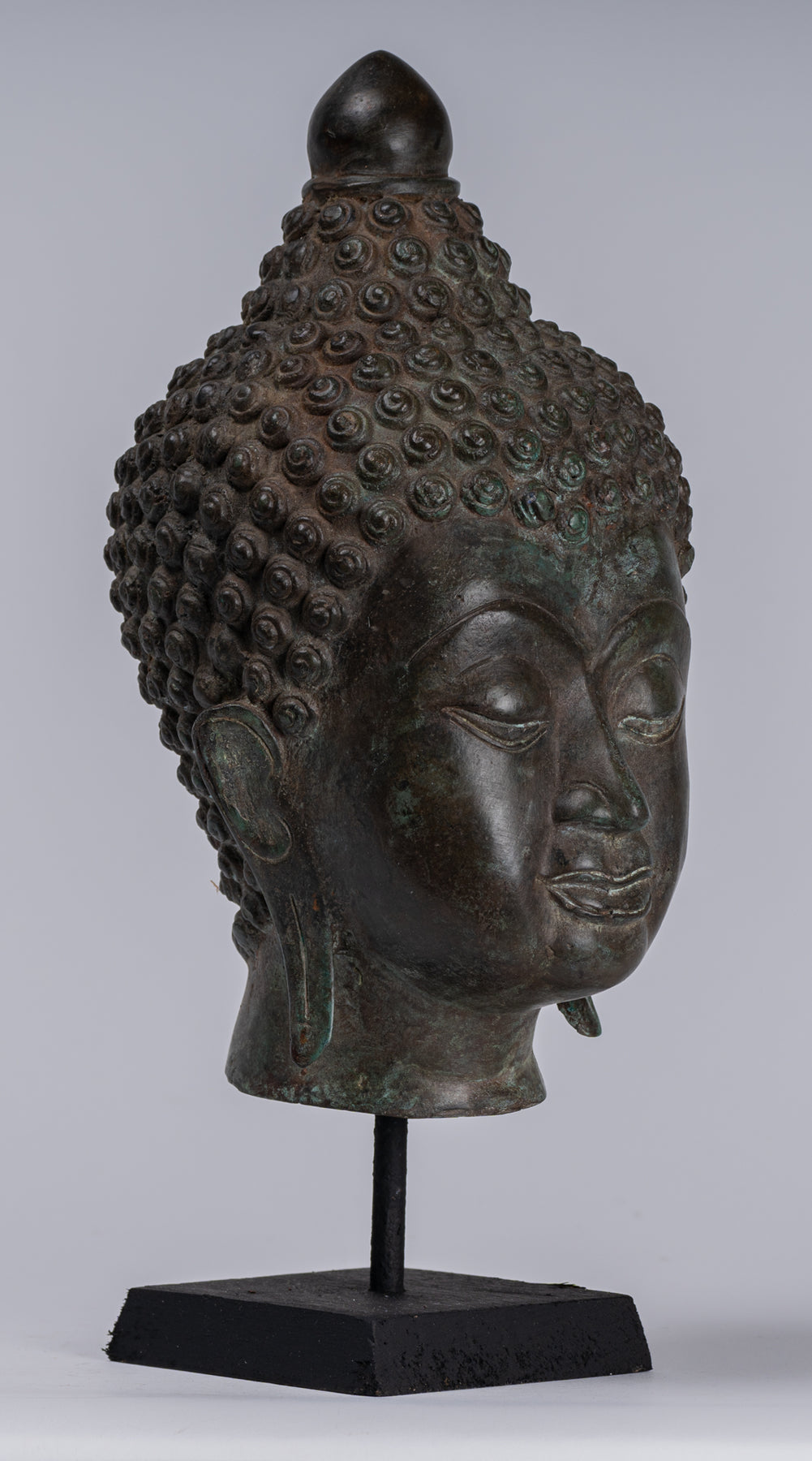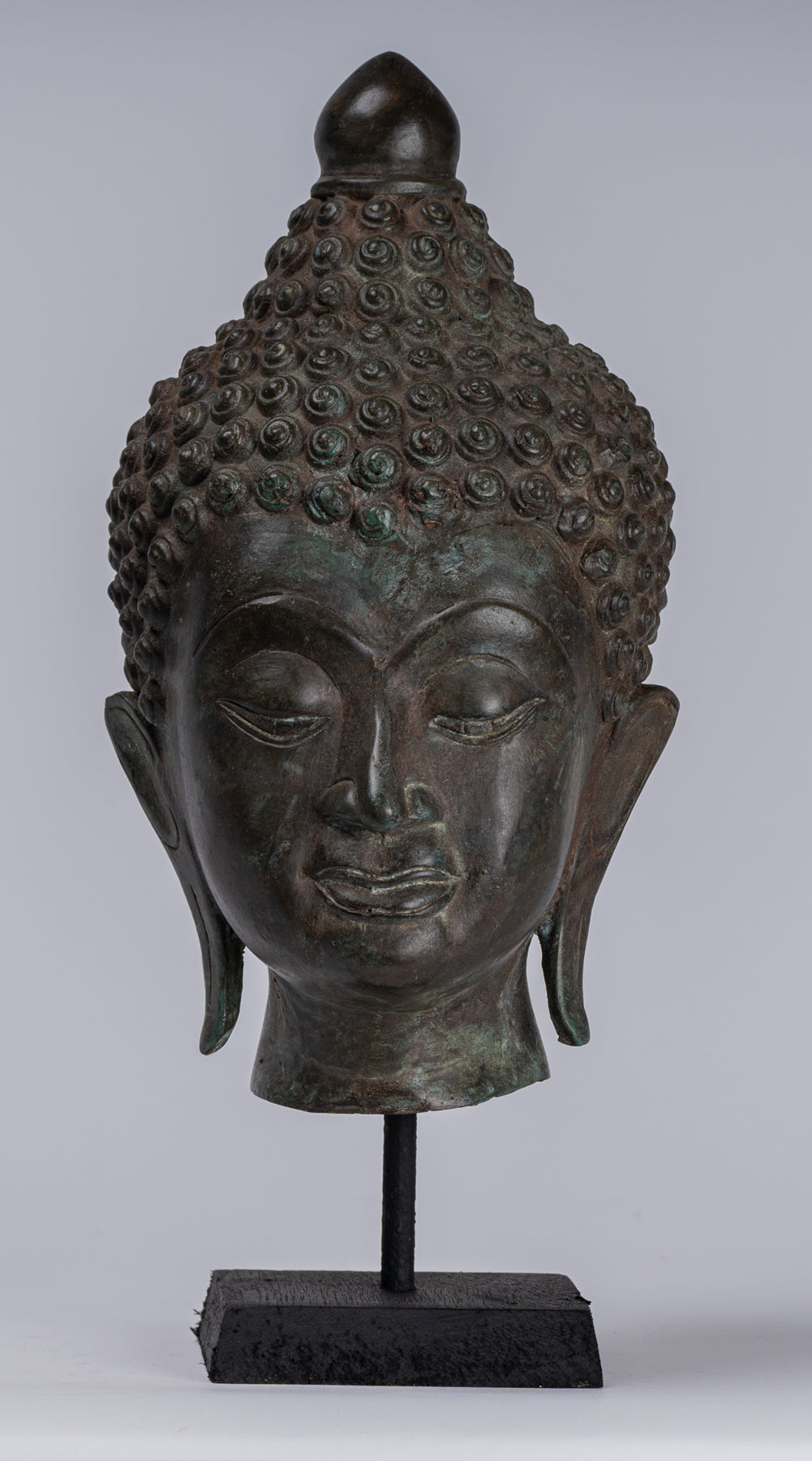 Buddha Head - Antique Thai Style Chiang Saen Mounted Bronze Buddha Head - 33cm/13"