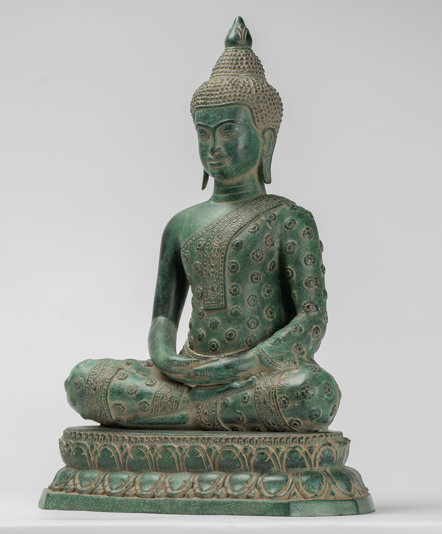 Un Bouddha de méditation de style khmer antique. Le Bouddha a un visage paisible avec des yeux introspectifs abattus et un front ferme. Le visage paisible de Lord Bouddha dégage l'harmonie.