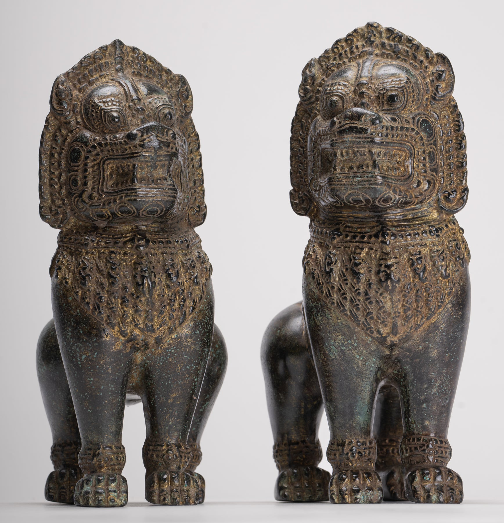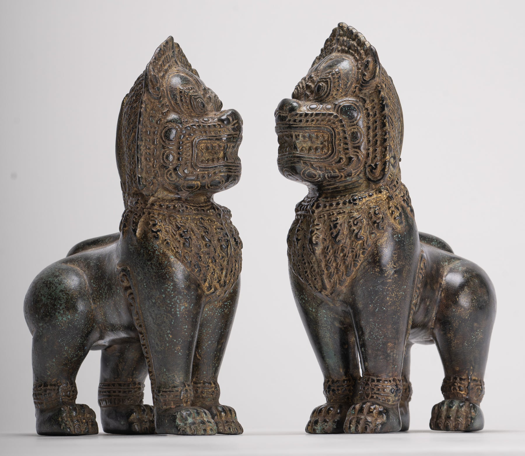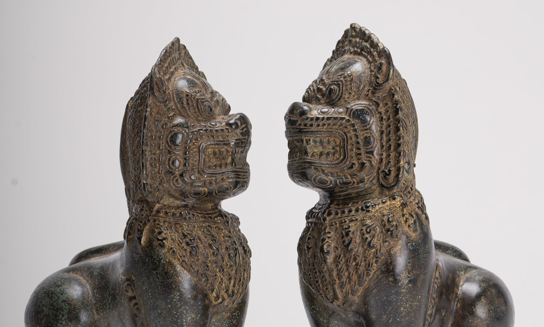 Gardien ou Lions debout en bronze de style khmer antique (paire) - 22 cm/9"