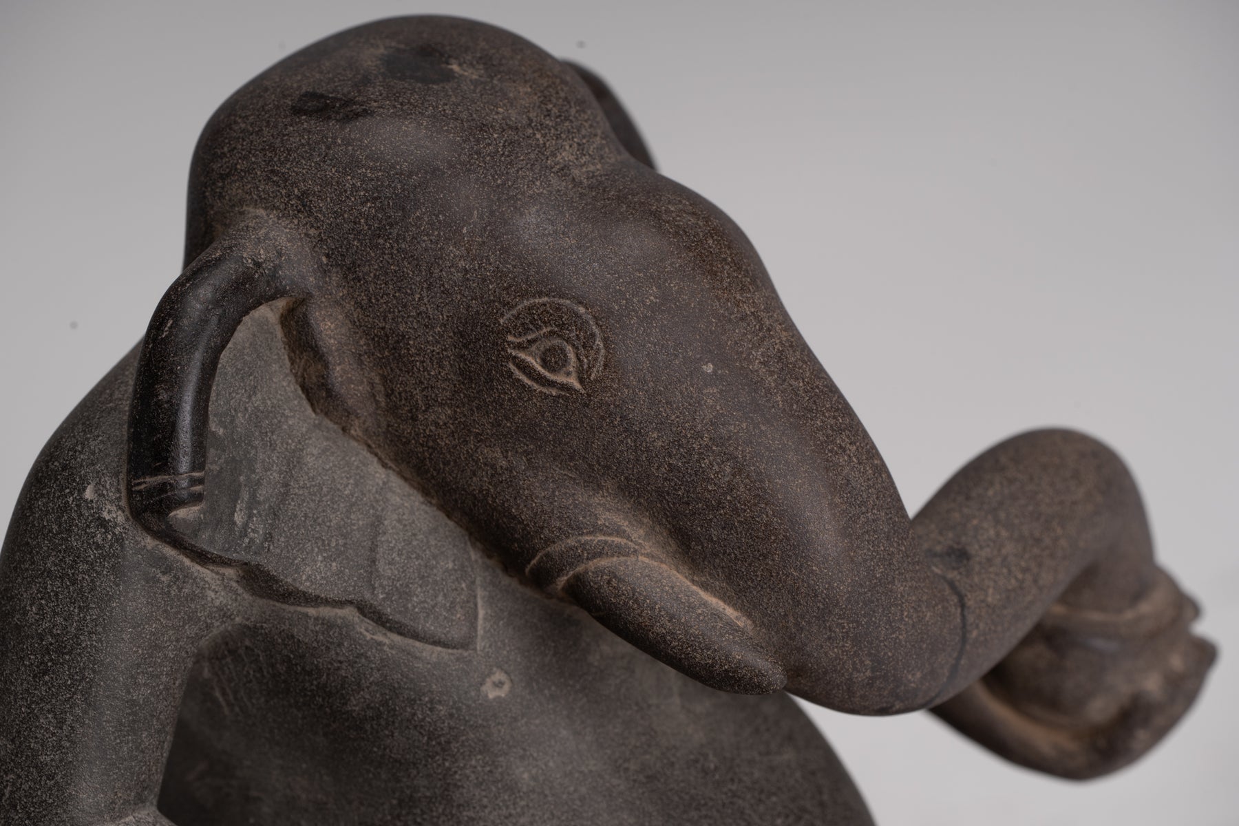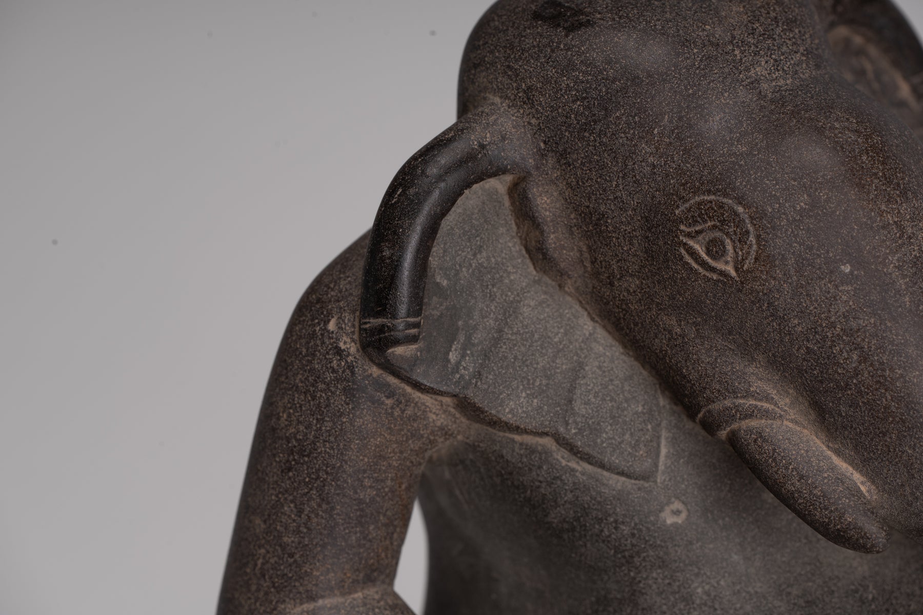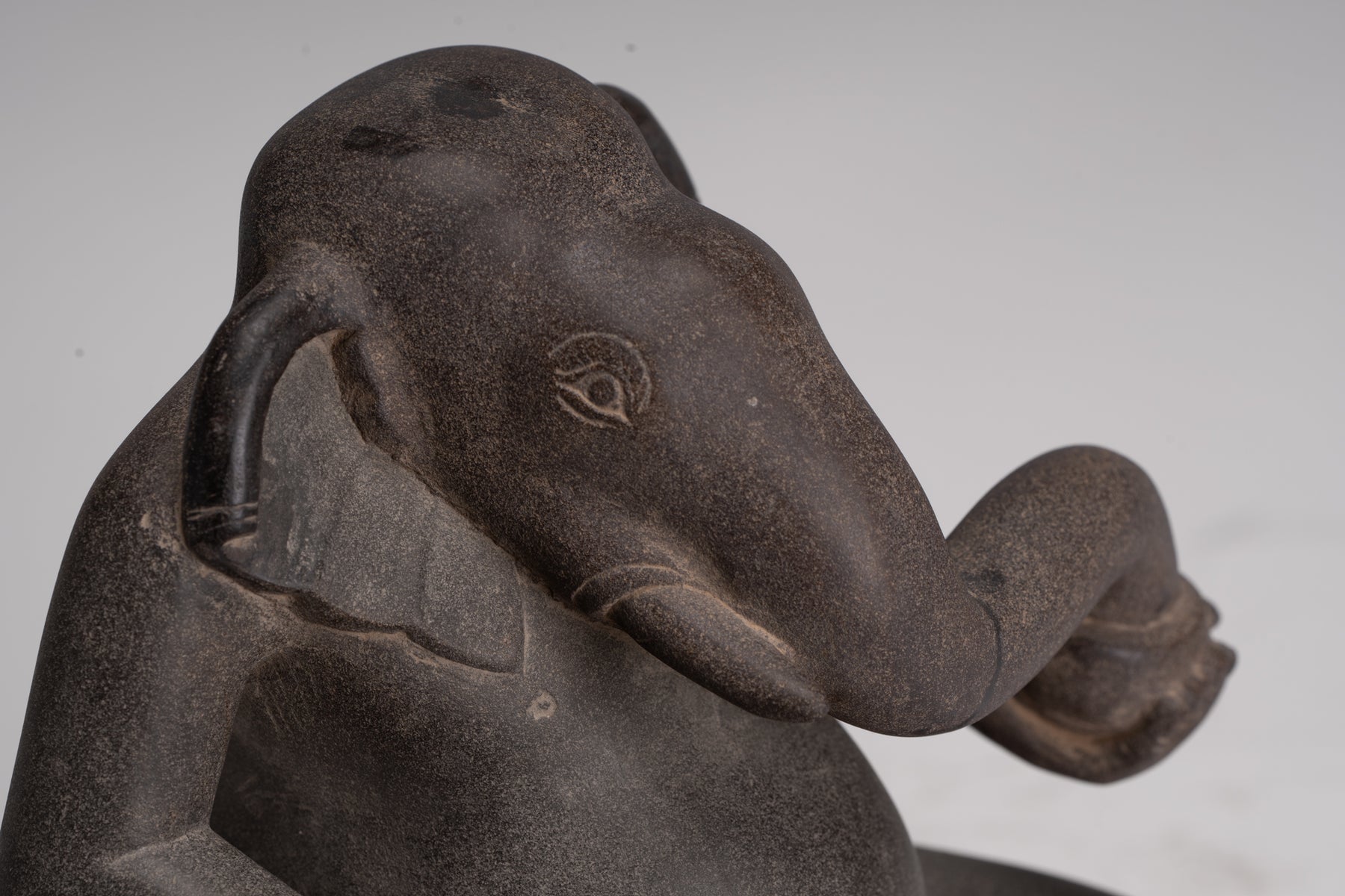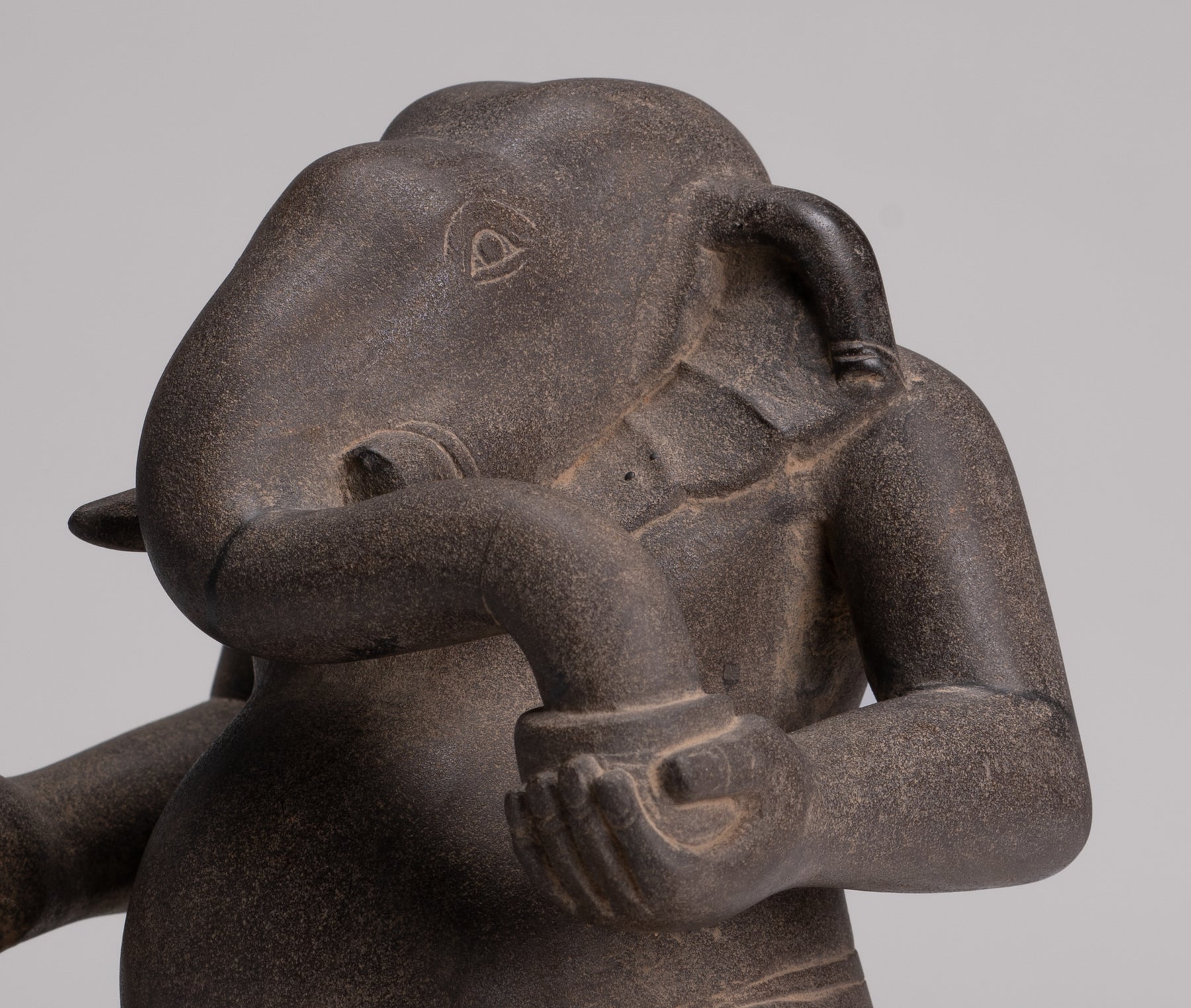 Ses caractéristiques d'éléphants sont rendues sensiblement et naturalistes et se mélangent de manière transparente dans la figure anthropomorphe en dessous. Typique, du style Cham du 8ème siècle. Une sculpture Cham rare et délicate de Ganesha.