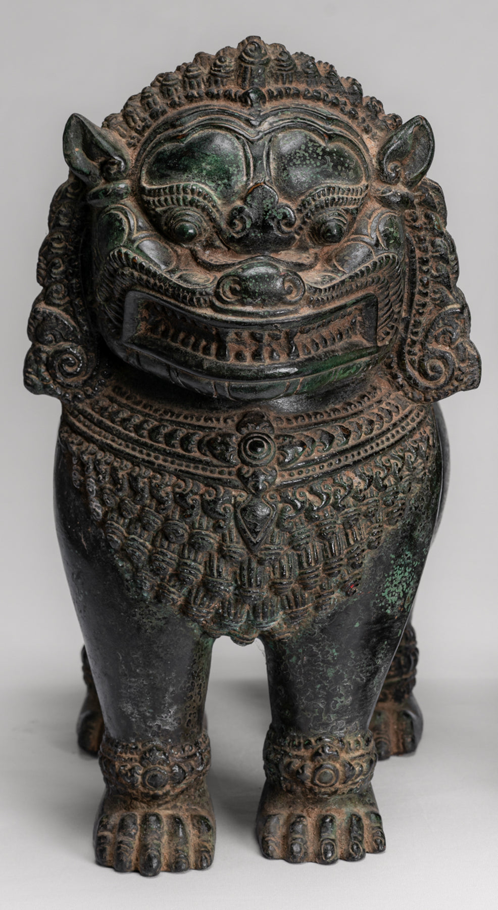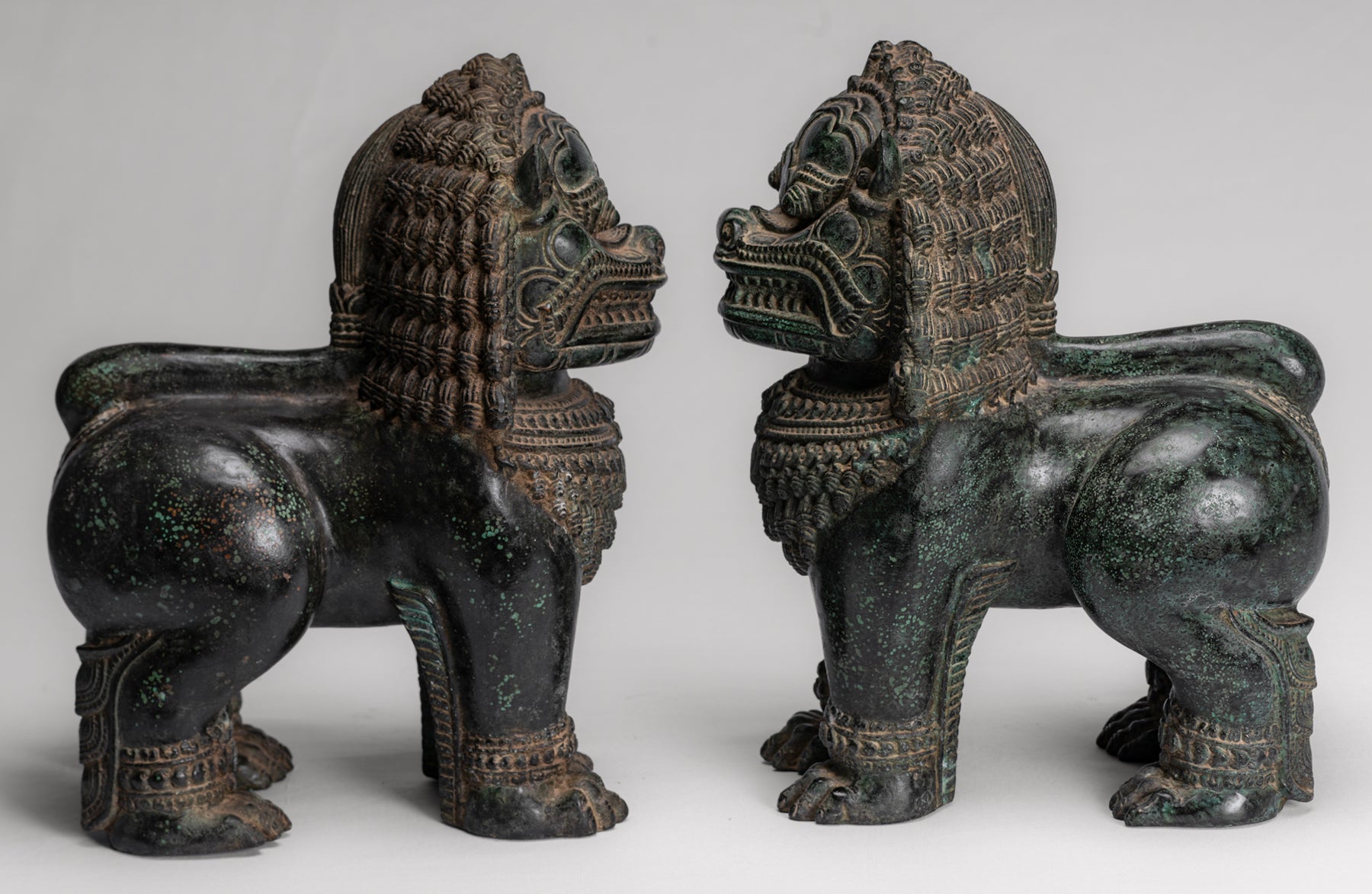 Comme avec cette imposante paire de figures de gardien de temple ou de lion de style khmer antique, dans la période pré-angkor, style du 10e siècle de Banteay Srei. Les «gardiens de la porte» sont placés autour de l'extérieur d'un temple pour servir à la fois de salutations et de défenseurs, ils étaient spécifiquement destinés à protéger les principales entrées des temples.
