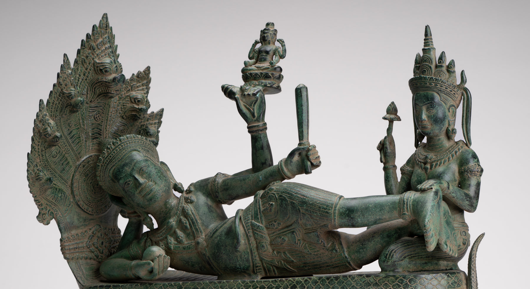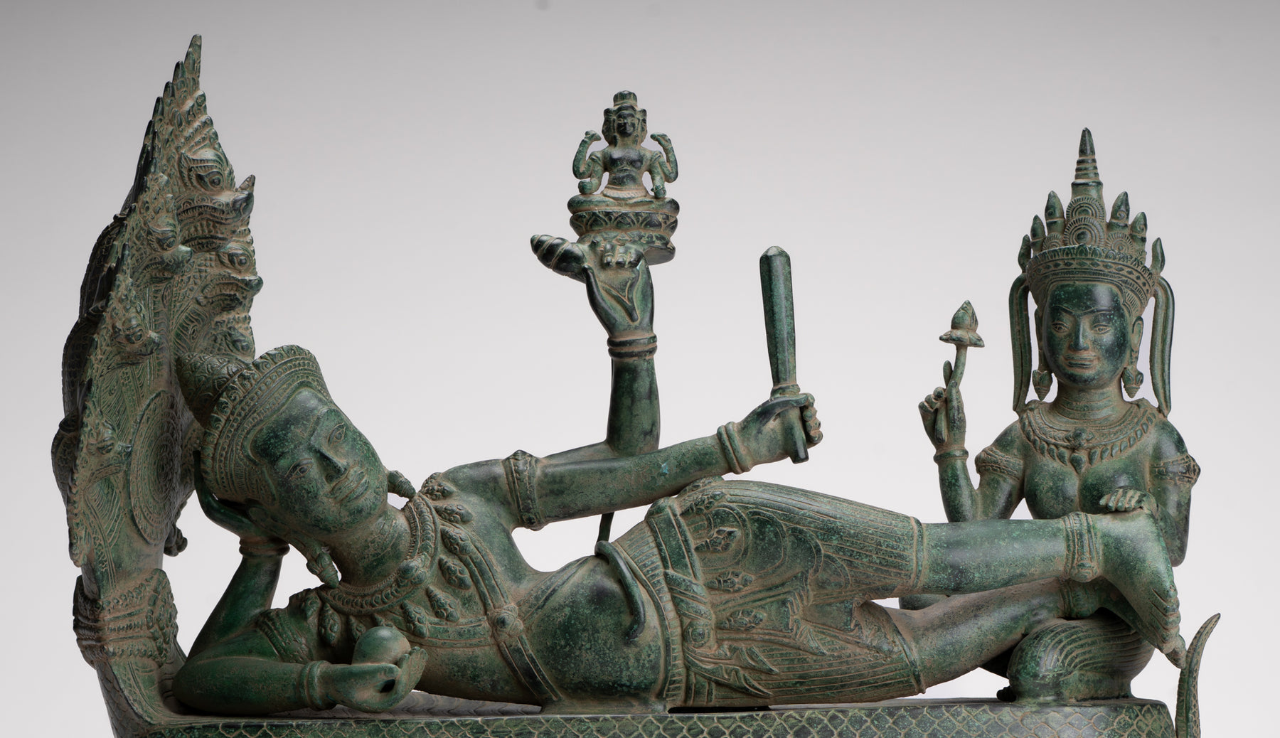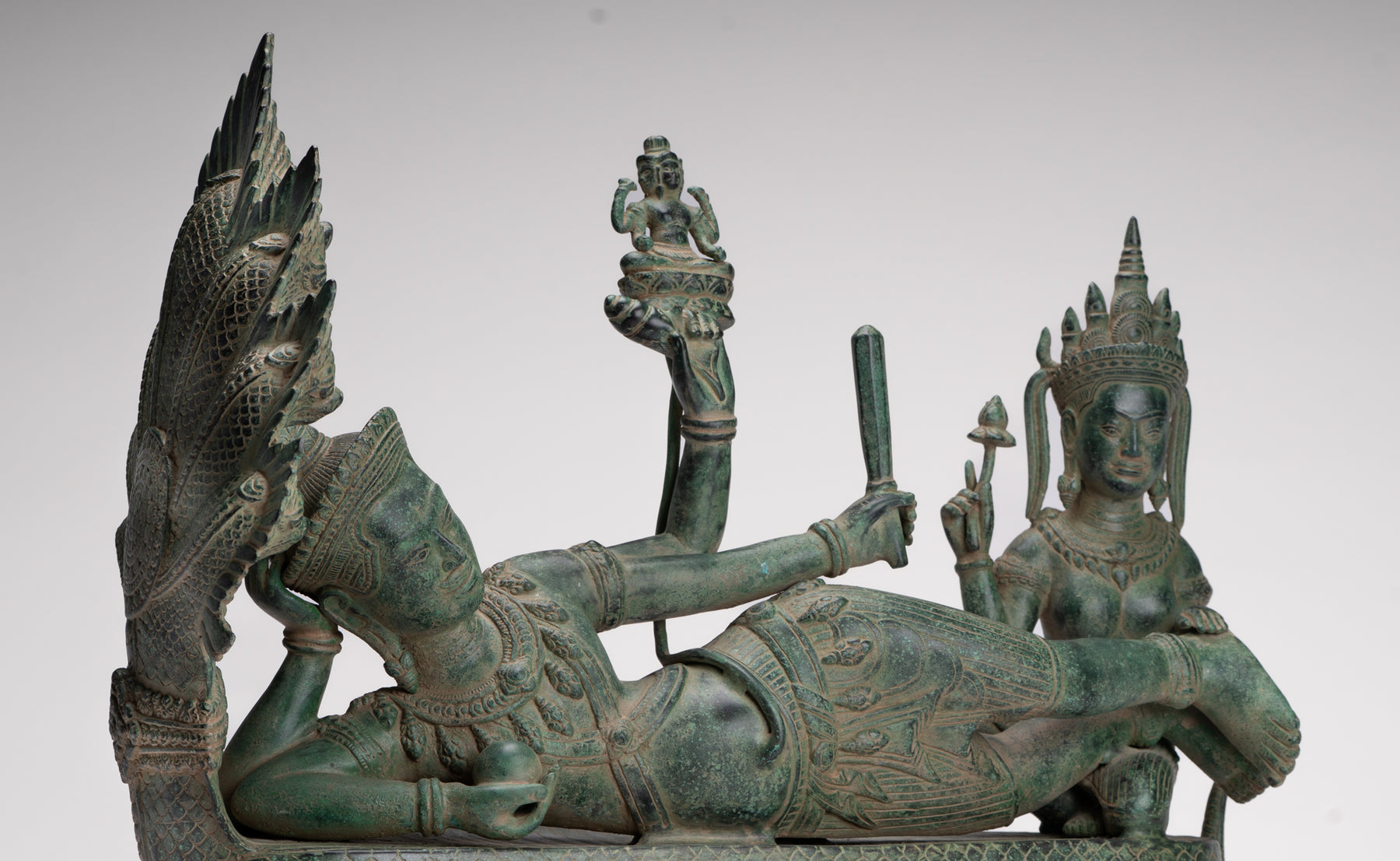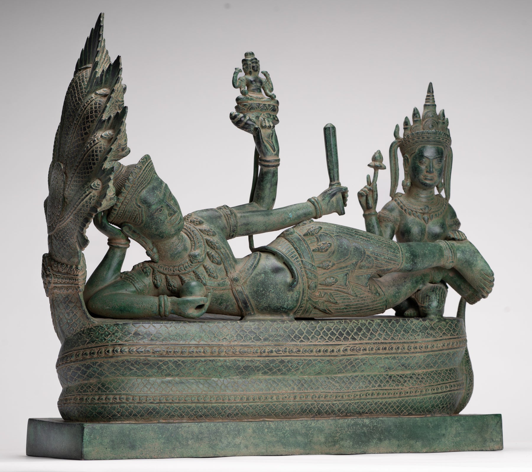 Vishnu, l'une des principales divinités de l'hindouisme, est le conservateur et le protecteur de l'univers, selon le Trimurti (la Sainte Trinité composée de Brahma le Créateur, Vishnu le conservateur, et Shiva le destructeur). Ici, Vishnu est représenté dans la pose spirituellement significative de Vishnu inclinable, également connu sous le nom Anantasayana Vishnu.