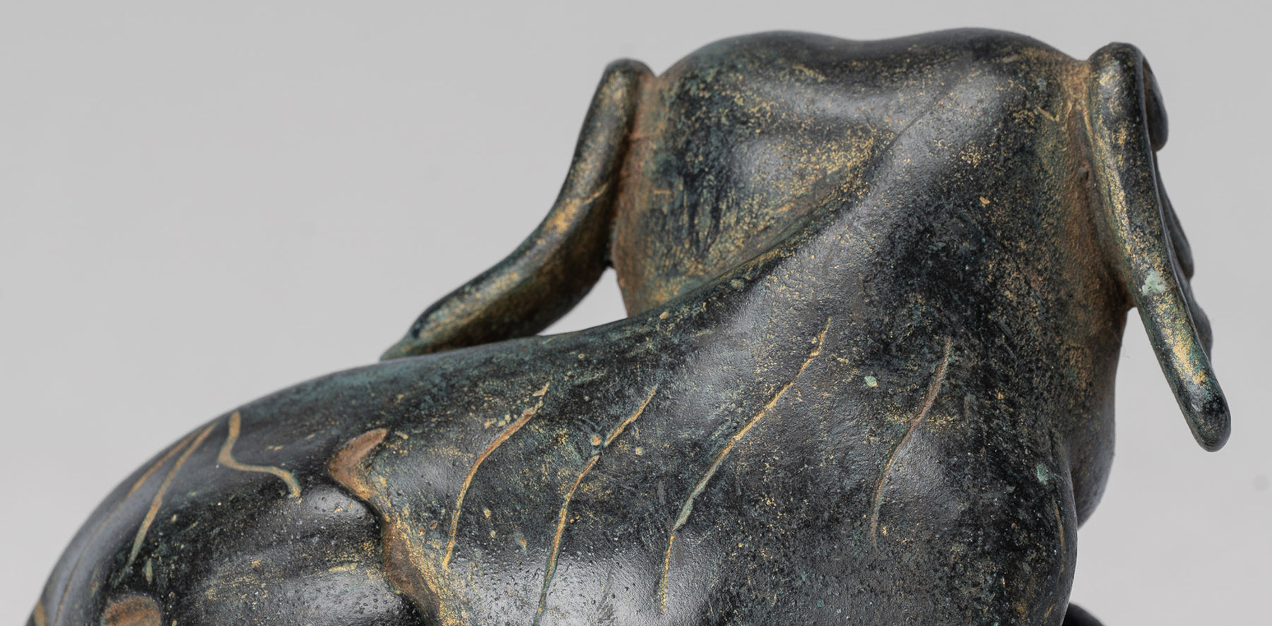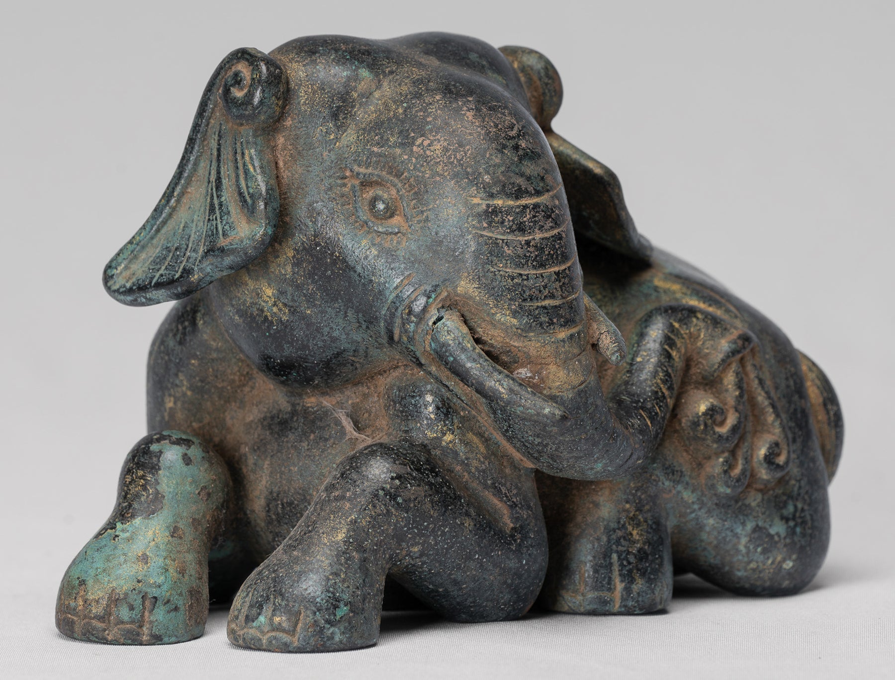 Une statue d'éléphant en bronze de style khmer antique. L'éléphant peut être vu allongé, reposant d'un jour productif long, chargé (peut-être!).