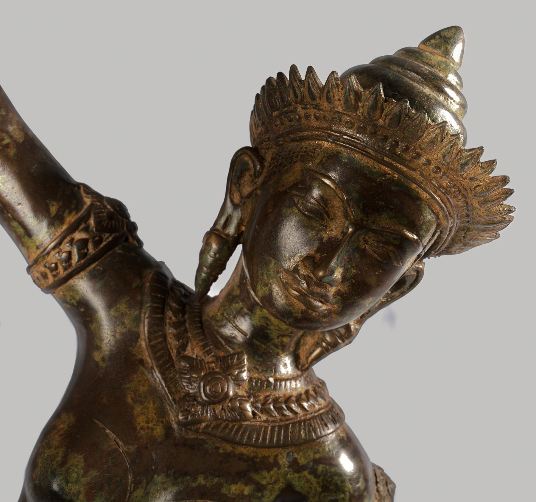 Apsara ou ange céleste en bronze de style thaïlandais antique. L'Apsara est un esprit féminin des nuages et des eaux dans la mythologie hindoue et bouddhiste - une « nymphe céleste » ou une « jeune fille céleste ». Les Apsaras sont de belles êtres féminines surnaturelles. Ils sont jeunes et élégants, et excellents dans l'art de la danse. Ce sont souvent les épouses des Gandharvas, les musiciens de la cour d'Indra.