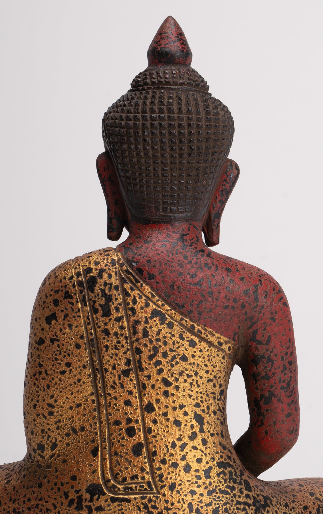 Comme le veut la tradition, le Bouddha de méditation est représenté ici dans une posture assise, les deux jambes croisées en position demi-lotus. Les mains sont placées dans le Dhyana Mudra, où la main droite repose sur la main gauche, les pouces se touchant doucement, formant un triangle ou un cercle subtil. Le dos du Bouddha est droit et le regard est baissé, ce qui signifie une profonde concentration et une réflexion intérieure.