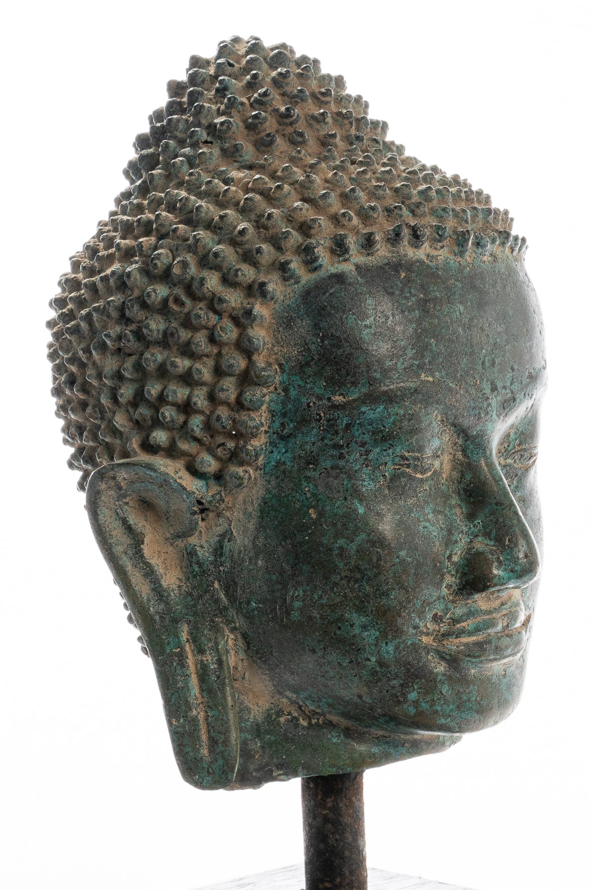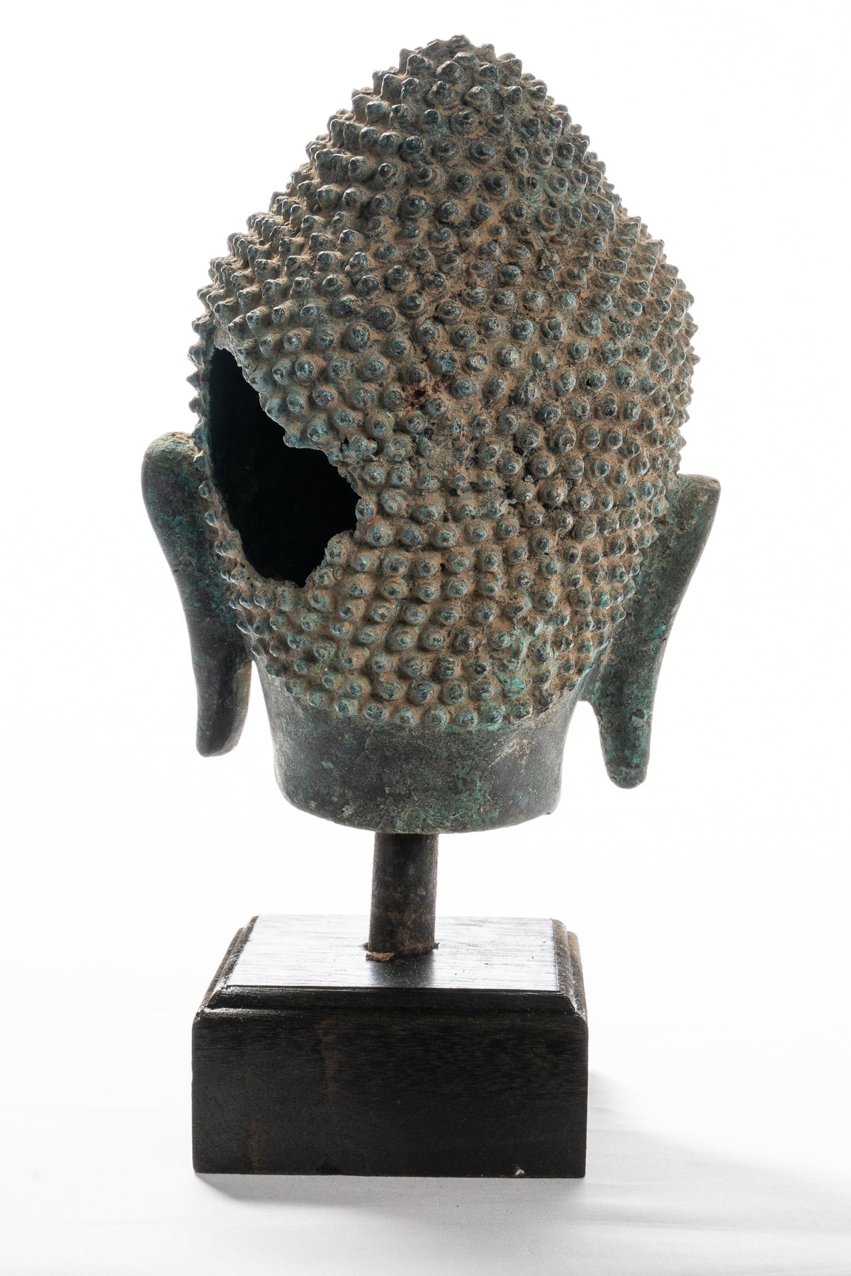 La tête de Bouddha Antique Thaï. Un joli Bouddha avec des détails étonnants et une patine. Le Bouddha a un visage paisible avec des yeux introspectifs en aval et un front ferme. Ses lobes sont étirés longtemps d'une jeunesse passée comme un prince portant des boucles d'oreilles d'or lourdes.
