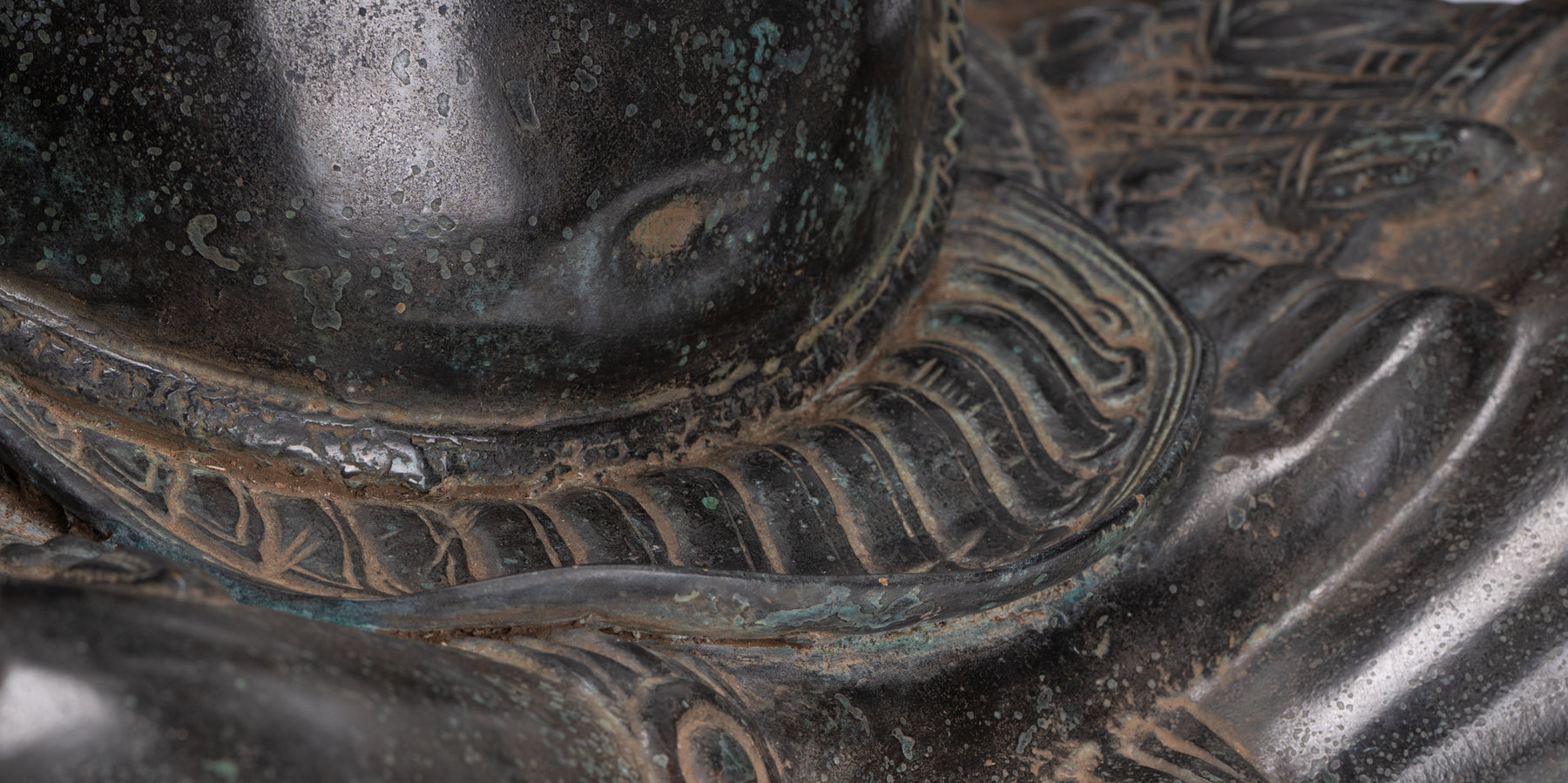 Ce magnifique Ganesha en bronze à 4 bras présente des traits du visage et des bijoux ornés typiques du style d'Angkor Wat. L'empilement cylindrique des cheveux en un chignon haut et des boucles de cheveux régimentées démontrent le caractère œcuménique de l'iconographie de la période d'Angkor Wat , la première associée à la forme suprême de Vishnu, la seconde à Shiva.