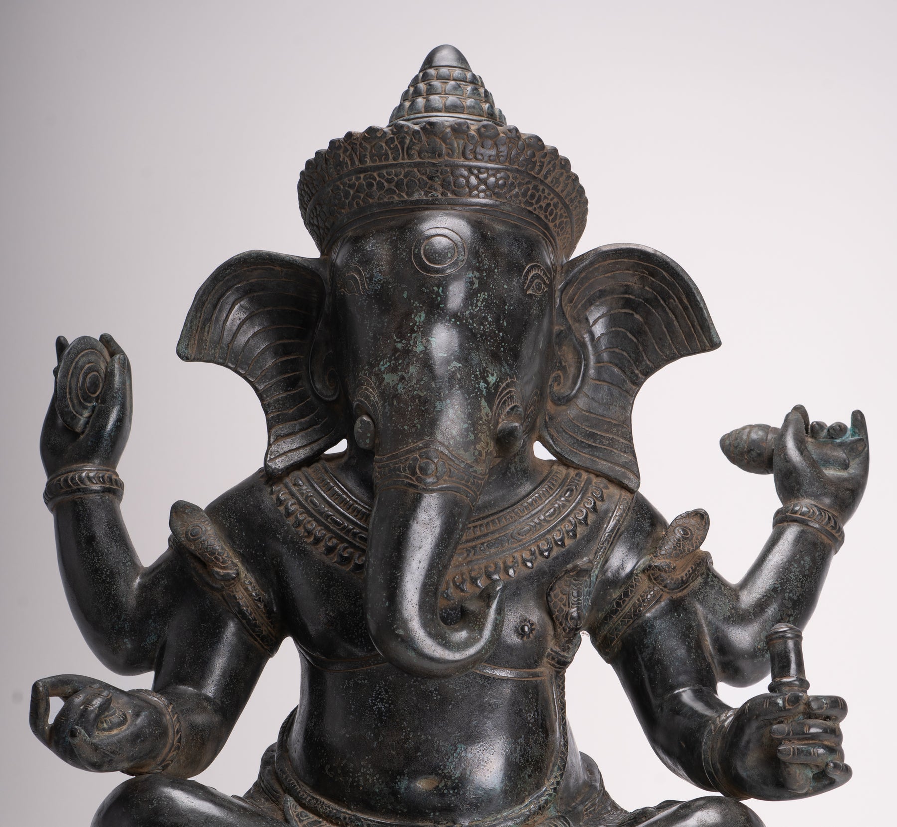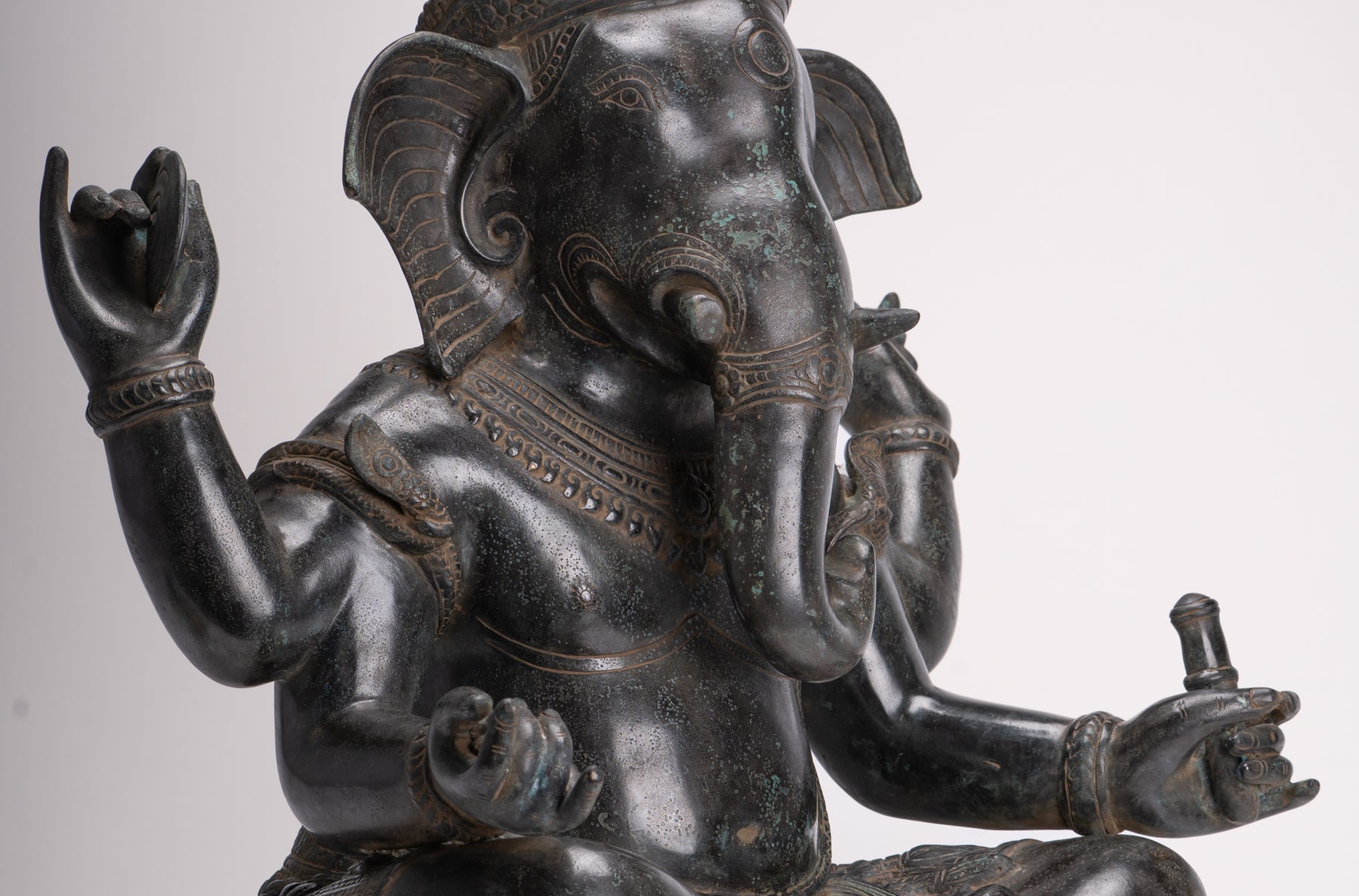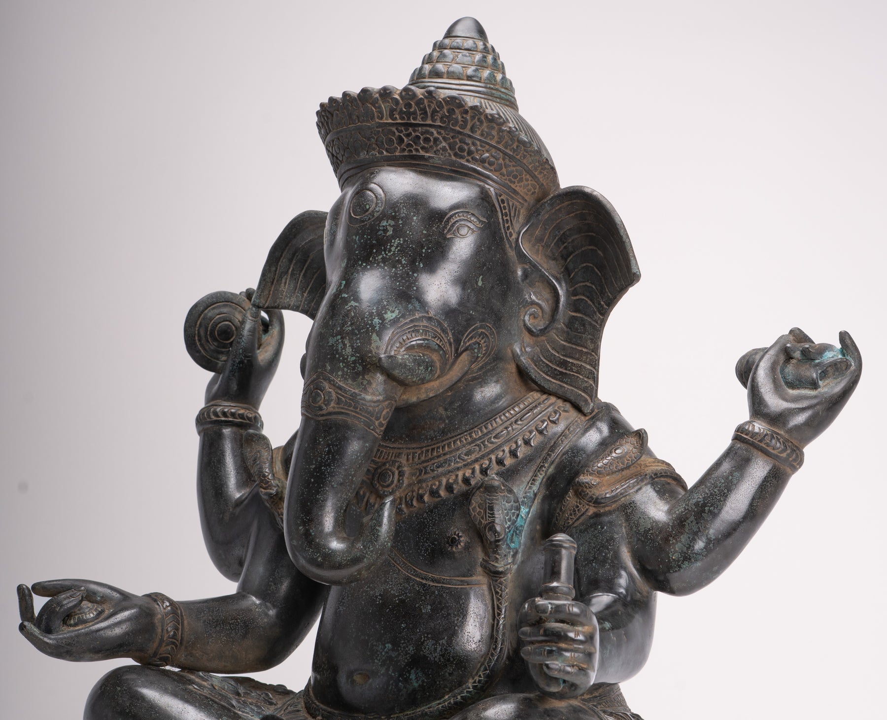 Large Ganesha Statue - Antique Khmer Style Angkor Wat Bronze Seated Four Arm Ganesh Statue - 56cm/22"