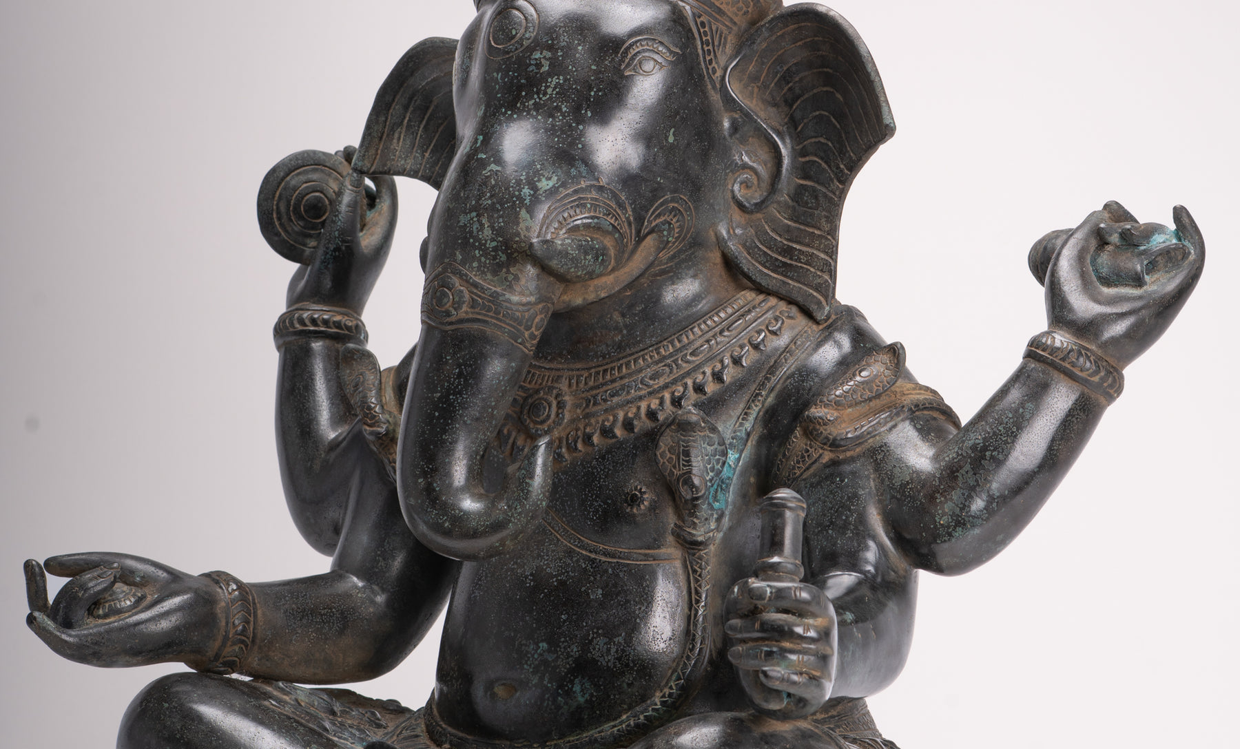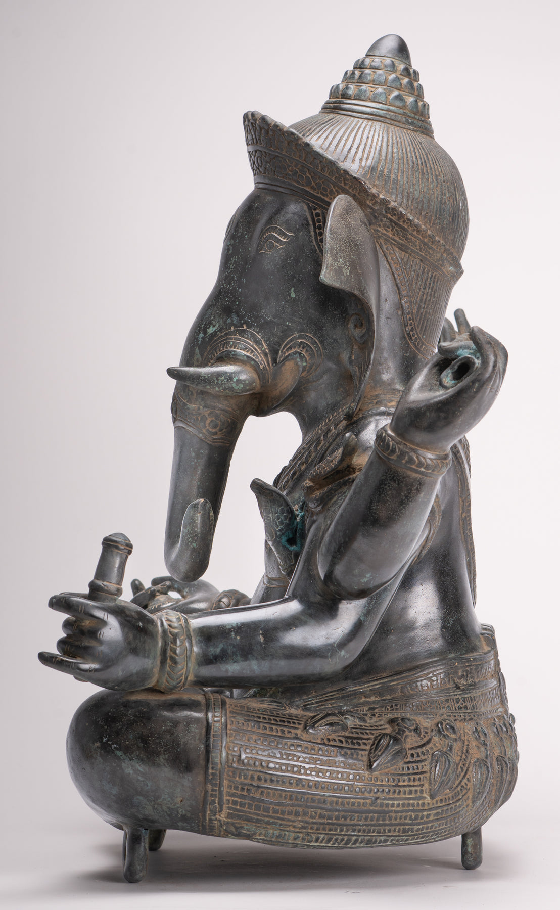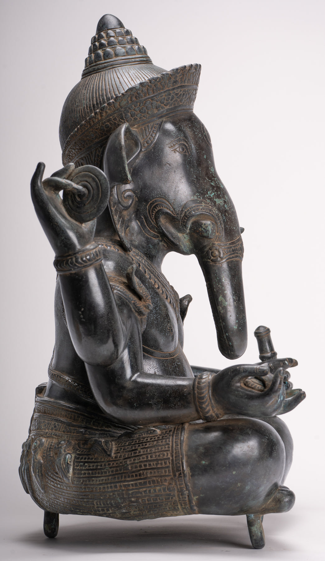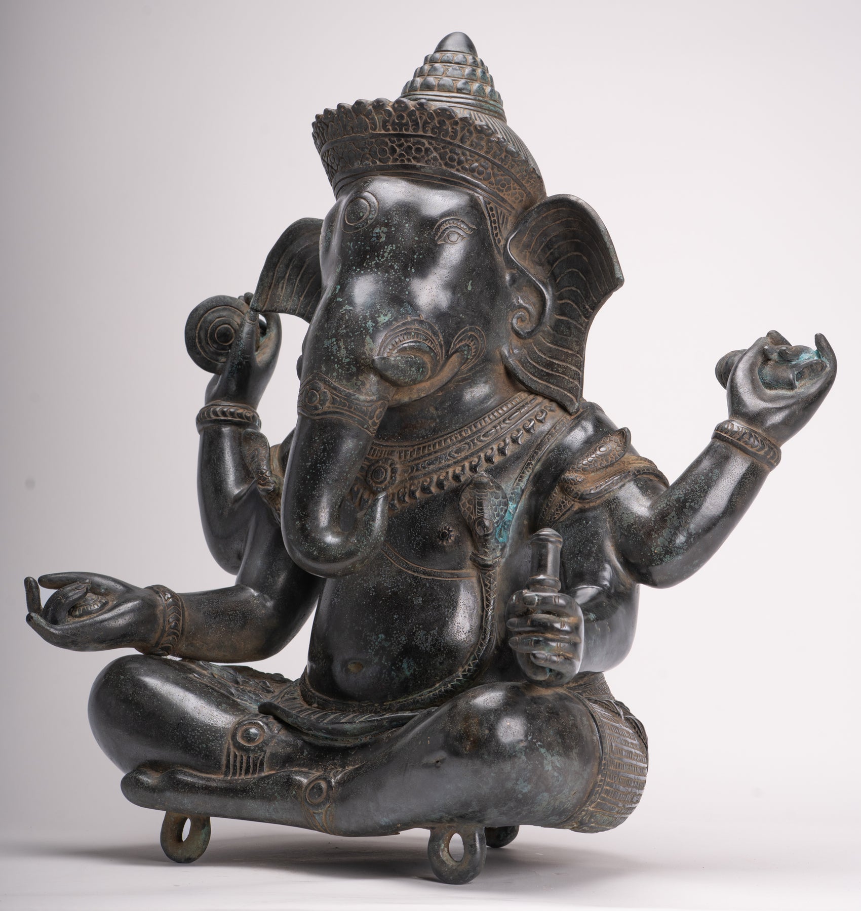 Large Ganesha Statue - Antique Khmer Style Angkor Wat Bronze Seated Four Arm Ganesh Statue - 56cm/22"