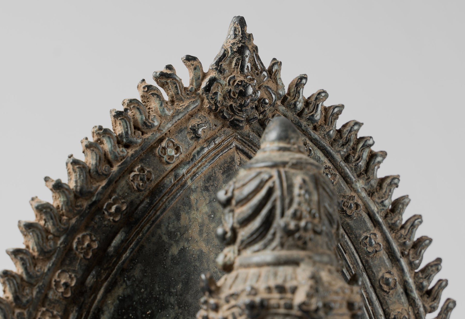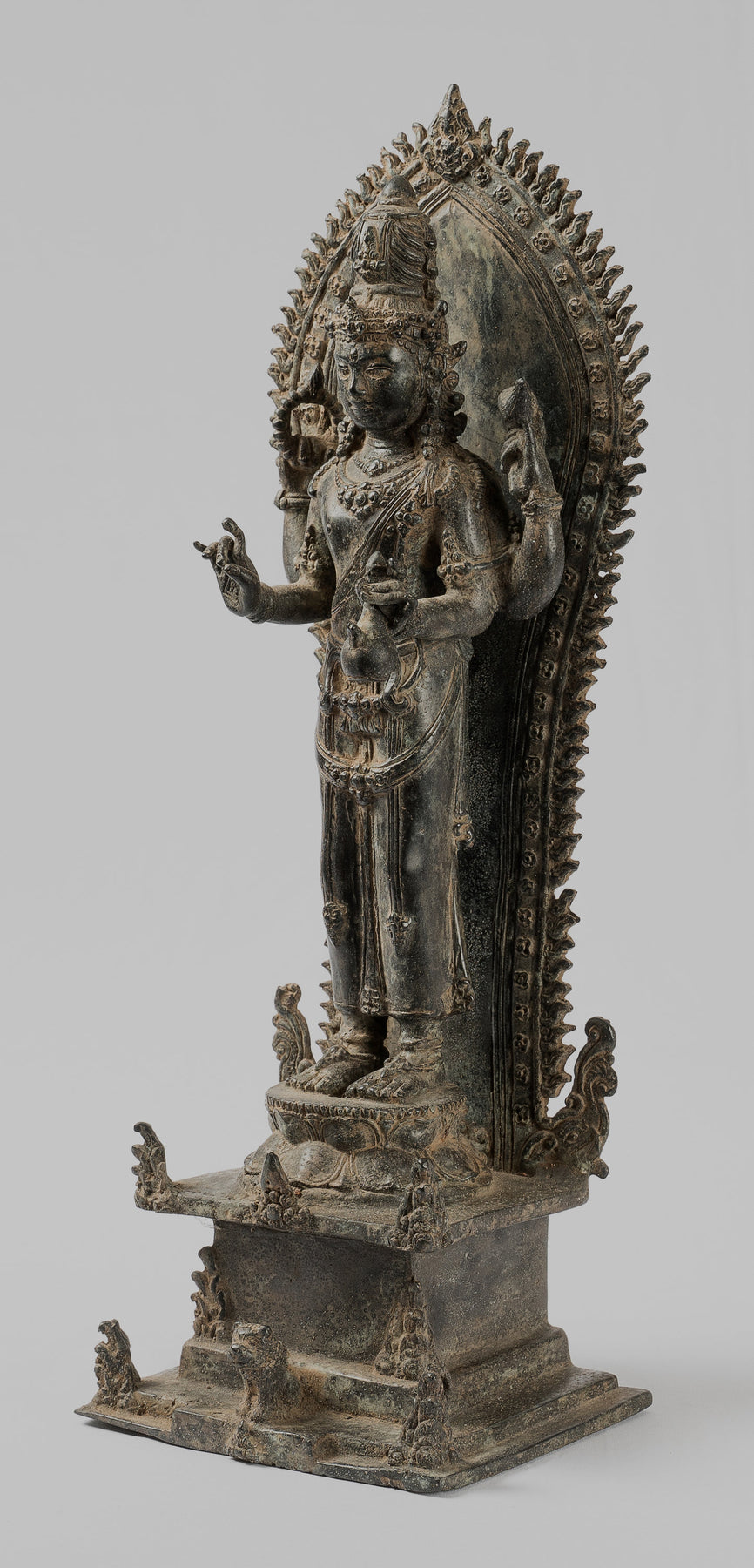 Vishnu est soutenu par un aureole avec une bordure en perles et un rebord en flammes, surmonté d'un finial décoratif.