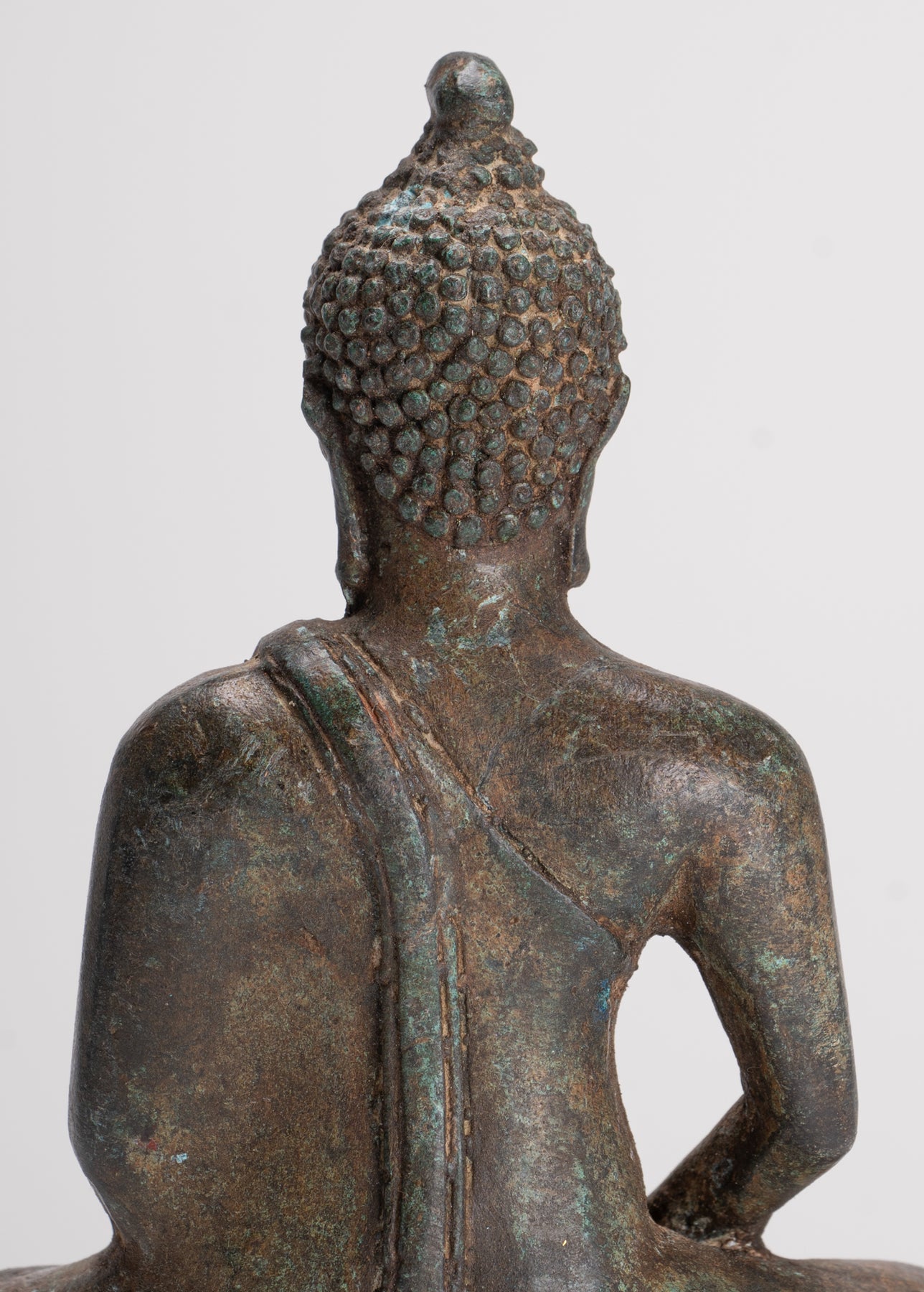 Come è tradizionale, il Buddha di meditazione è raffigurato qui in una posizione seduta, con entrambe le gambe incrociate in posizione mezzo-loto. Le mani sono posizionate nel Dhyana Mudra, dove la mano destra poggia sopra la mano sinistra, con i pollici che toccano delicatamente, formando un sottile triangolo o un cerchio. La schiena del Buddha è dritta e lo sguardo viene abbassato, significando profonda concentrazione e riflessione interiore.