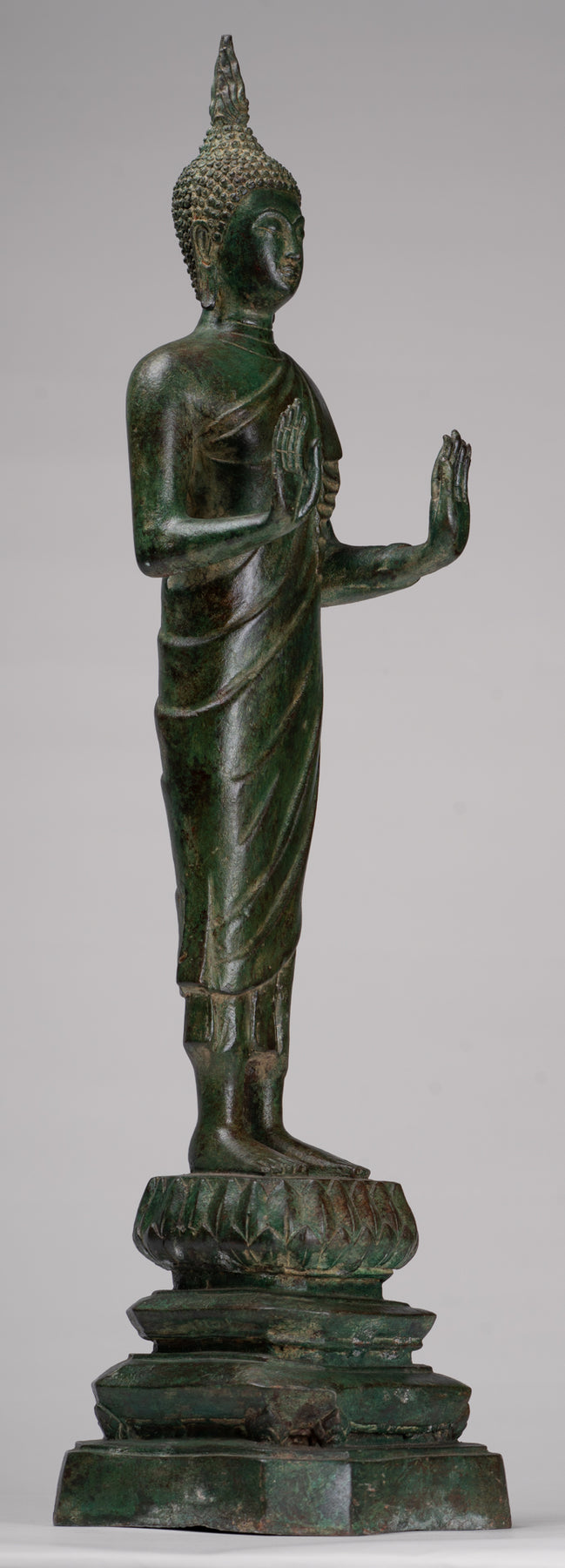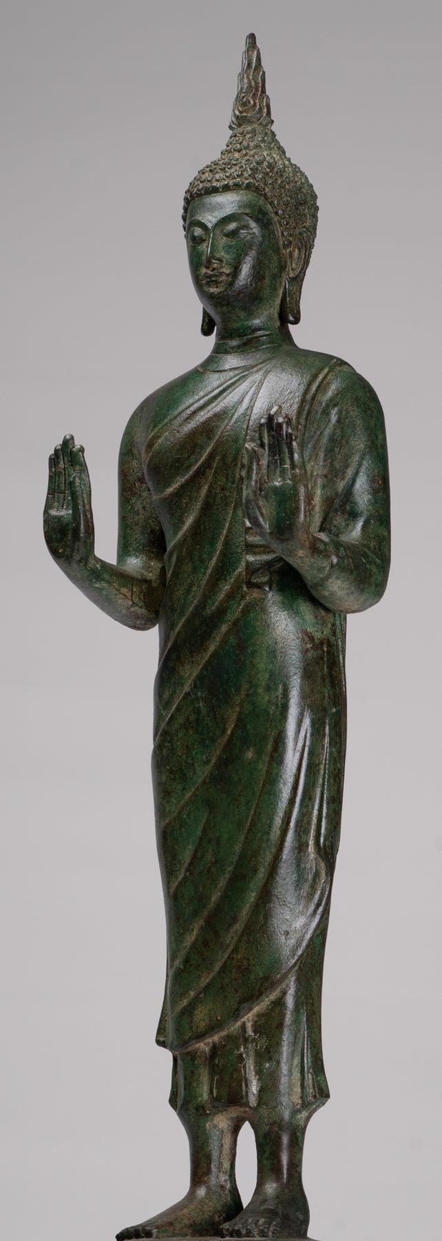 Il Signore Buddha è in piedi nel doppio Abhaya o mudra di protezione sulla base di una foglia di loto. La grande protuberanza ushnisha a forma di fiamma sulla sommità della testa, nello stile Sukhothai, simboleggia il suo alto livello di sviluppo spirituale.