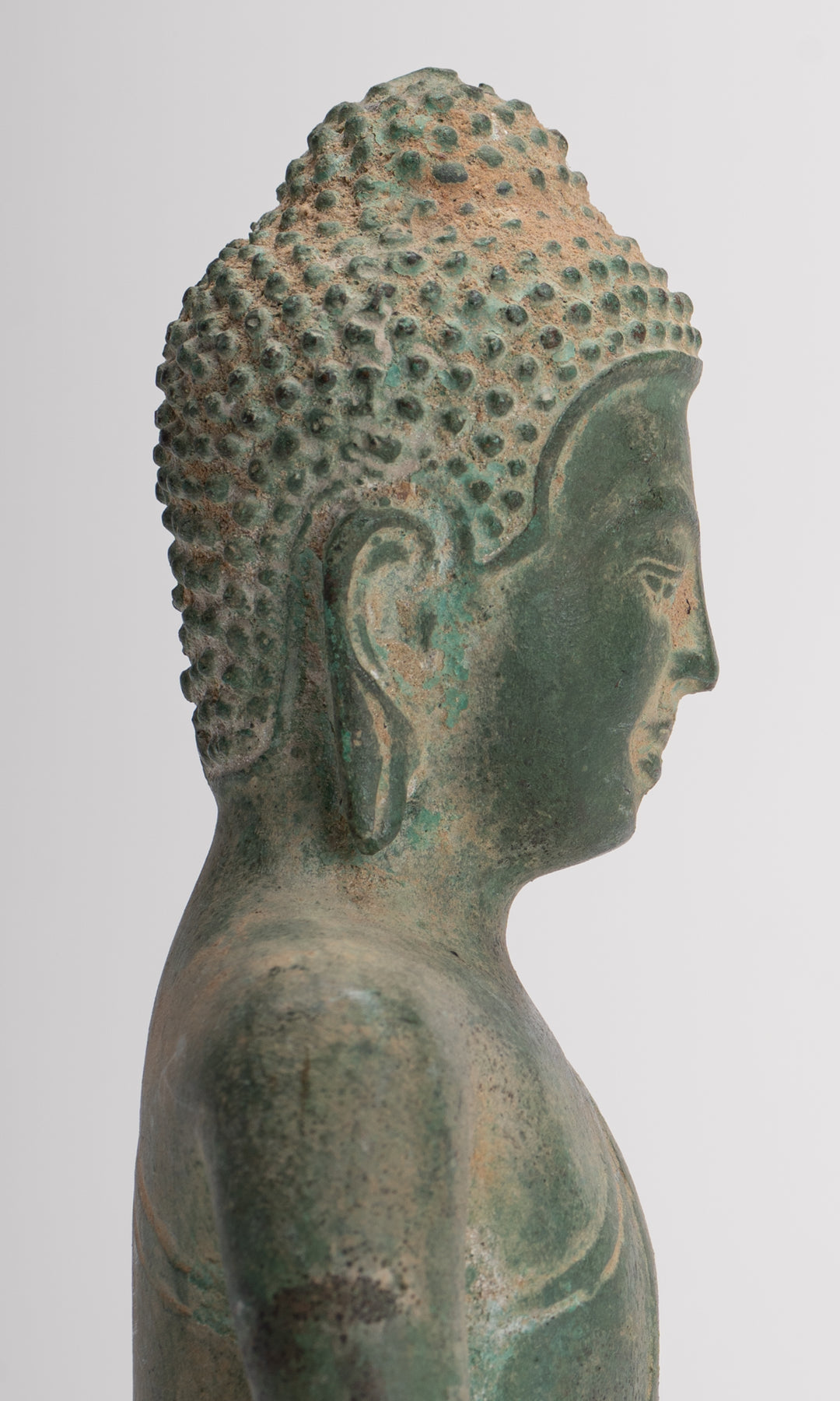 Il Buddha presenta un viso di forma ovale, con occhi bassi a mandorla. Le sopracciglia curve si incontrano sopra un naso prominente e le labbra sagomate con un'espressione esaltata sembrano sorridenti.