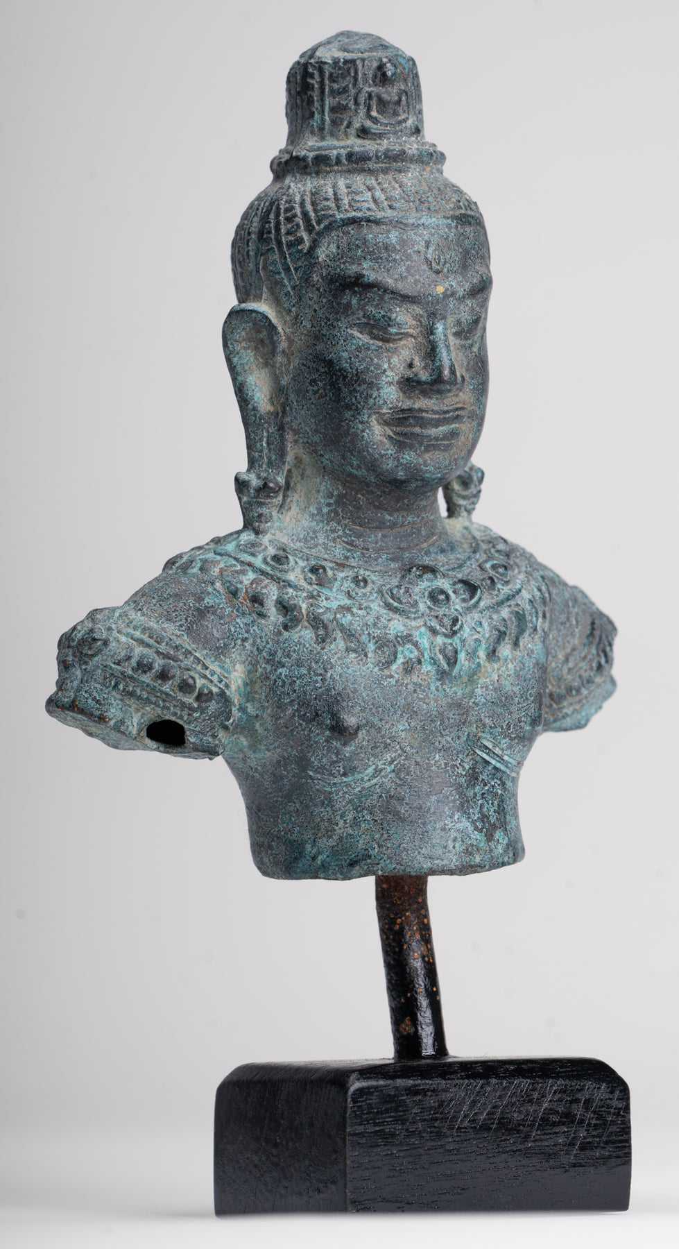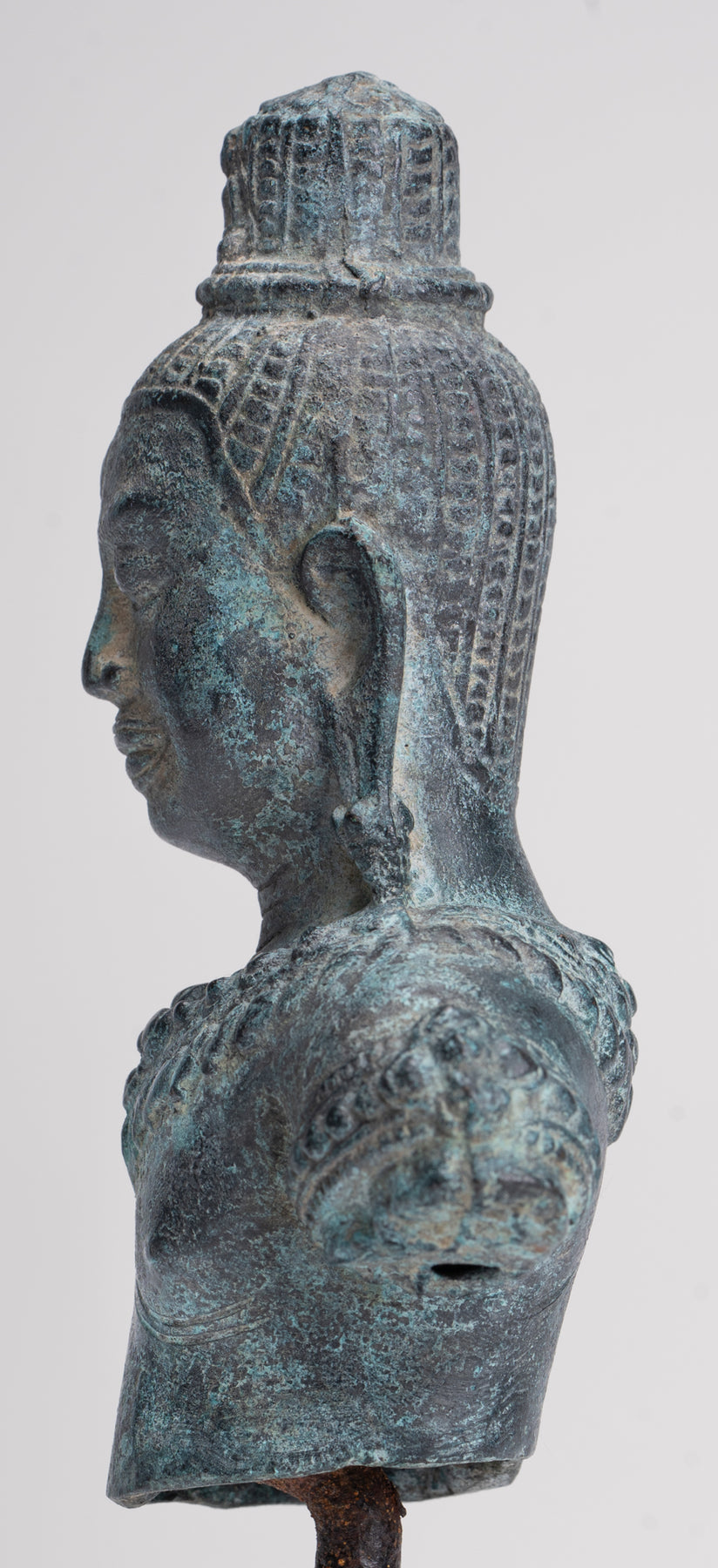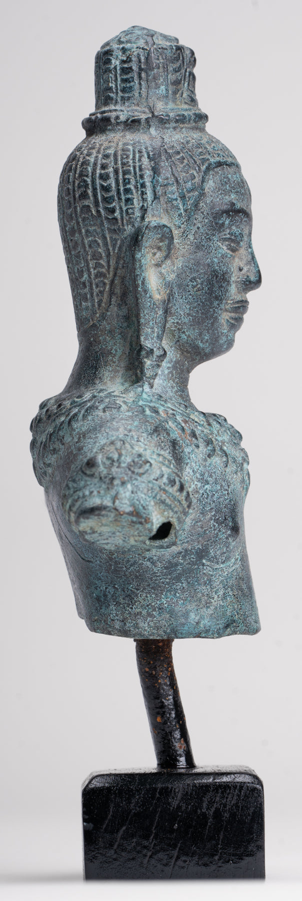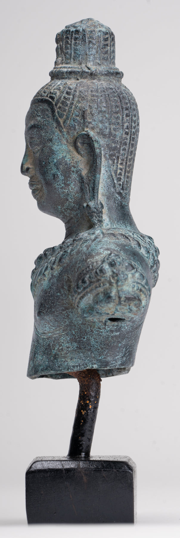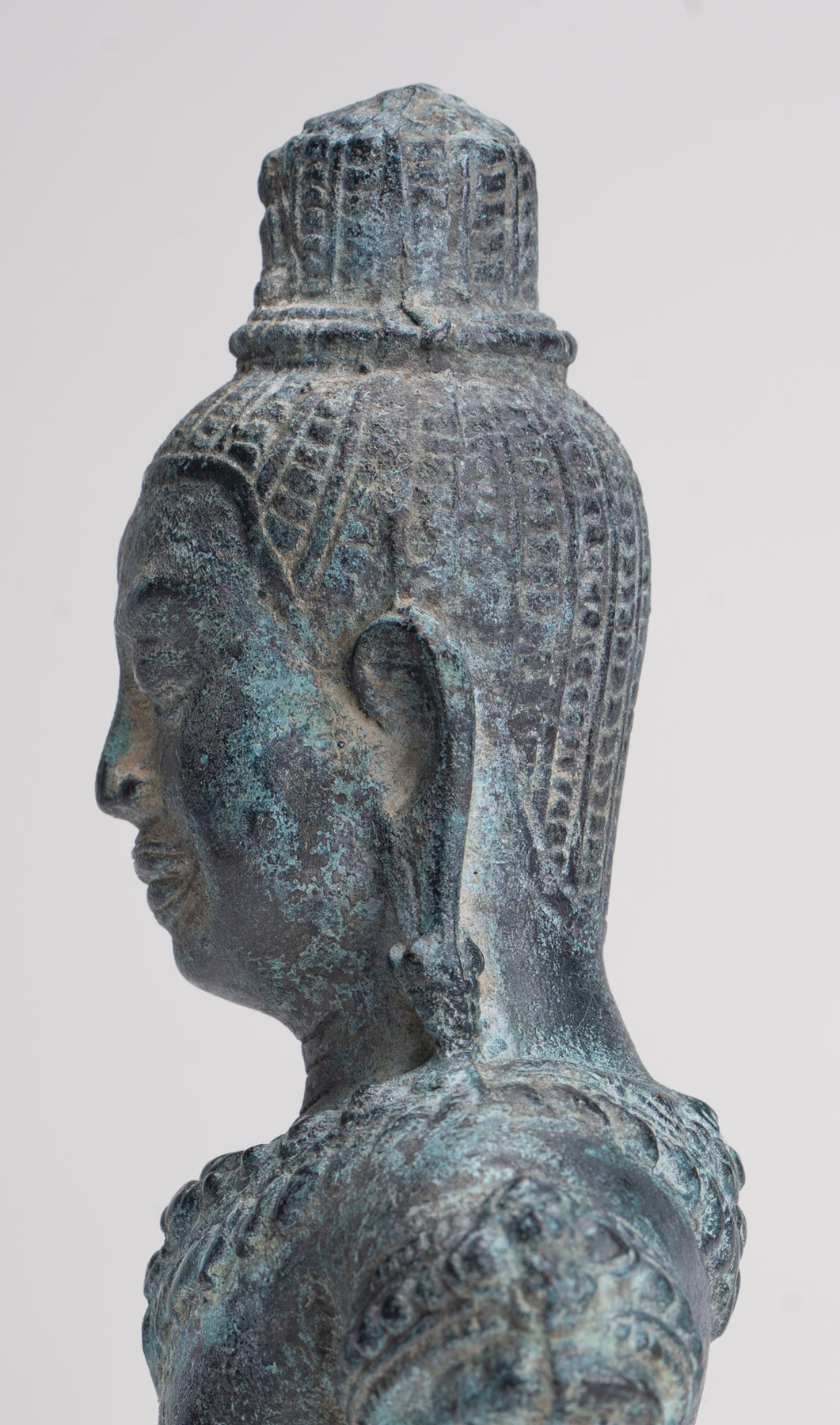 Sopra la sua testa c'è un copricapo cilindrico coronato da un piccolo Buddha in meditazione, che sottolinea il ruolo di Lokeshvara come bodhisattva compassionevole e incarnazione della misericordia illuminata. Questo dettaglio raffinato attira lo sguardo verso l’alto e rafforza il focus spirituale della statua.