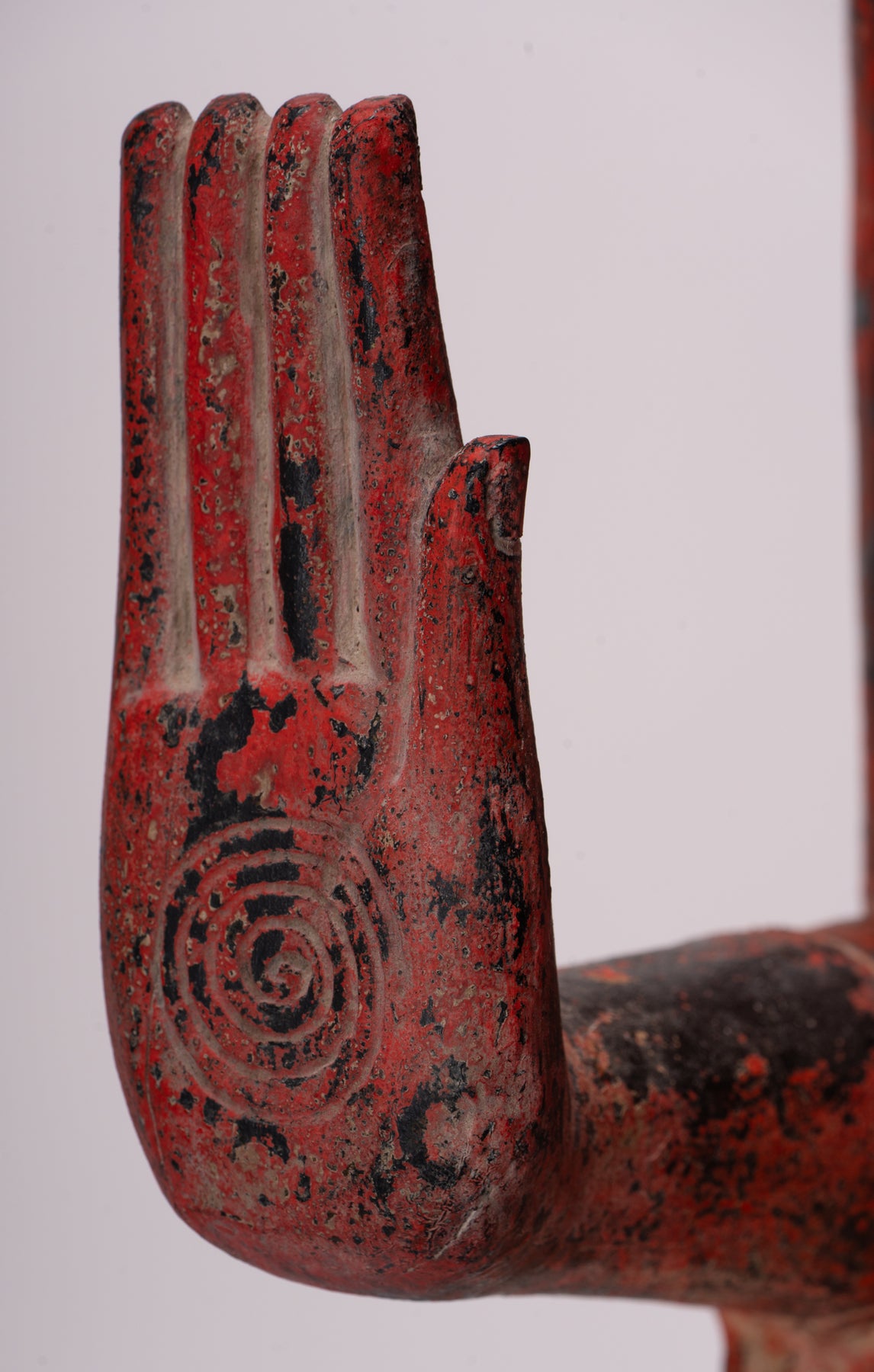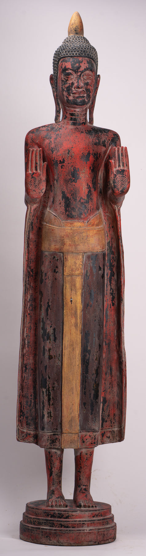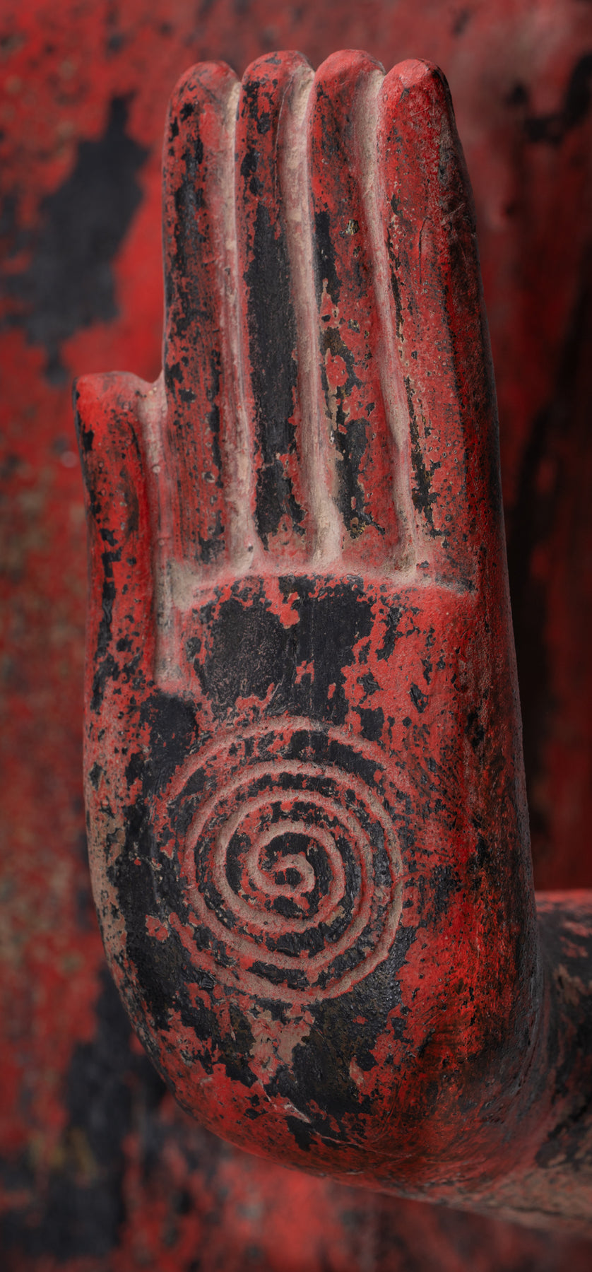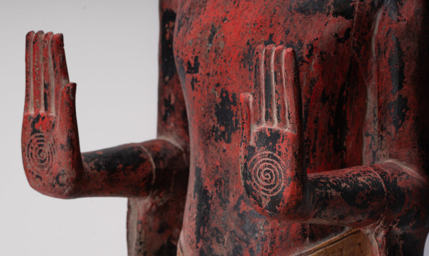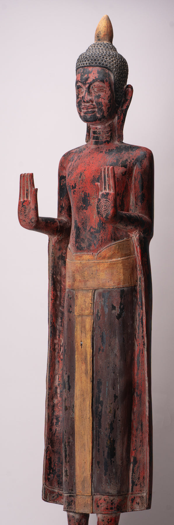 Nell'iconografia buddista, il Abhaya Budda è un potente simbolo di coraggio e protezione divina. Entrambe le mani sono sollevate all'altezza delle spalle, con i palmi rivolti verso l'esterno e le dita estese, nel classico “gesto di impavidità”. Questo antico mudra, condiviso tra le tradizioni indù, buddista e giainista, significa dissipare la paura, garantire sicurezza e conferire pace interiore e coraggio al devoto.