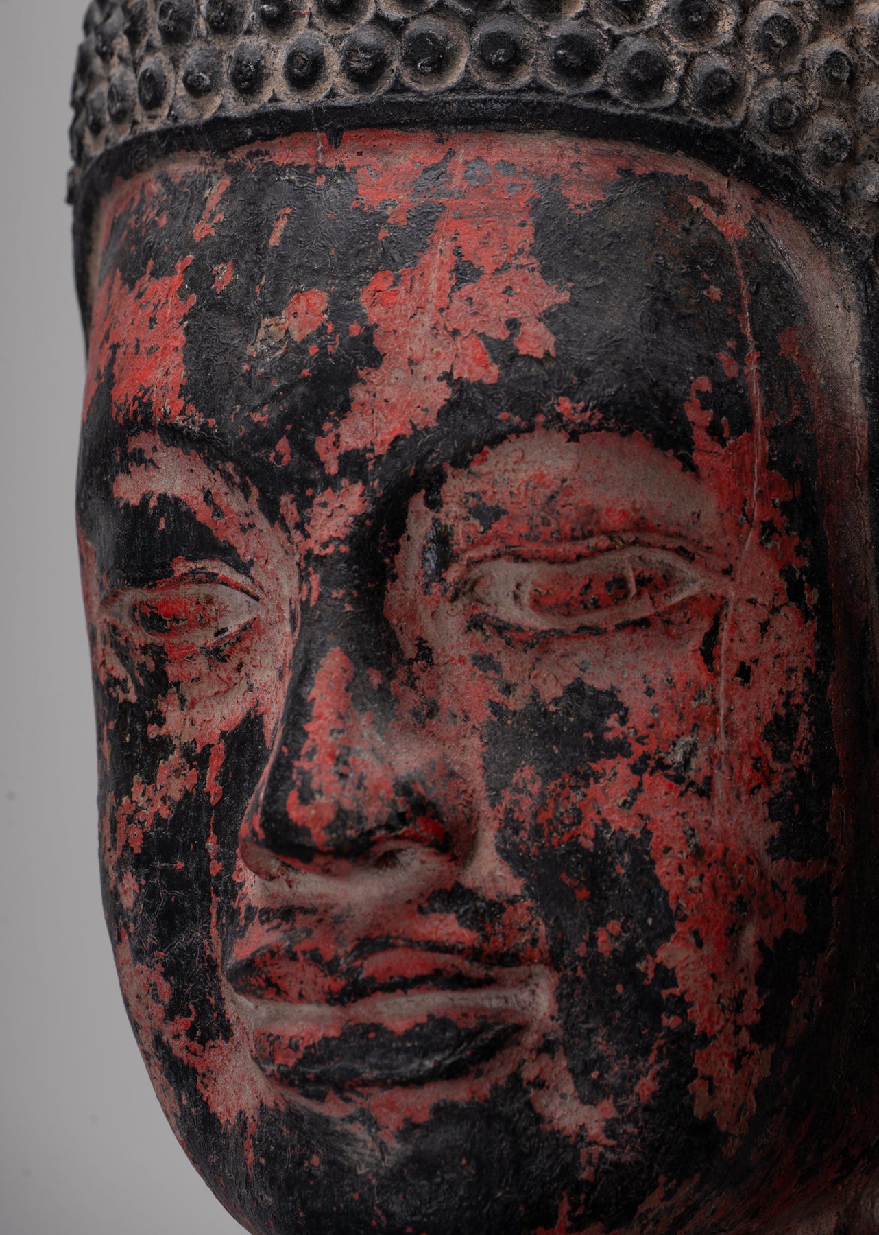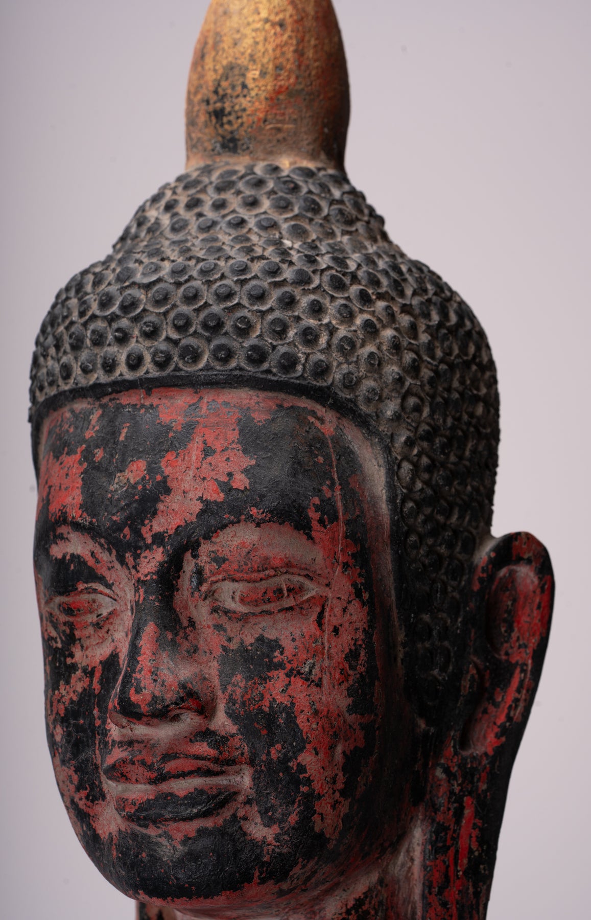 Il volto del Buddha è sereno e introspettivo, con gli occhi dolcemente abbassati e una fronte ferma e composta che insieme trasmettono una profonda quiete interiore. I suoi lobi allungati ricordano la sua giovinezza da principe adornato da pesanti orecchini d'oro, ricordo della vita mondana a cui aveva rinunciato. L'aumento dalla corona della sua testa è prominente Ushnisha, che simboleggia il raggiungimento spirituale avanzato, che culmina in un terminale stilizzato a forma di bocciolo di loto, un emblema di purezza e illuminazione che emerge dal tumulto del mondo.