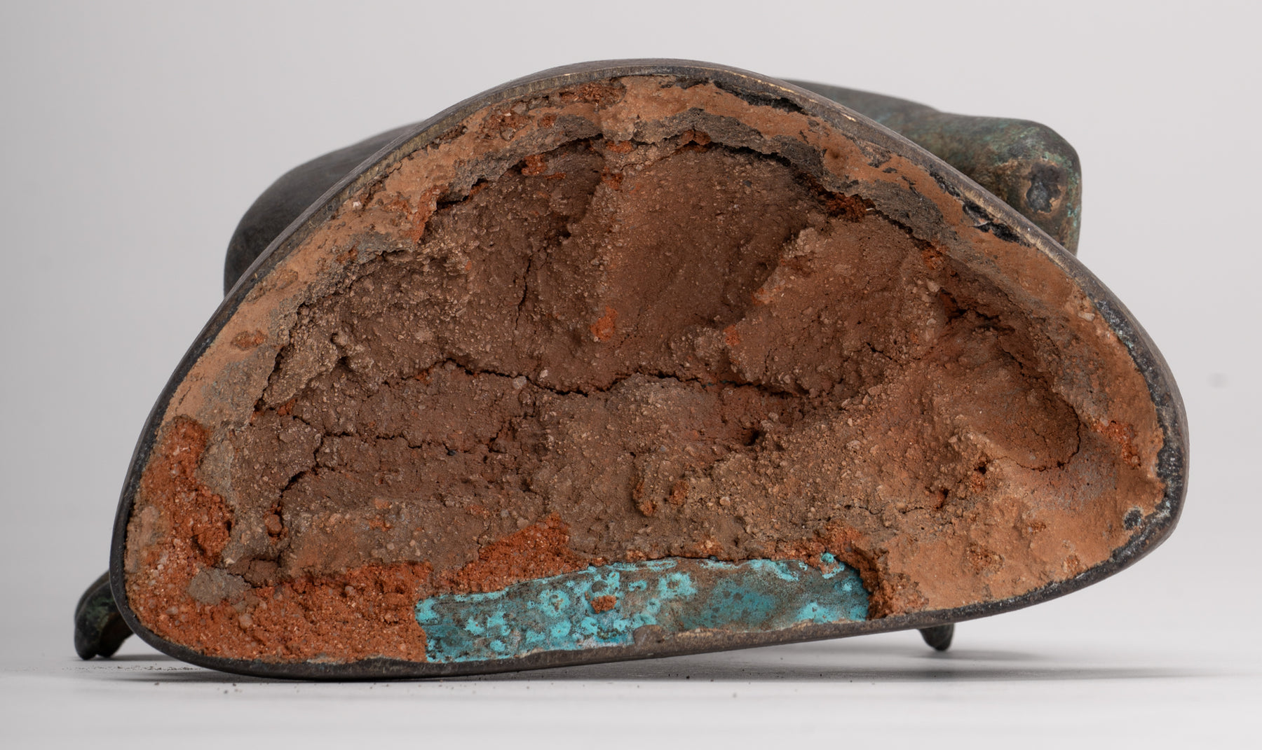 La superficie del bronzo ha invecchiato naturalmente una patina di azurite profonda con tracce di malachite verde, in apparenza, sulla superficie.