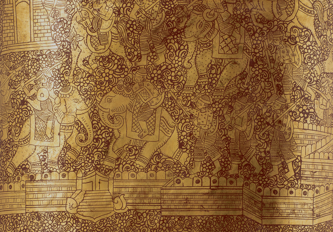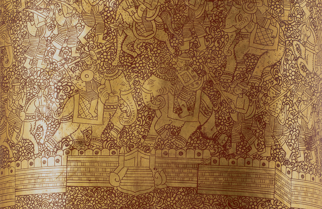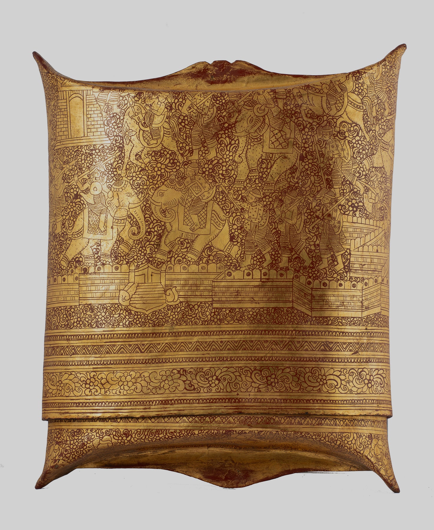 The pouch is decorated in traditional shwe zawa red and gold style.