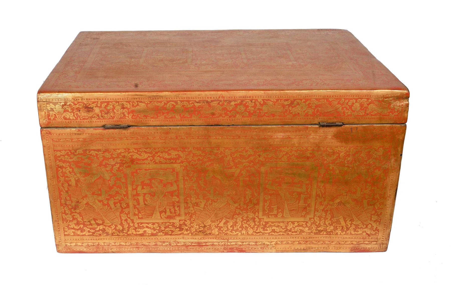 Ca. 19th century lacquer manuscript box. Sadaik (large, rectangular wooden and gold gilt manuscript boxes) were used at monasteries and the homes of government officials and wealthy individuals. The box depicts a traditional Burmese motif.