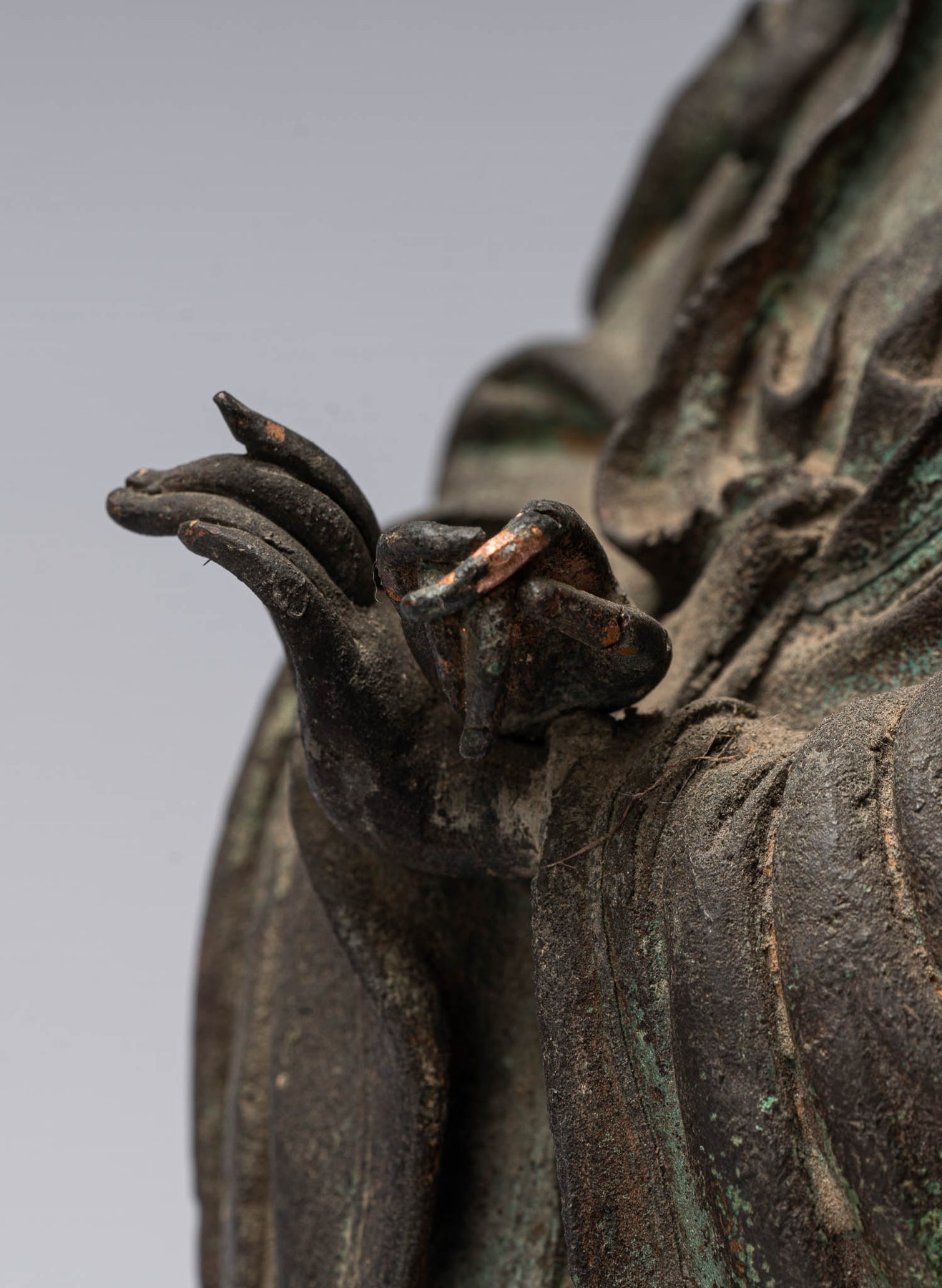 Her hands are held with her thumb and middle finger touching in the vitarka mudra of teaching. Her hair is piled high on her head. Her gaze serene and slightly downcast.