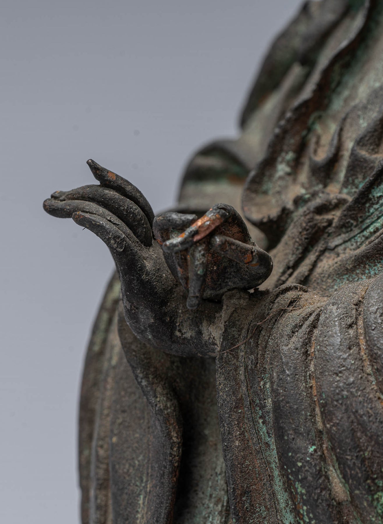 Here she stands samabhanga on a simple base with robes flowing and clinging naturally over and to her long, slender body. Her feet peek from beneath her robes.