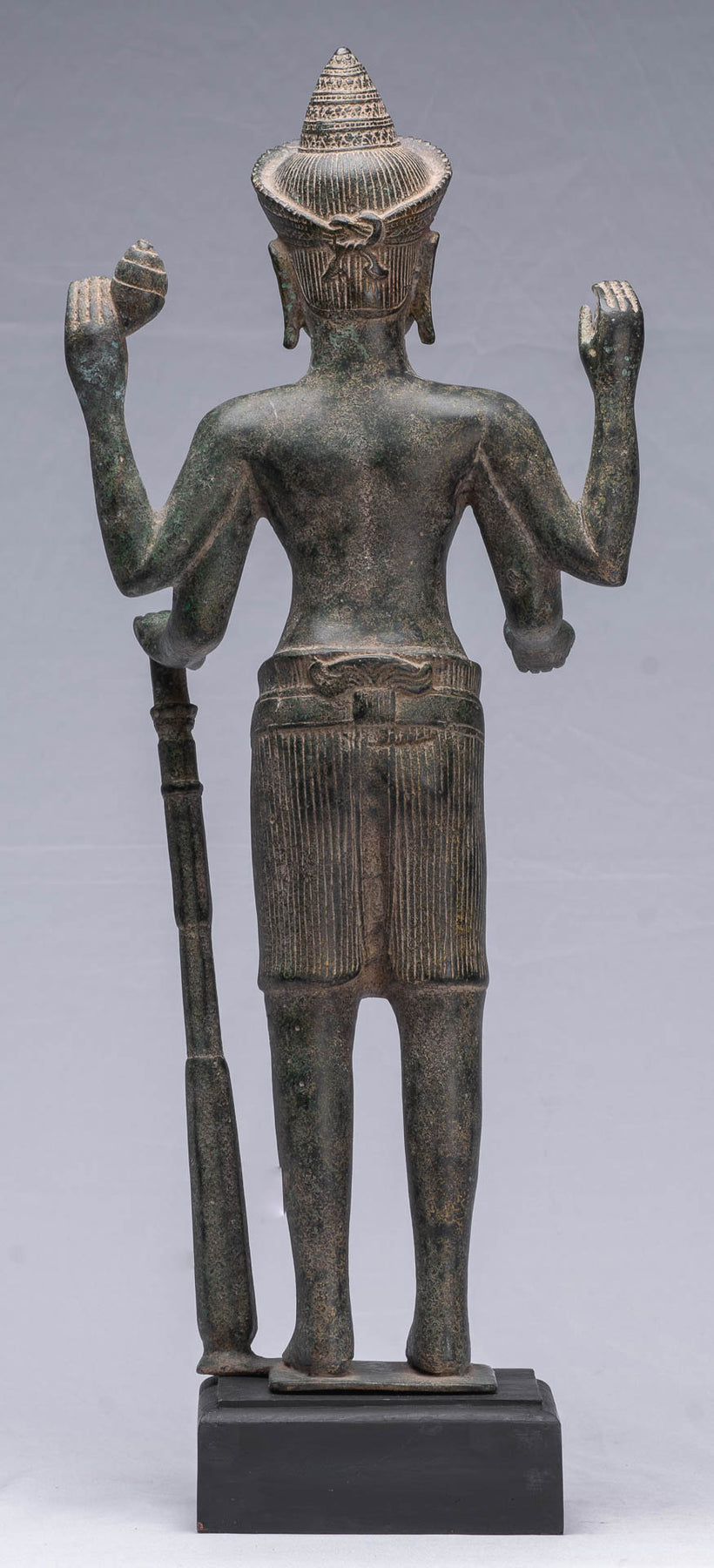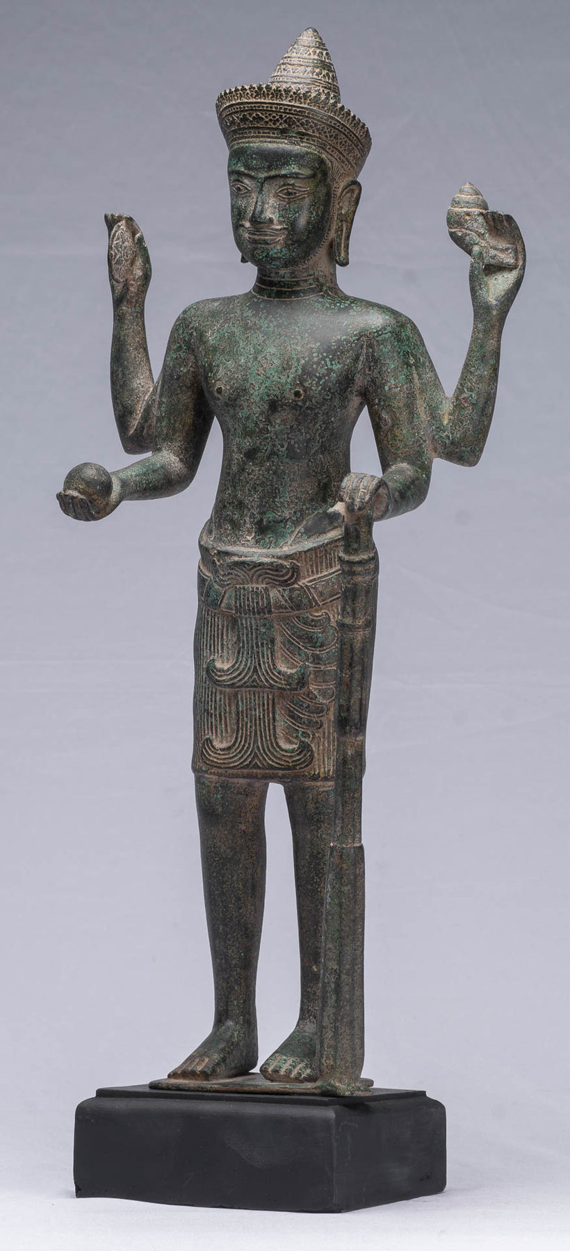 Antique Khmer style bronze standing Angkor Wat, 12th century style, Angkor Vishnu sculpture, from HD Asian Art. Vishnu is both world protector and preserver, restorer of moral order - he is all-powerful and all-pervasive by nature.