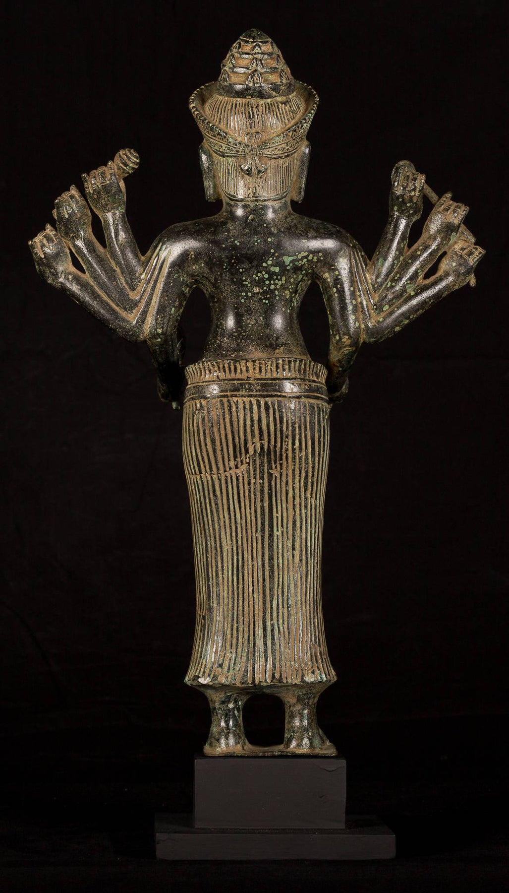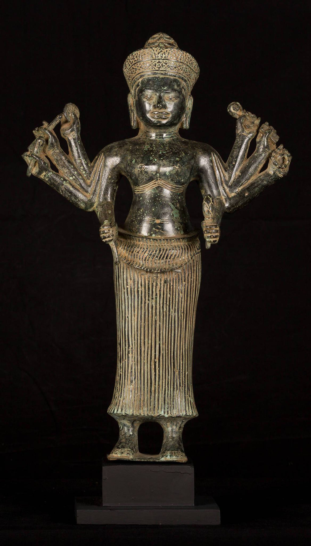 This Durga Mahishasuramardini image is unusual for Khmer Durga images and reflects the vigorous spirit of the Koh Ker period. Earlier Khmer Durga images have only four arms and are carved in the round, while the present image has eight arms.
