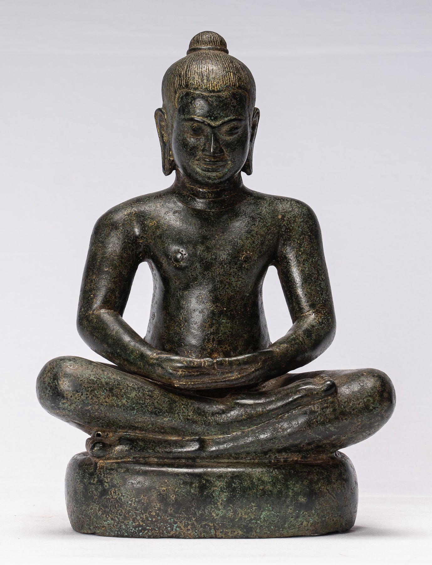 A delightful antique Khmer style bronze sculpture of Jayavarman VII. Lacking any royal or divine attributes, this King Jayavarman VII statue represents a man in venerating meditation. As is traditional, his hair is pulled back and tied in a small bun like chignon. His facial expression is accentuated by semi-closed eyes, a slight smile, large forehead, lips that are neither thin nor thick, and long ear lobes. All of these traits represent the Khmer physiognomy. The king's power as expressed by his facial expression evokes supreme knowledge, compassion and peacefulness.