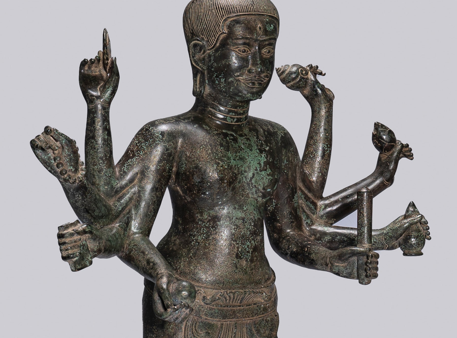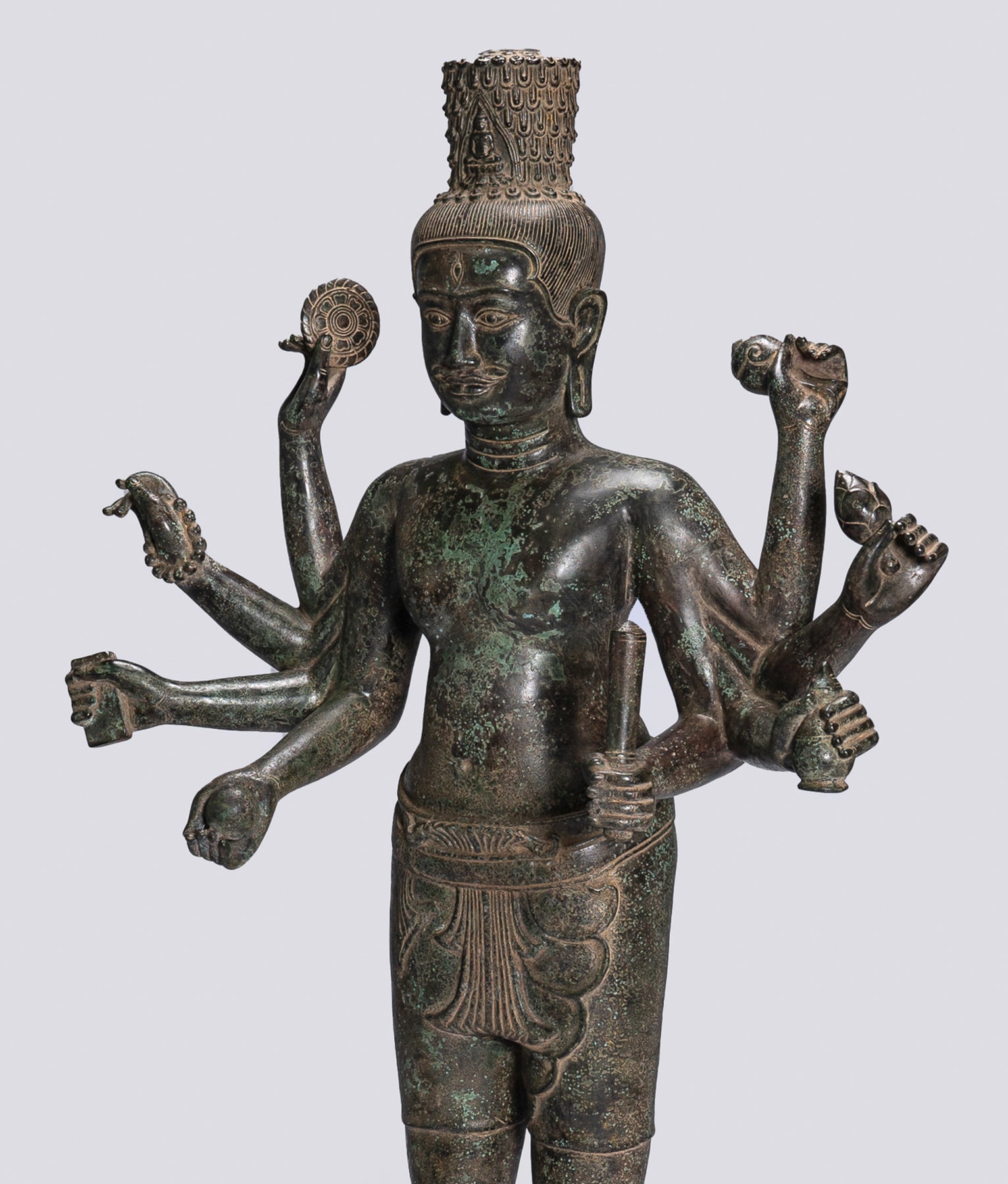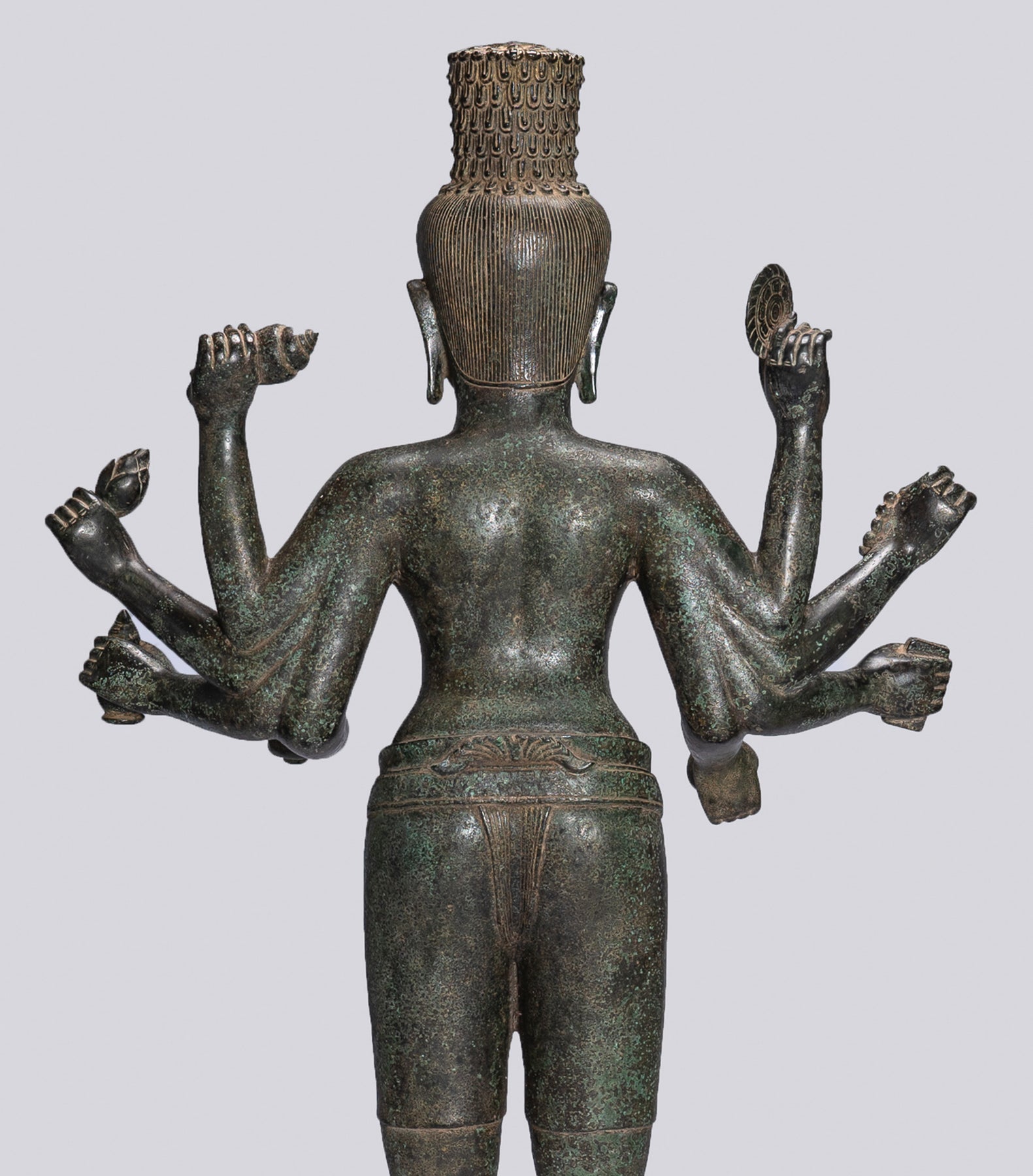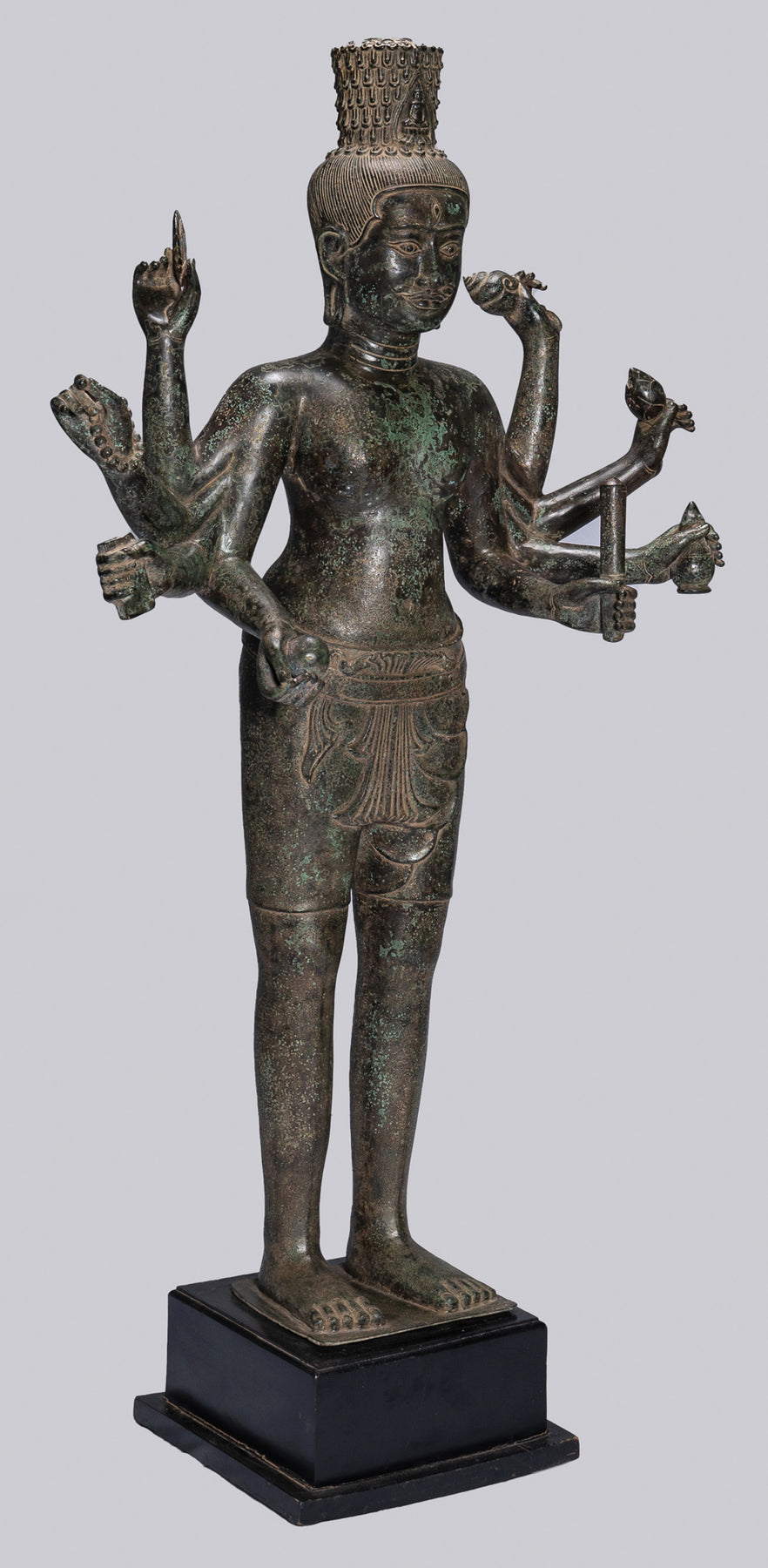 Here, Lokeshvara is standing in samapada with his arms radiating around him and clad in a short sampot with fishtail pleat and jeweled sash, the face with wide features surmounted by a cylindrical headdress adorned with a meditating Buddha.
