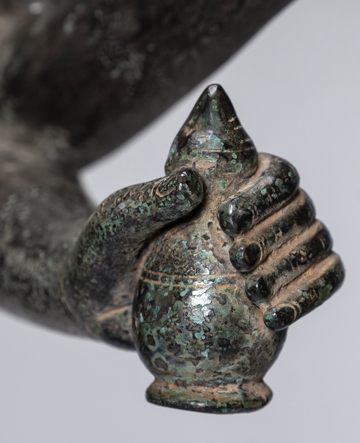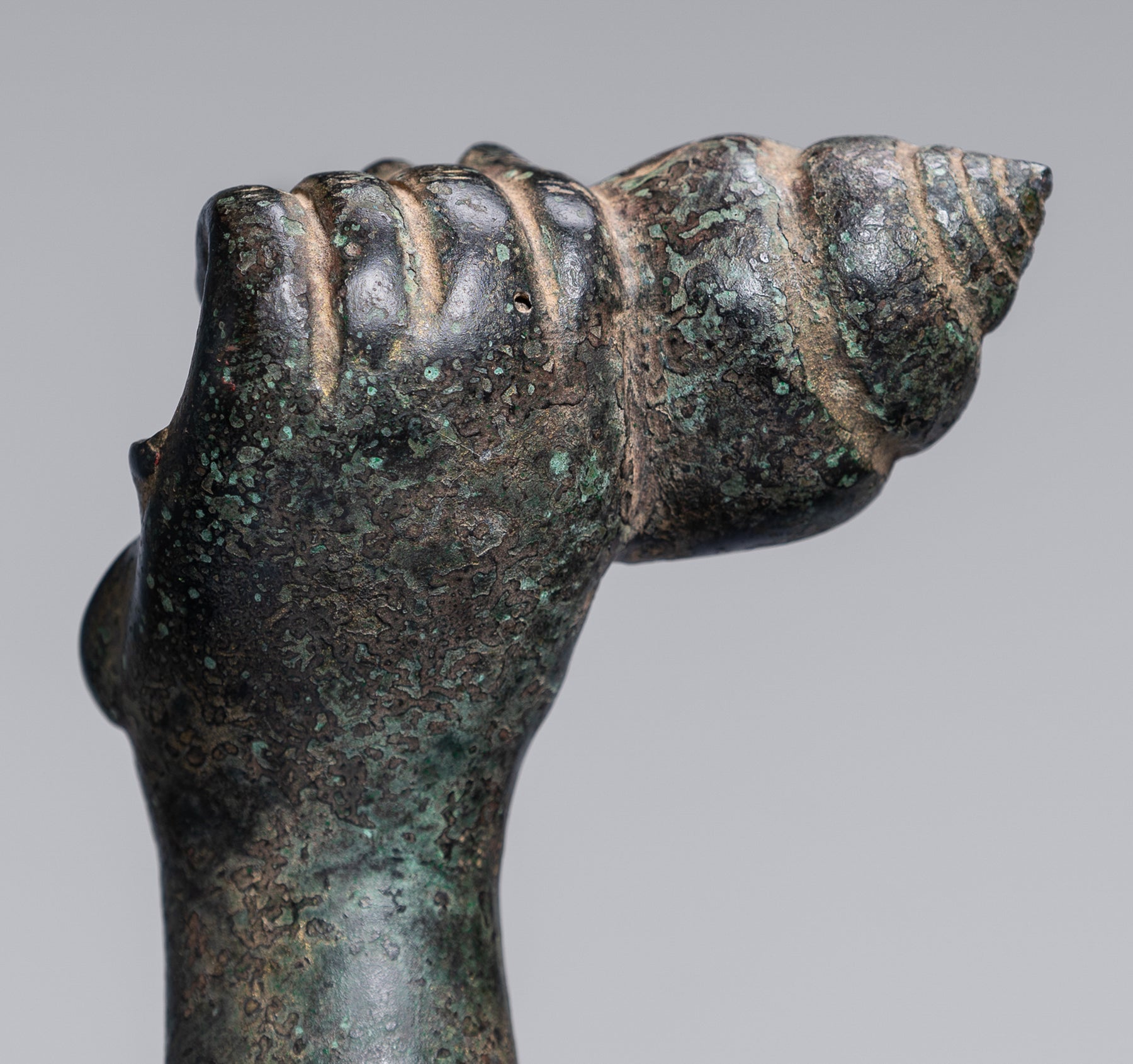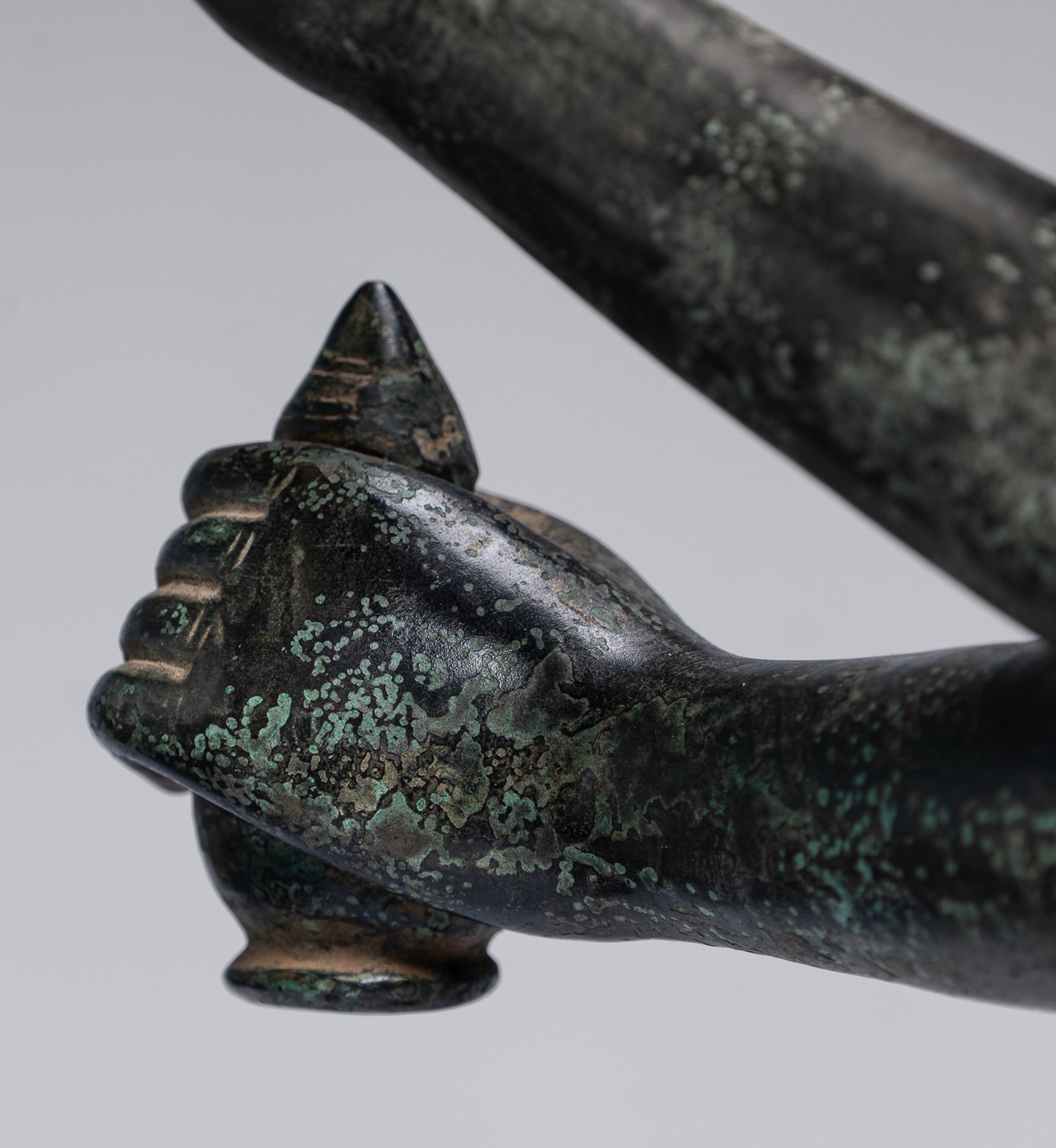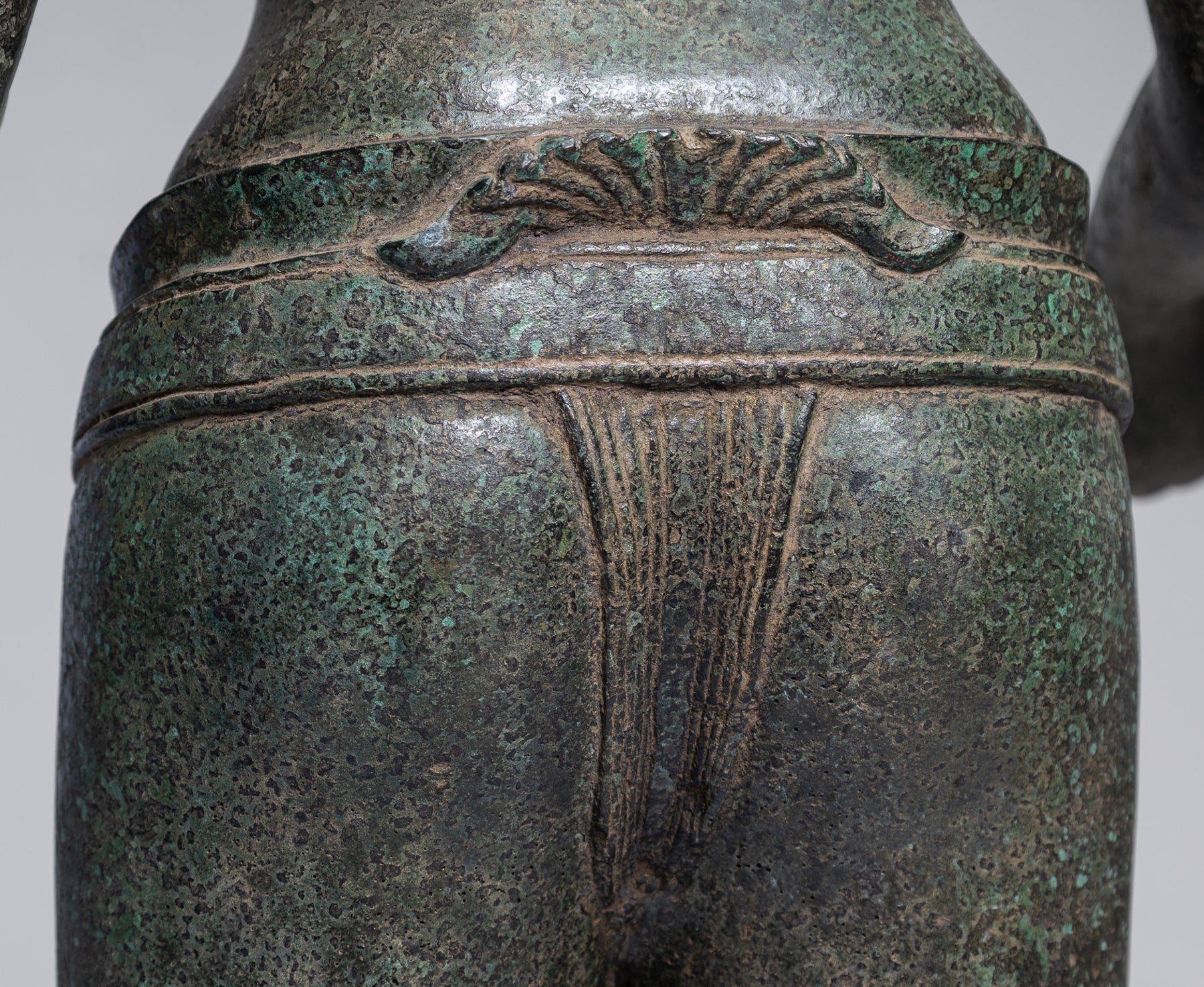 Here, Lokeshvara is standing in samapada with his arms radiating around him and clad in a short sampot with fishtail pleat and jeweled sash, the face with wide features surmounted by a cylindrical headdress adorned with a meditating Buddha.