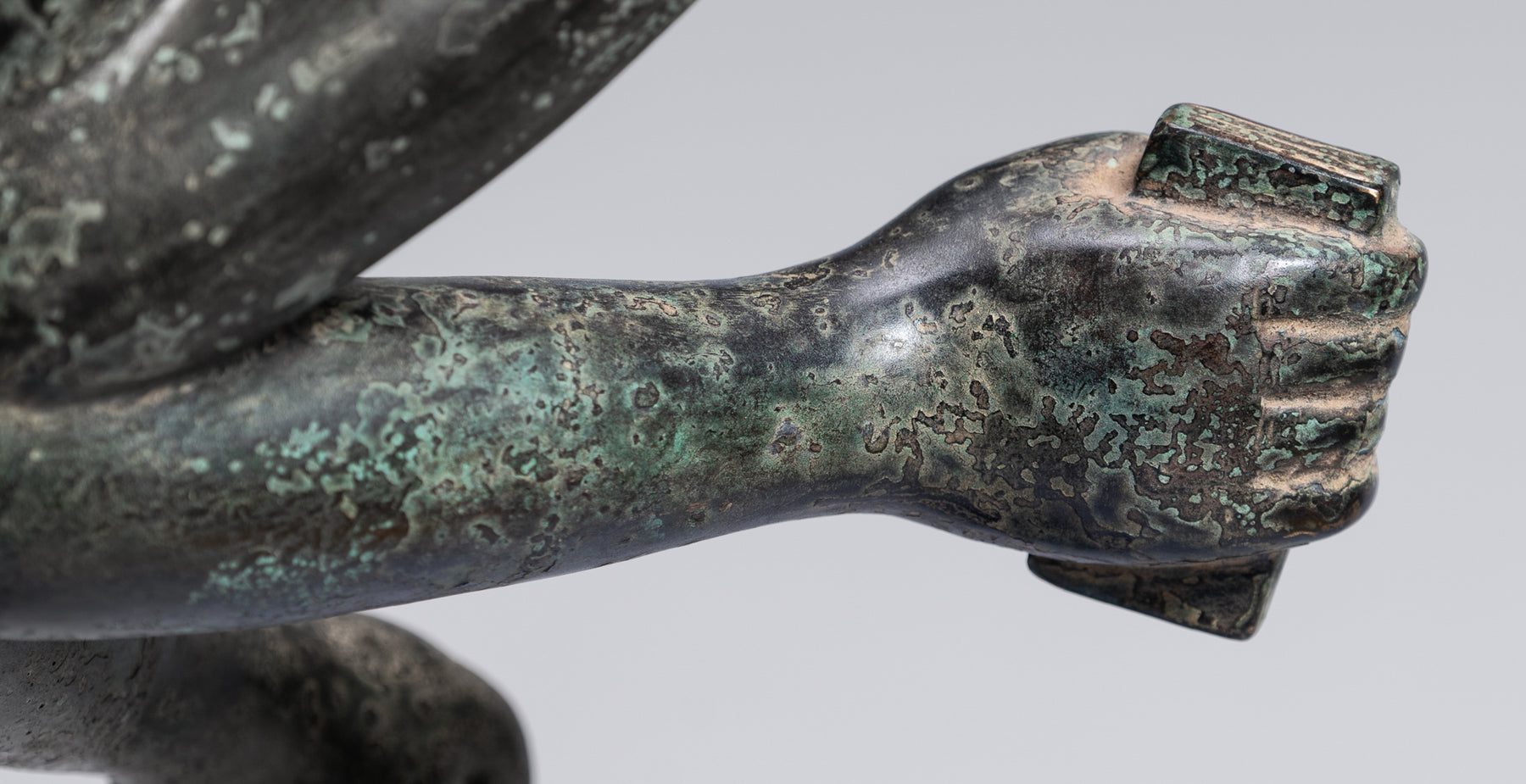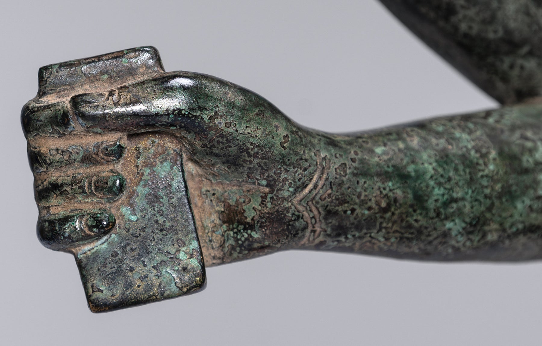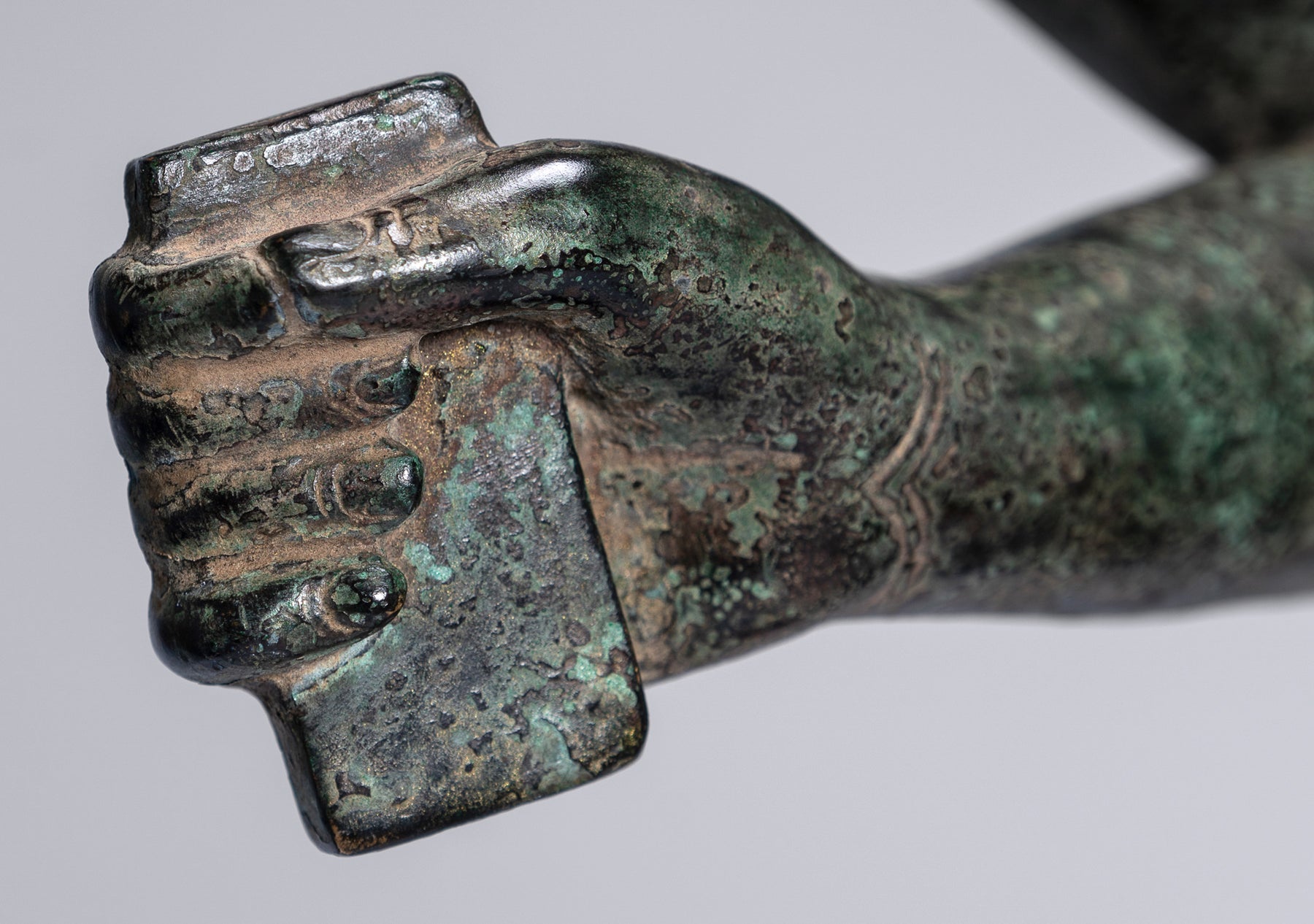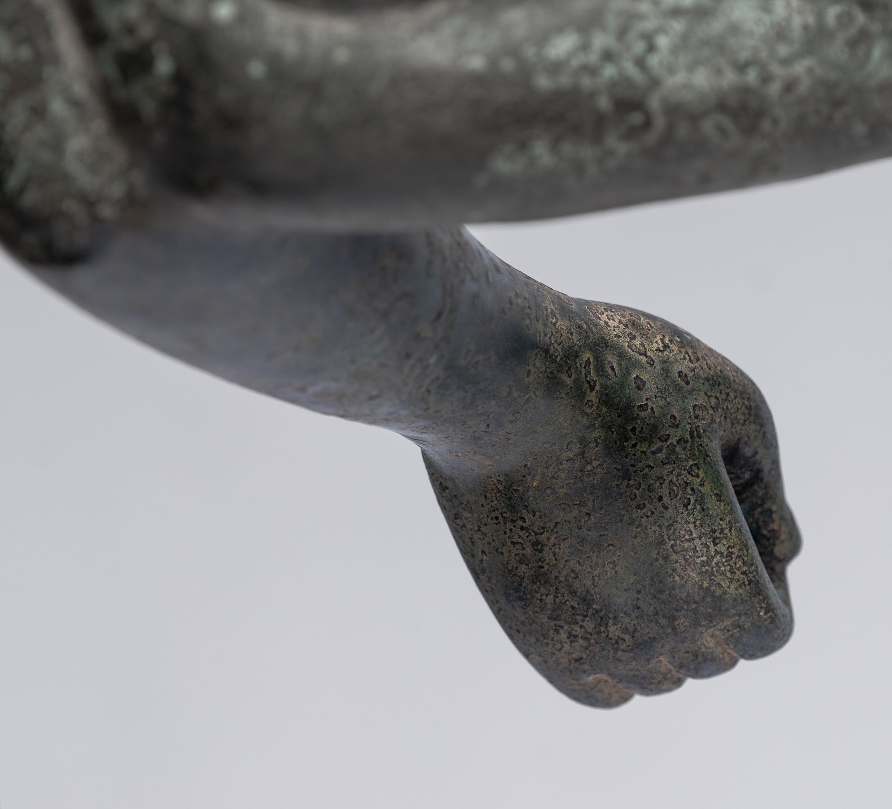 Here, Lokeshvara is standing in samapada with his arms radiating around him and clad in a short sampot with fishtail pleat and jeweled sash, the face with wide features surmounted by a cylindrical headdress adorned with a meditating Buddha.