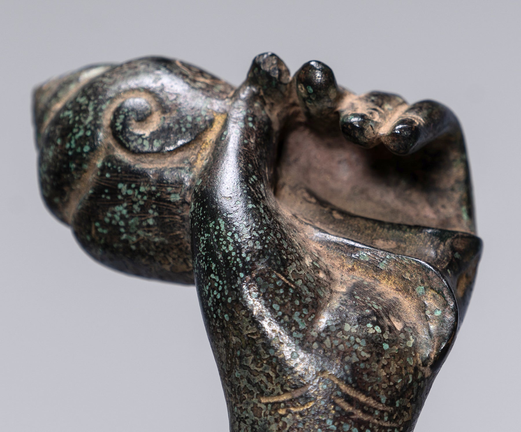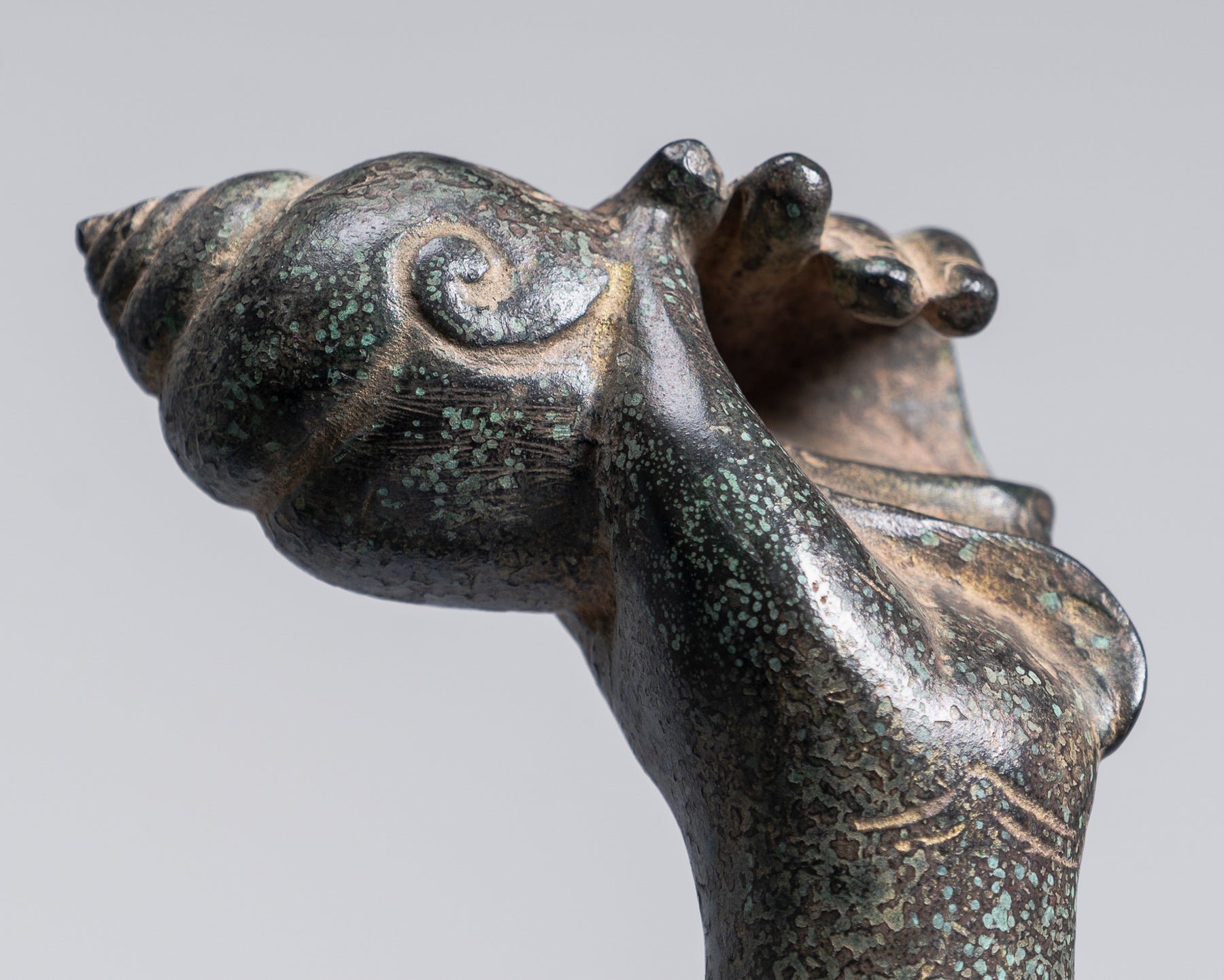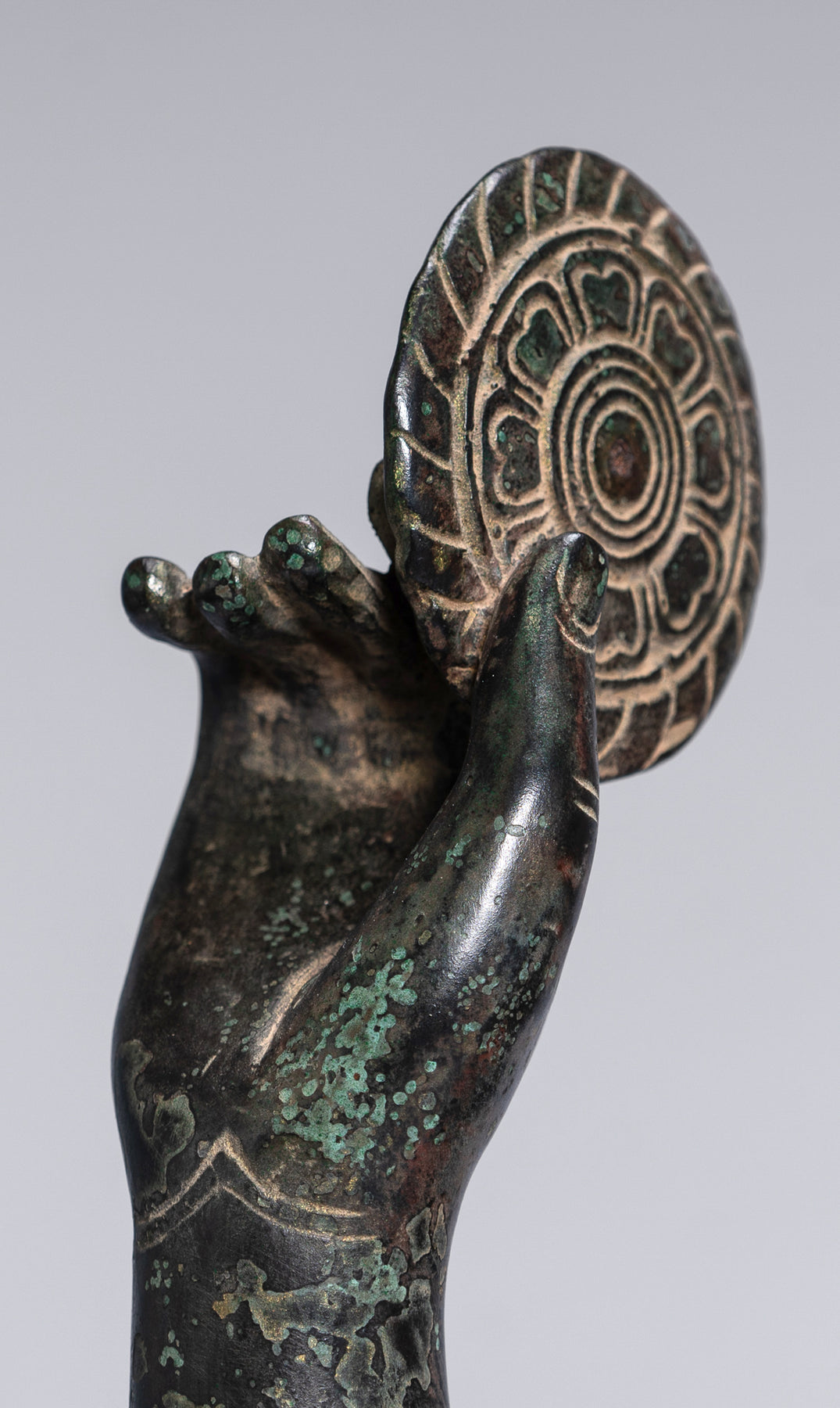 In his hands he holds a meditating Amitabha Buddha, chakra and various other items. His softly contoured face with indigenous characteristic has a serene downcast expression, with heavy-lidded eyes, arched eyebrows carved in relief meet in the middle above a well-shaped broad nose, and wide lips with an insipid smile are framed by a second incised line.
