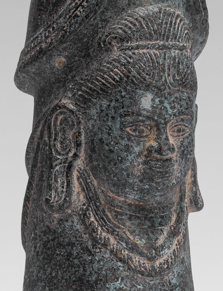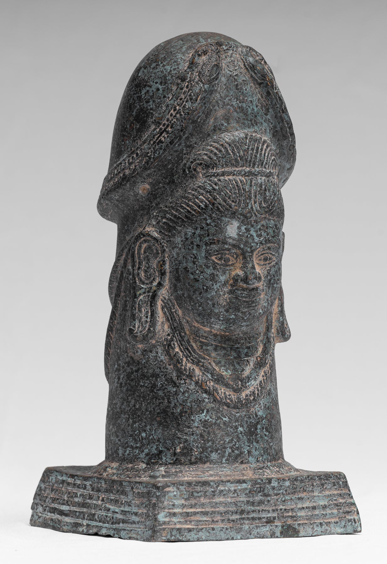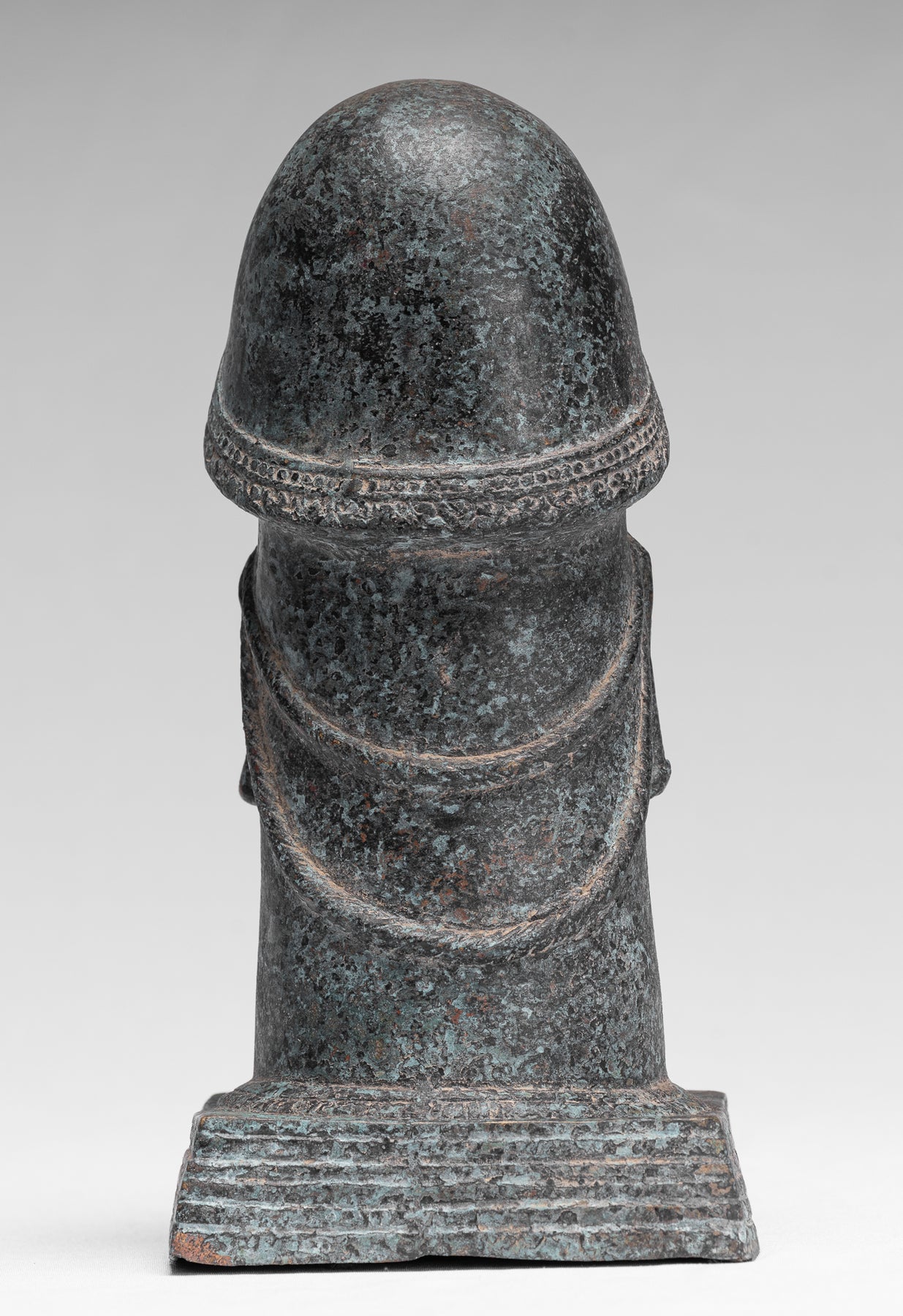 A fine quality antique Khmer style bronze linga showing the face of Shiva. A a symbol of fertility and energy it is an abstract or aniconic representation of the Hindu deity, Shiva. In traditional Indian society, the linga is rather seen as a symbol of the energy and potential of God, Shiva himself.