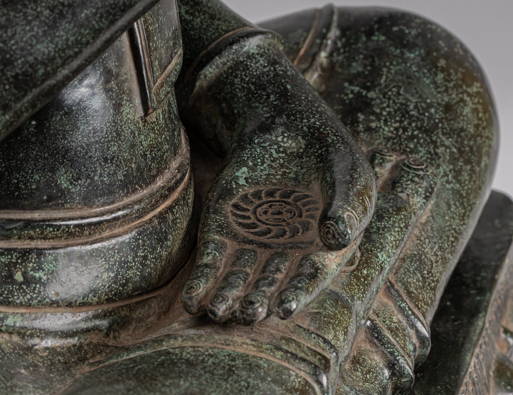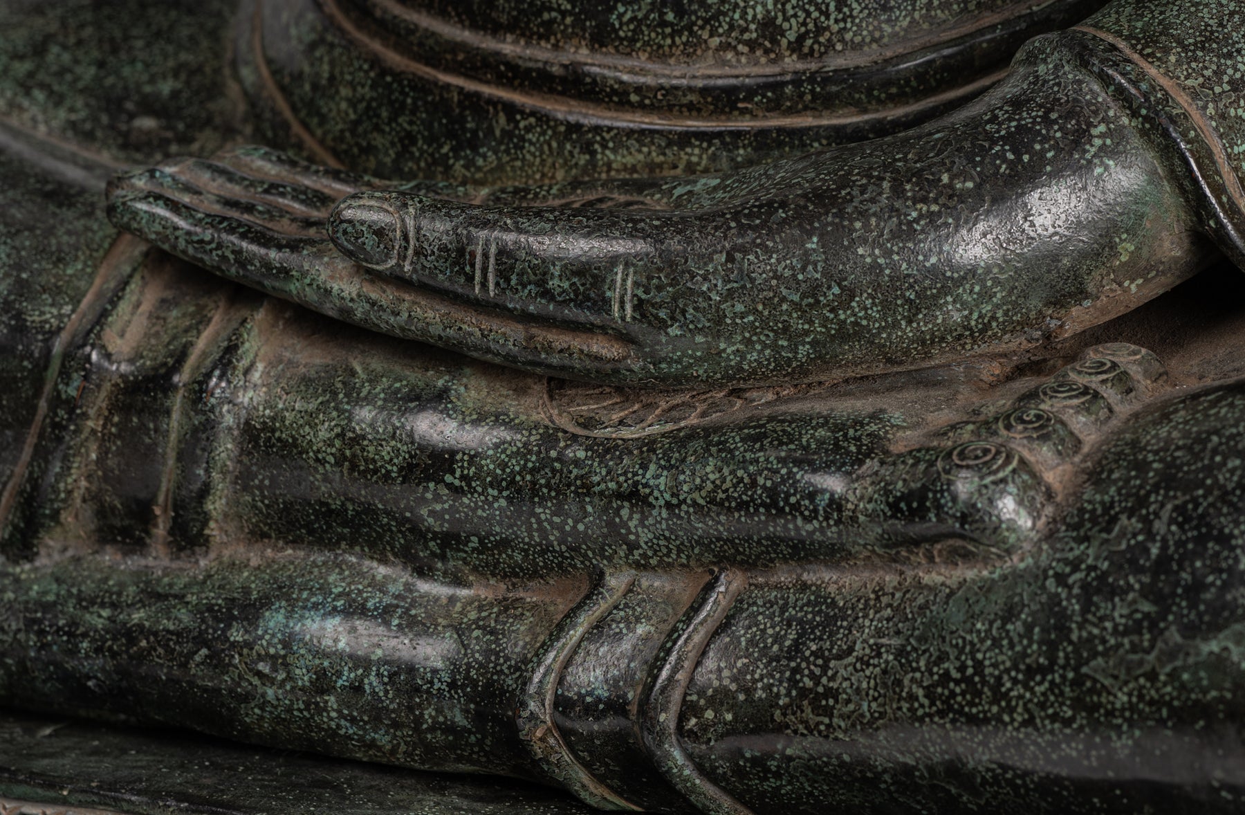Both hands of Buddha demonstrate a mandala, a symbol of meditation and serenity.