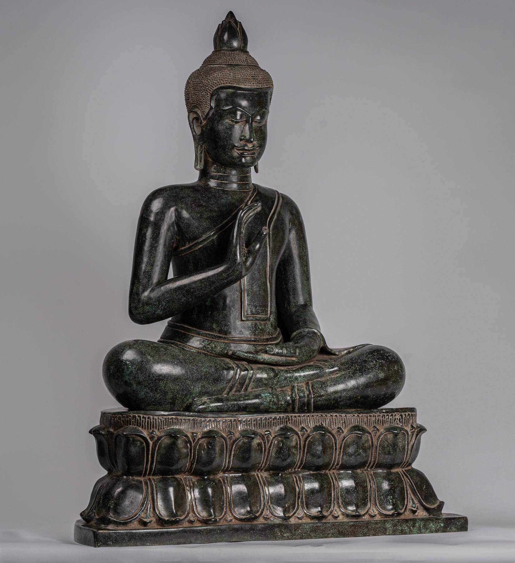 A stunning, large antique Khmer style seated and enthroned bronze Teaching Buddha statue. In typical, post-Angkor style the sculpture possesses a grandeur, at the same time, the statue is not submitted to strict iconographic norms, the statue loses its stiffness and becomes more human.
