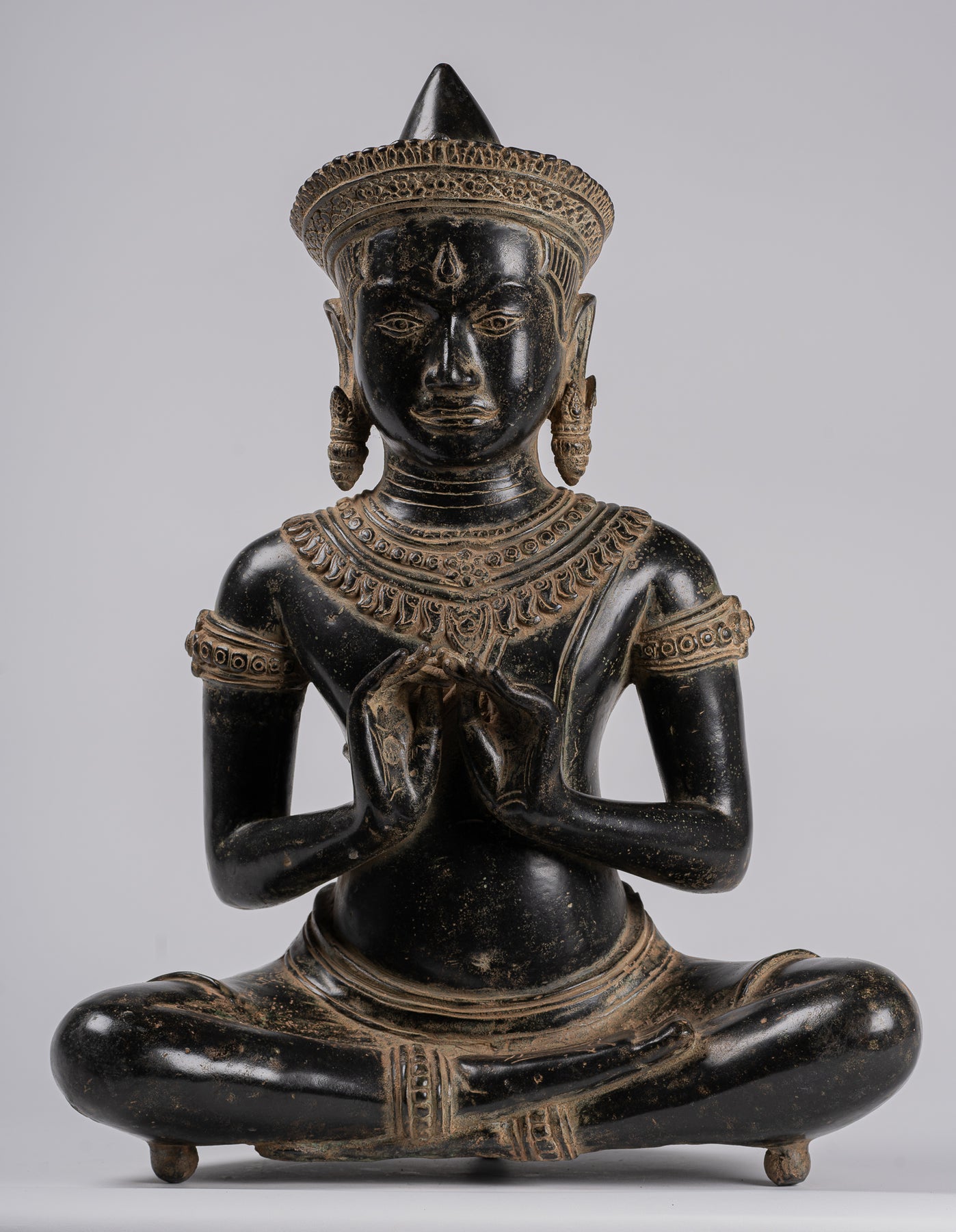 A serene antique Khmer style seated bronze Teaching Buddha statue. In typical, post-Angkor 13th century Bayon style the Buddha possesses a serenity, that confirms the divinity of Buddha, whilst lacking all ego.