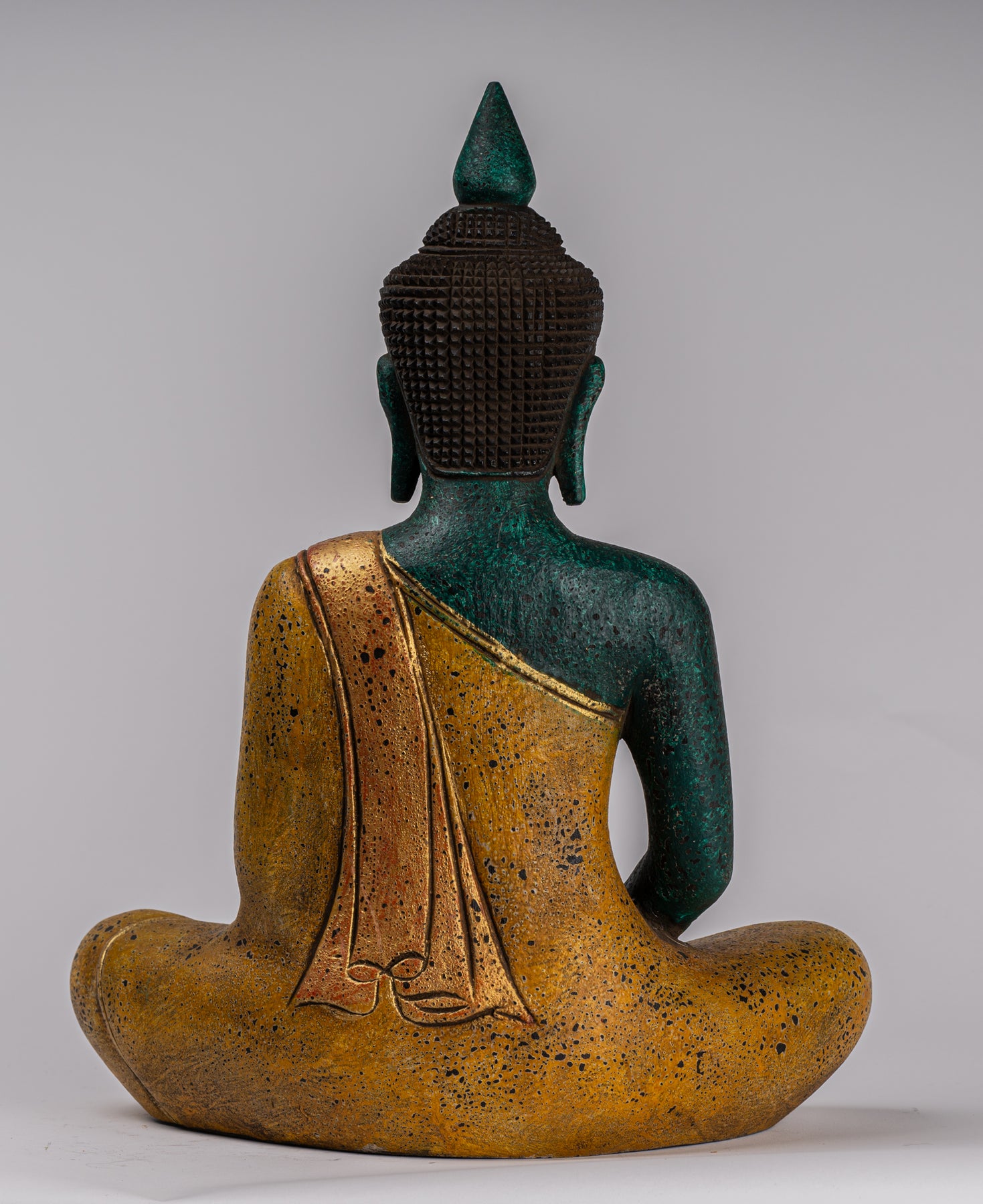 As is traditional, the Meditation Buddha is depicted here in a seated posture, with both legs crossed in the half-lotus position. The hands are placed in the Dhyana Mudra, where the right hand rests on top of the left hand, with the thumbs gently touching, forming a subtle triangle or circle. The Buddha's back is straight, and the gaze is lowered, signifying deep concentration and inner reflection.