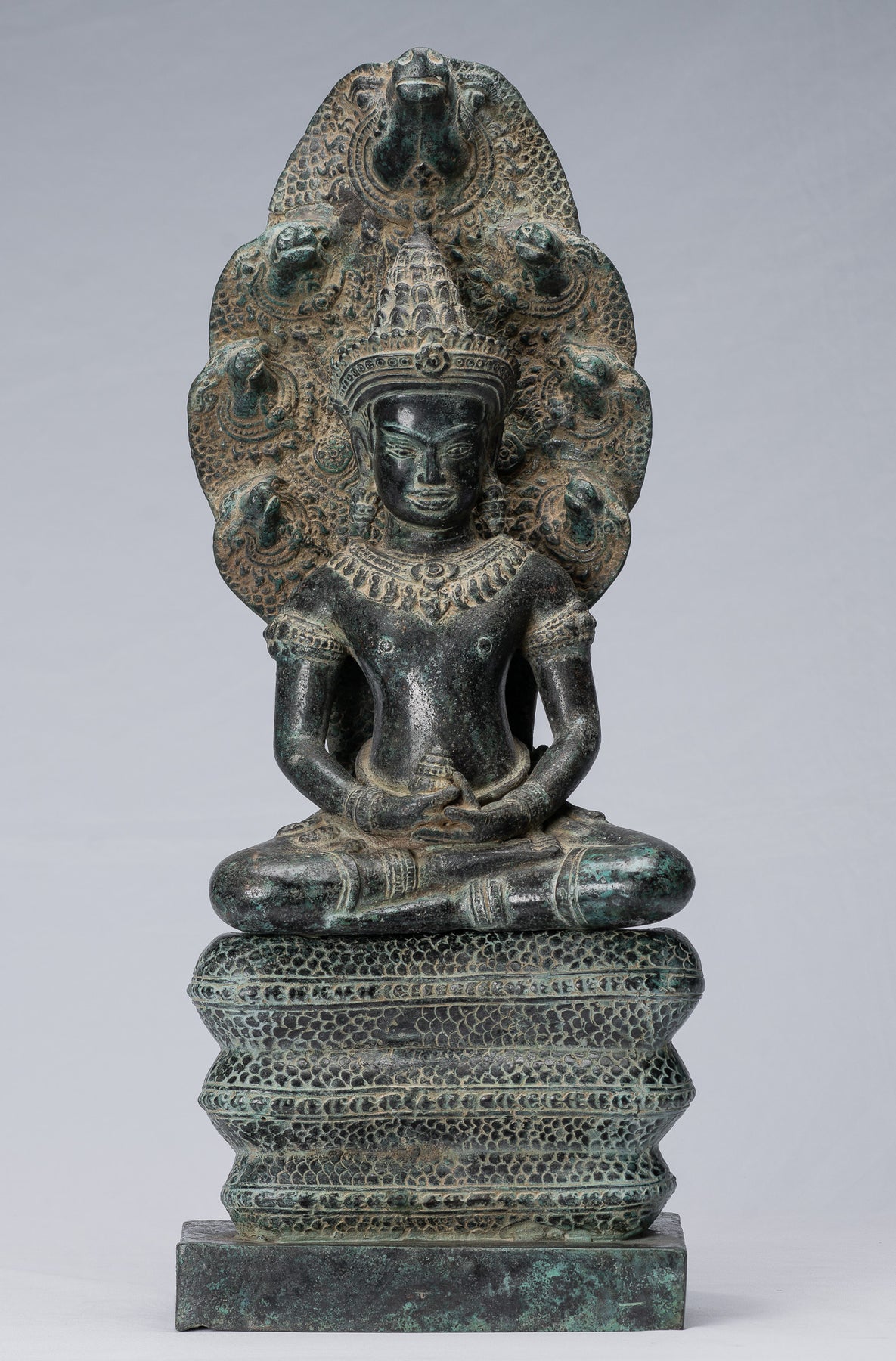 An antique Bayon style bronze Amitabha meditation Buddha, seated on a three-tired throne, with the flaring head of a giant Naga, the serpent King Muchalinda, rising behind protectively behind. His hands are in the Dhyana mudra, the gesture of Meditation.