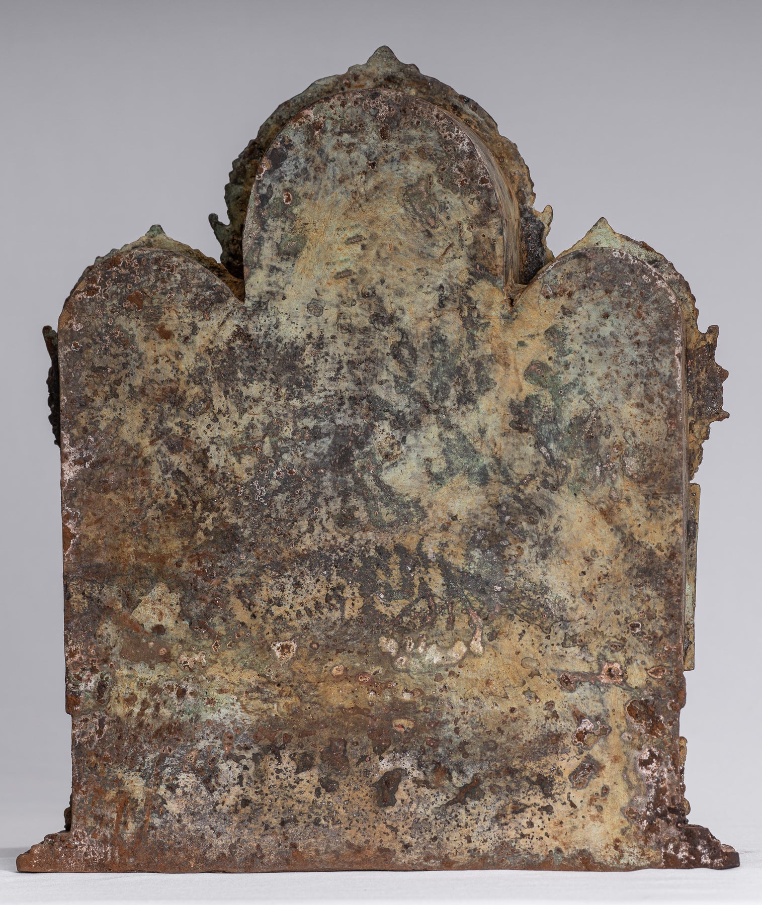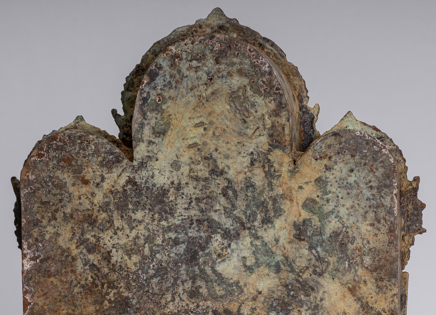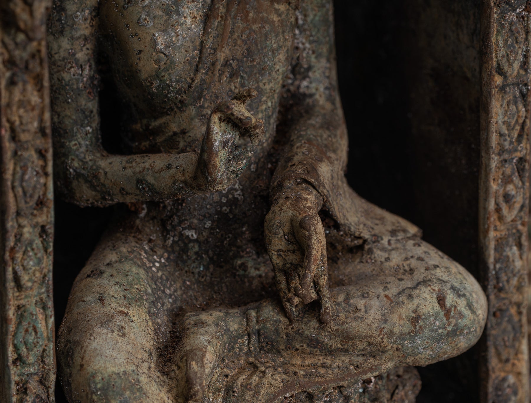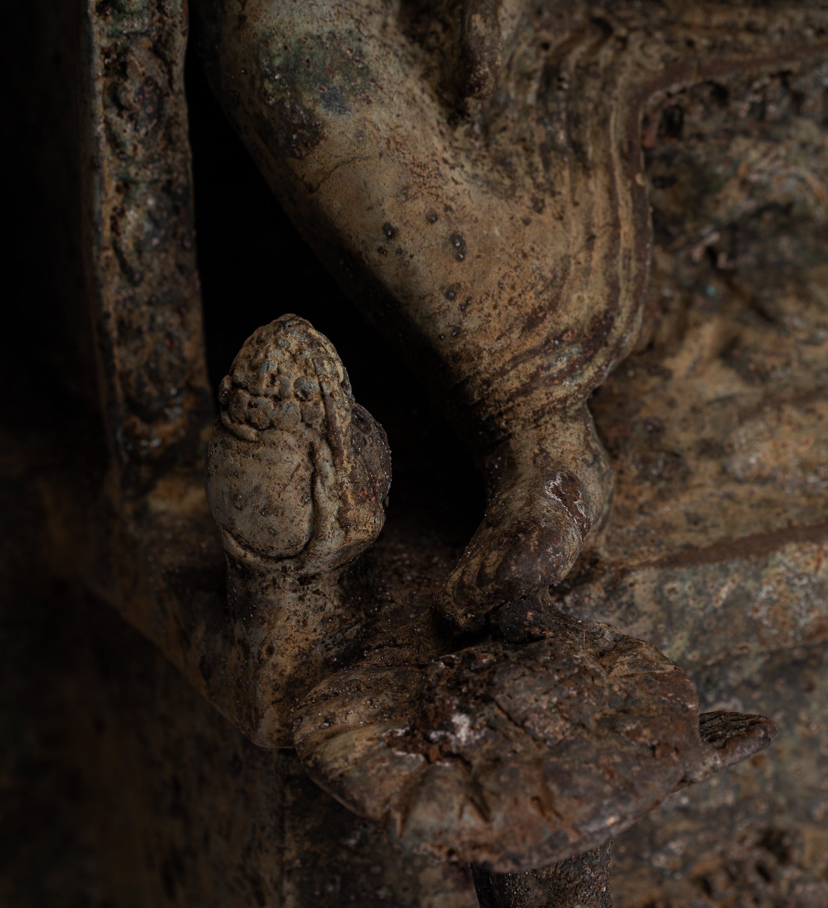 The Buddha is seated in the Teaching or Dharmachakra position. This mudra symbolises one of the most important moments in the life of Buddha, the occasion when he preached to his companions the first sermon after his Enlightenment in the Deer Park at Sarnath. It therefore denotes the setting into motion of the Wheel of the teaching of the Dharma. In this mudra the thumb and index finger touch at their tips to form a circle. This circle represents the Wheel of Dharma, or in metaphysical terms, the union of method and wisdom. This symbolises generosity. The detail and patina of the piece are delightful.