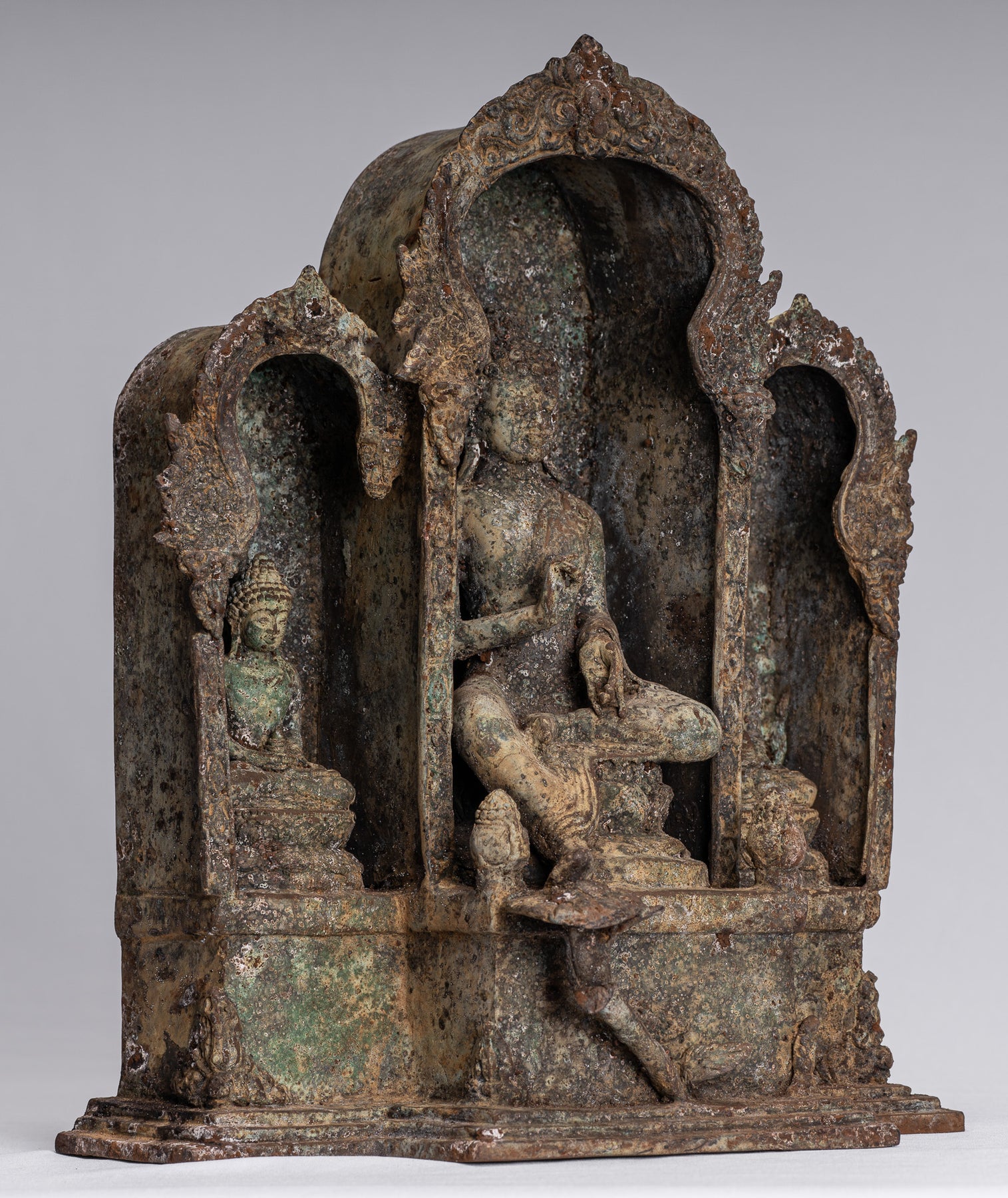 An Indonesian (Java) enthroned Teaching Buddha, surrounded by acolytes of Buddha in Meditation pose, in 13th century Majapahit style.